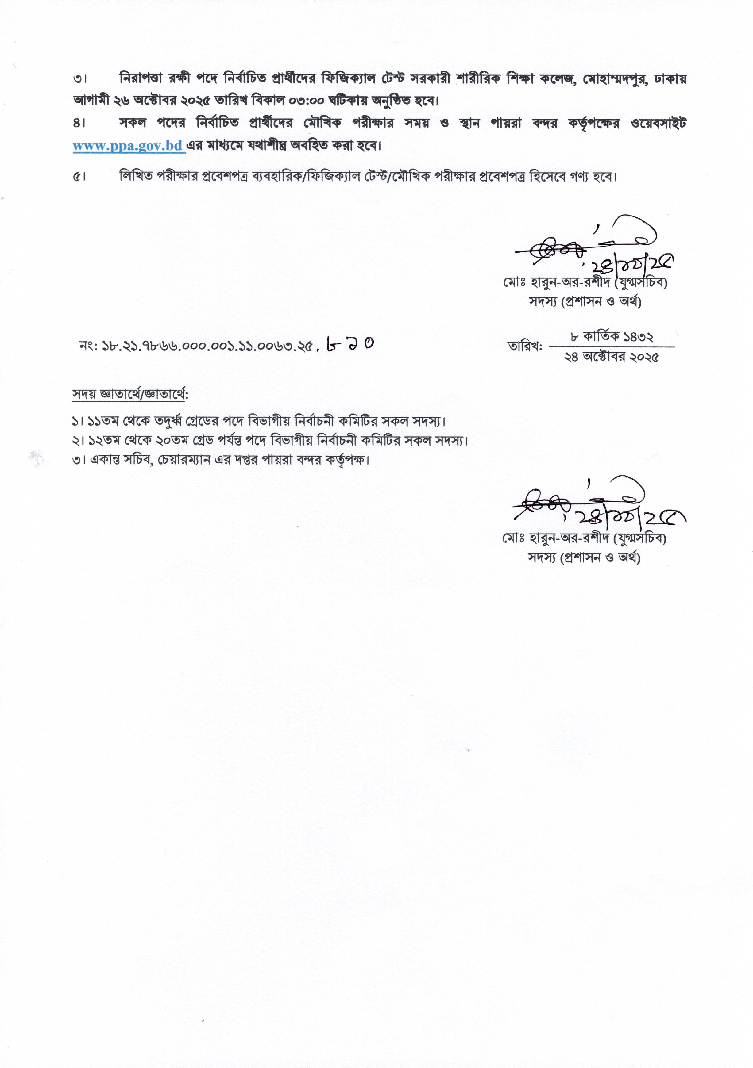 অন্যান্য সকল পদের নির্বাচিত প্রার্থীদের মৌখিক পরীক্ষার সময় ও স্থান পায়রা বন্দর কর্তৃপক্ষের ওয়েবসাইটে (www.pbc.gov.bd) যথাশীঘ্ব অবহিত করা হবে। লিখিত পরীক্ষার প্রবেশপত্র ব্যবহারিক/ফিজিক্যাল টেস্ট/মৌখিক পরীক্ষার প্রবেশপত্র হিসেবে গণ্য হবে।