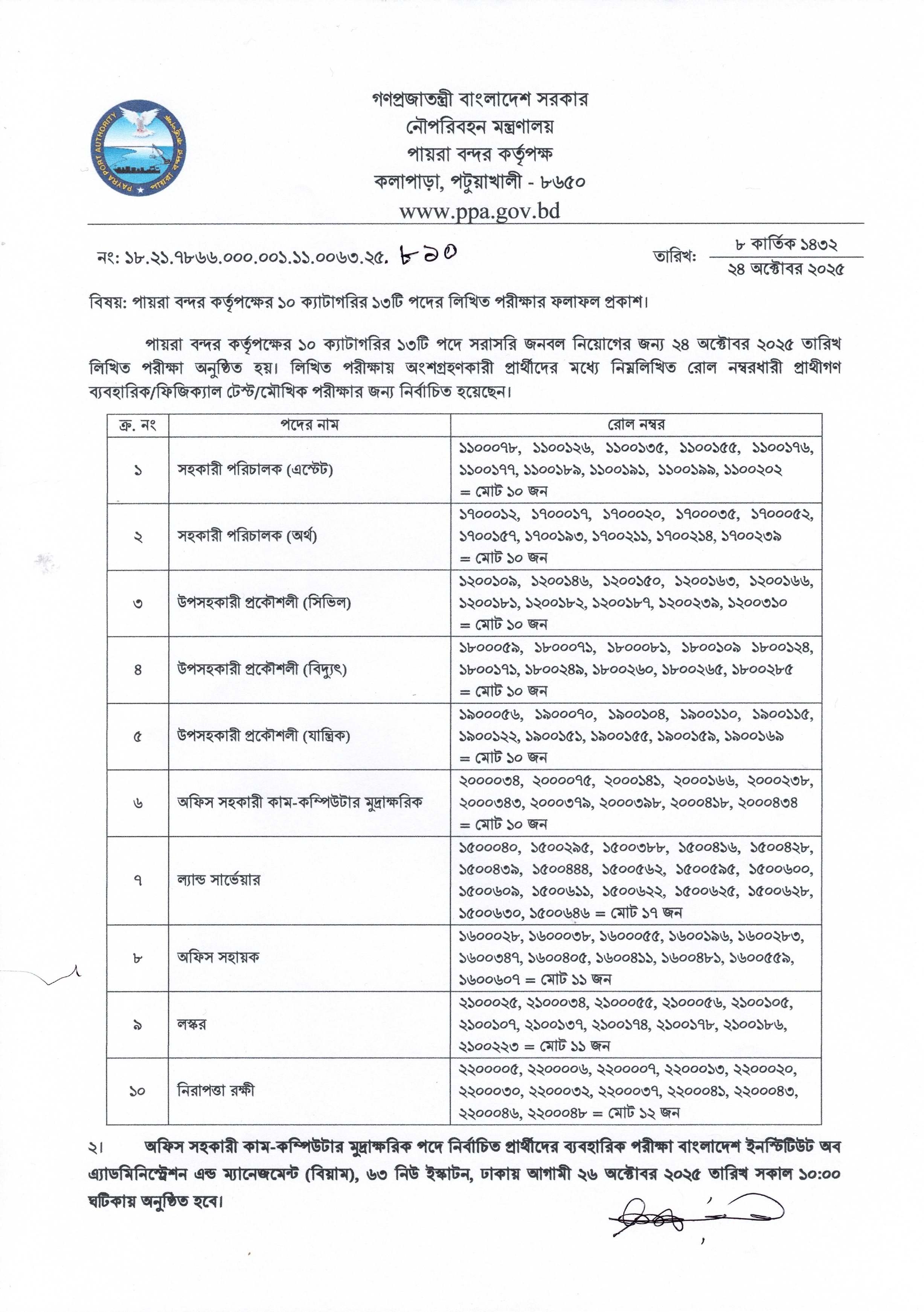 পায়রা বন্দর কর্তৃপক্ষ কর্তৃক ১০ ক্যাটাগরির ১৩টি পদের লিখিত পরীক্ষার ফলাফল প্রকাশিত হয়েছে। গত ২৪ অক্টোবর ২০২৫ তারিখে অনুষ্ঠিত লিখিত পরীক্ষায় অংশগ্রহণকারী প্রার্থীদের মধ্যে নির্বাচিতদের ব্যবহারিক/ফিজিক্যাল টেস্ট/মৌখিক পরীক্ষার জন্য মনোনীত করা হয়েছে।