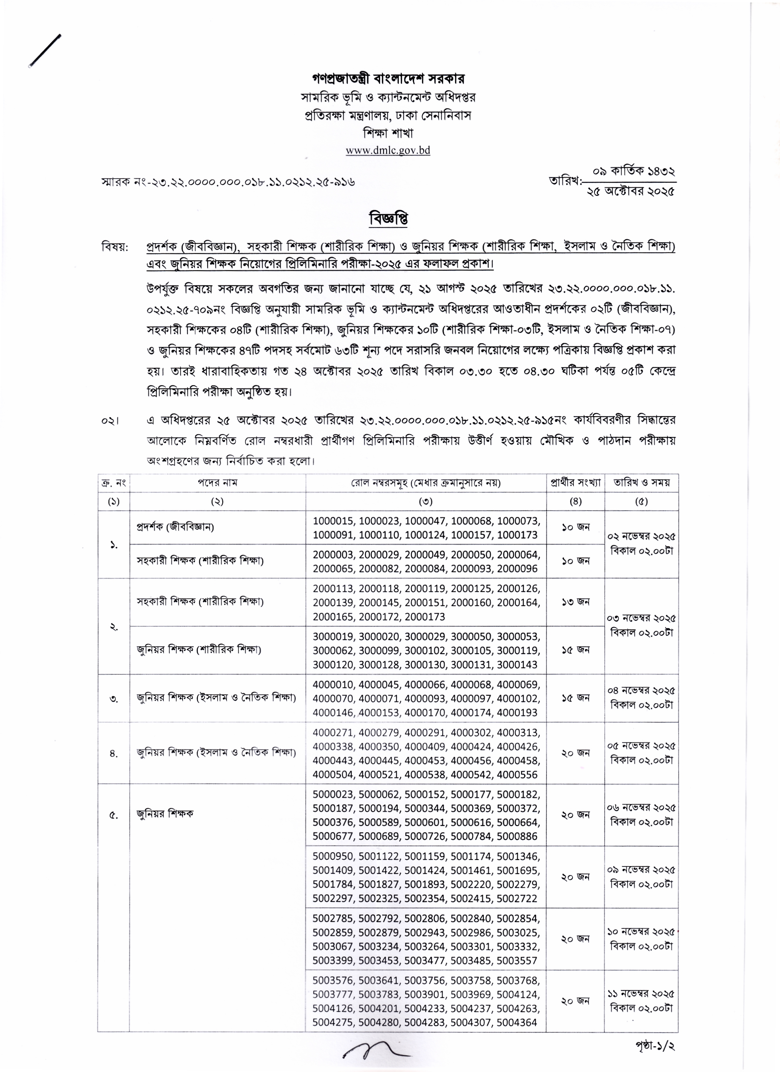 সামরিক ভূমি ও ক্যান্টনমেন্ট অধিদপ্তর কর্তৃক প্রদর্শক (জীববিজ্ঞান), সহকারী শিক্ষক (শারীরিক শিক্ষা), জুনিয়র শিক্ষক (শারীরিক শিক্ষা), জুনিয়র শিক্ষক (ইসলাম ও নৈতিক শিক্ষা) এবং জুনিয়র শিক্ষক পদে সর্বমোট ৬৩ জনবল নিয়োগের লক্ষ্যে অনুষ্ঠিত প্রিলিমিনারি পরীক্ষার ফলাফল প্রকাশ করা হয়েছে।