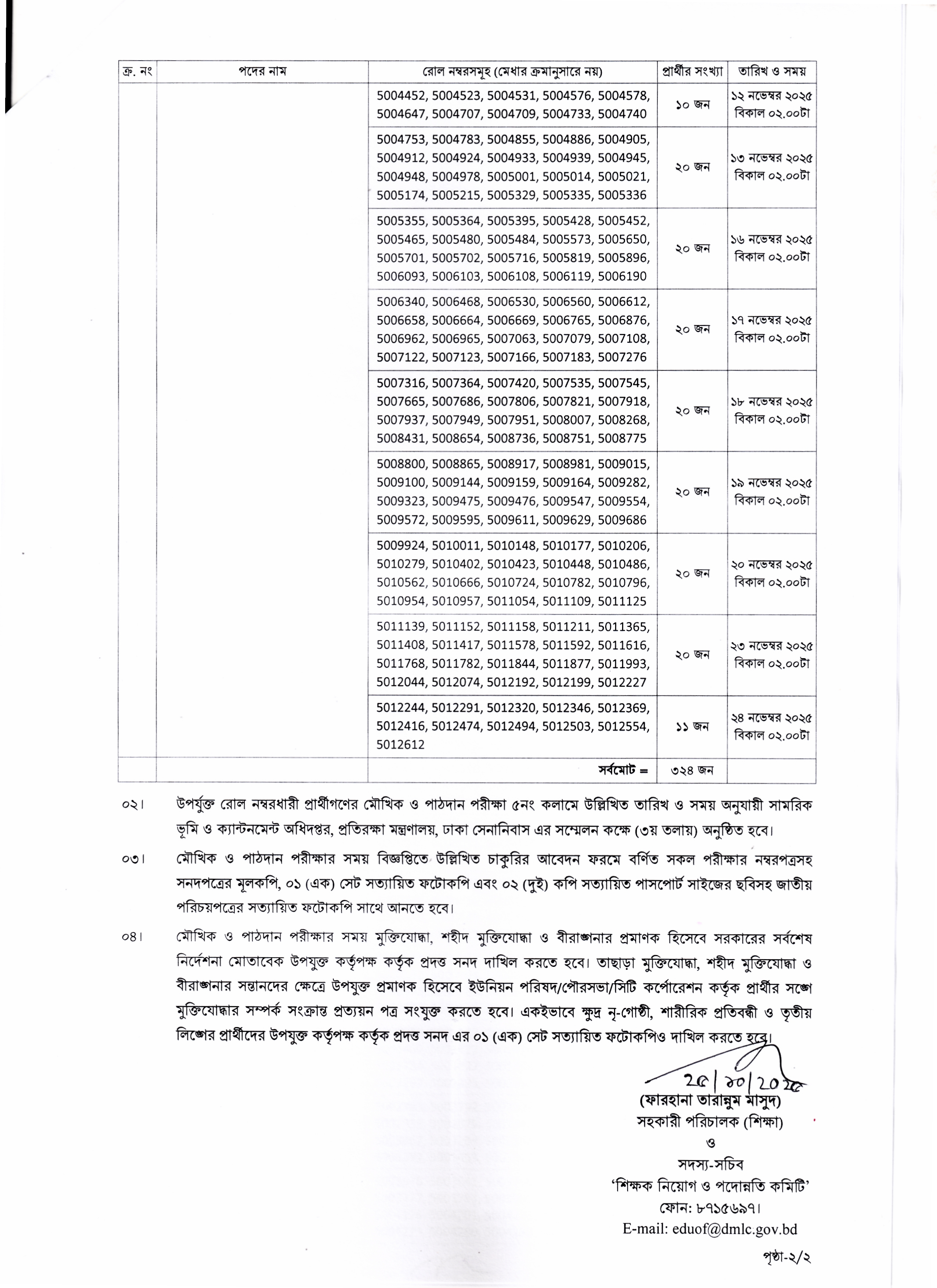 মৌখিক ও পাঠদান পরীক্ষার তারিখ ও নির্বাচিত প্রার্থীর সংখ্যা: