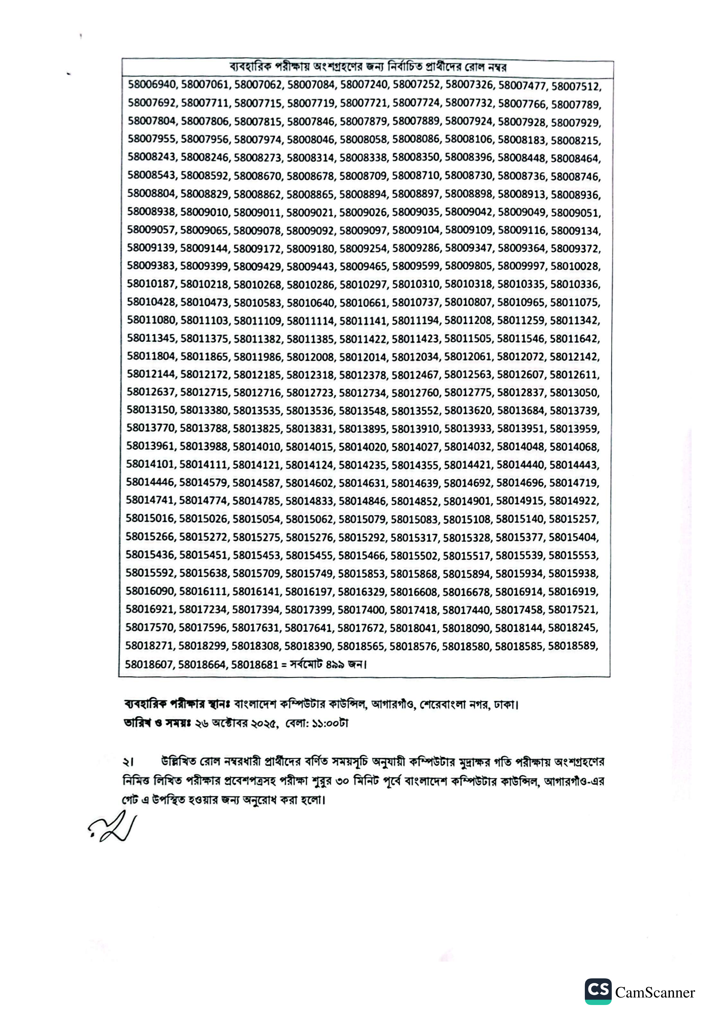 ব্যবহারিক পরীক্ষায় অংশগ্রহণের জন্য নির্বাচিত প্রার্থীদের লিখিত পরীক্ষার প্রবেশপত্র সহ পরীক্ষা শুরুর ৩০ মিনিট পূর্বে উল্লেখিত স্থানে উপস্থিত হতে অনুরোধ করা হয়েছে। নির্বাচিত প্রার্থীদের রোল নম্বর মূল বিজ্ঞপ্তিতে সংযুক্ত আছে।
