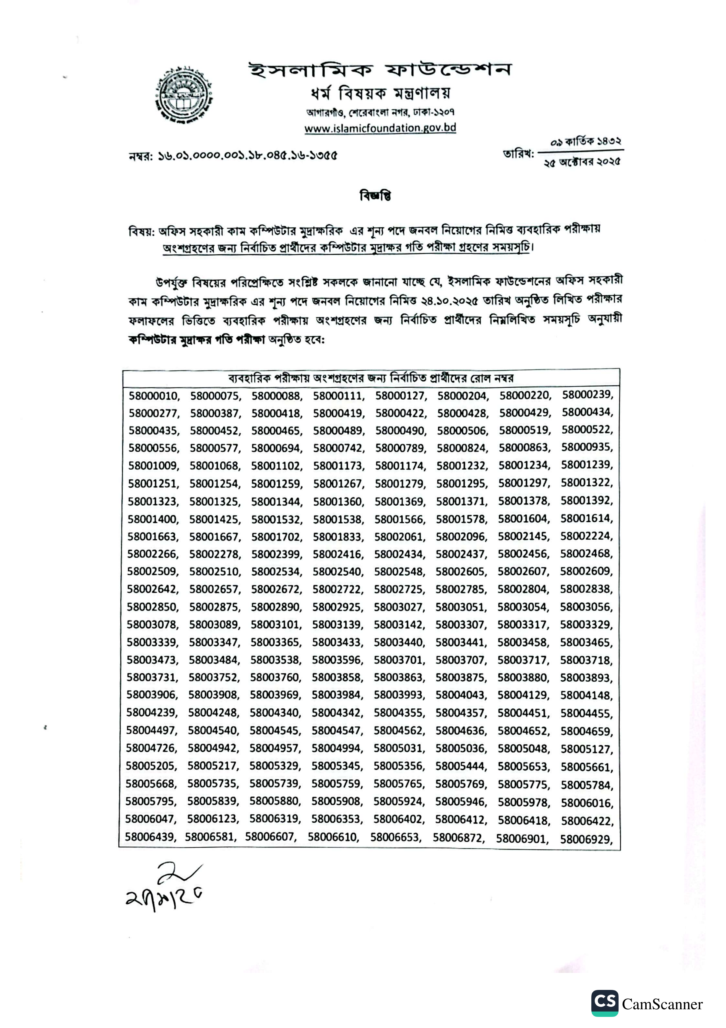 ইসলামিক ফাউন্ডেশনের অফিস সহকারী কাম কম্পিউটার মুদ্রাক্ষরিক শূন্য পদে জনবল নিয়োগের লক্ষ্যে অনুষ্ঠিত লিখিত পরীক্ষার ফলাফলের ভিত্তিতে ব্যবহারিক পরীক্ষায় অংশগ্রহণের জন্য নির্বাচিত প্রার্থীদের কম্পিউটার মুদ্রাক্ষর গতি পরীক্ষার সময়সূচি ঘোষণা করা হয়েছে।