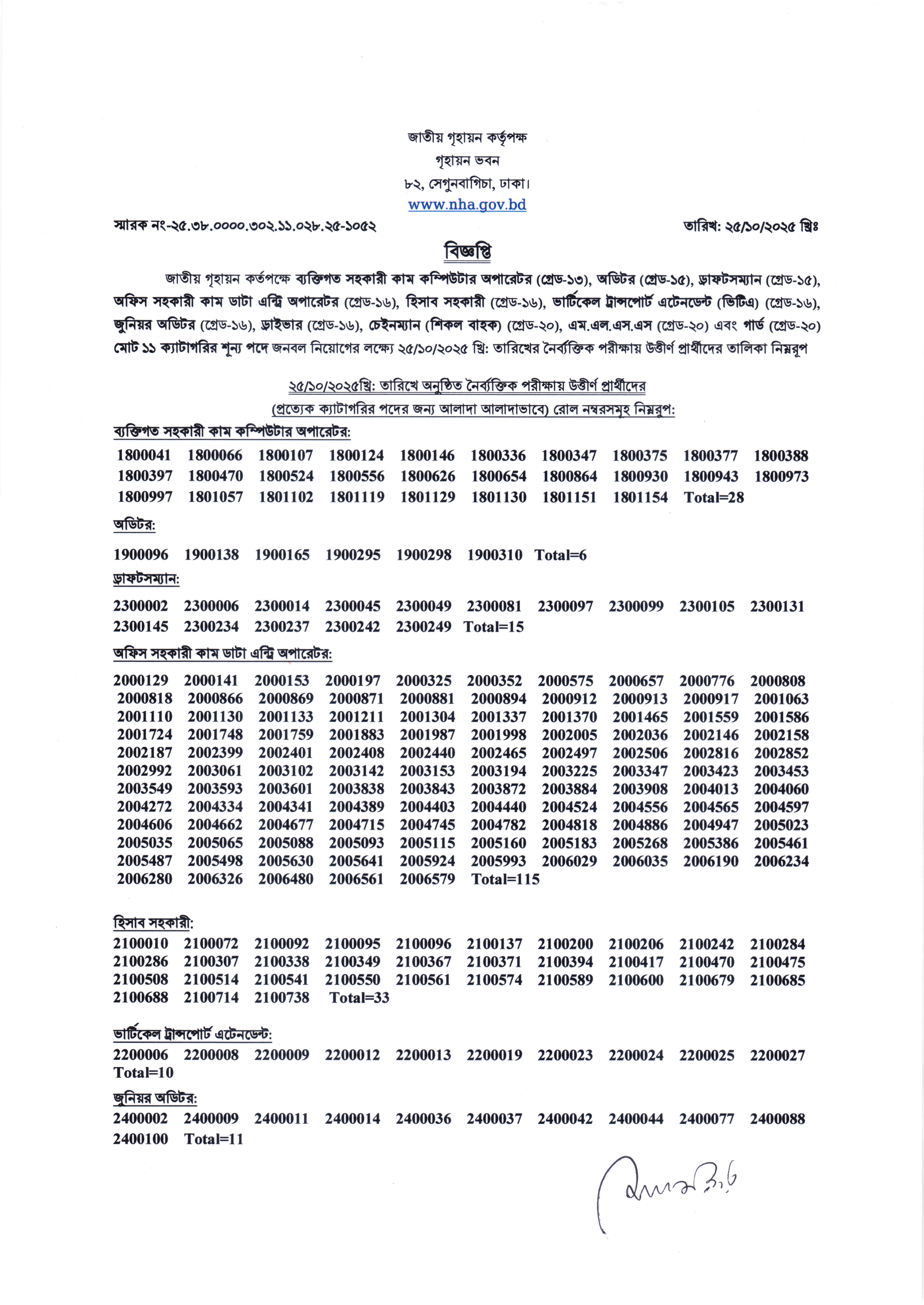 জাতীয় গৃহায়ন কর্তৃপক্ষের ১১ ক্যাটাগরির বিভিন্ন শূন্য পদে জনবল নিয়োগের লক্ষ্যে গত ২৫/১০/২০২৫ খ্রি: তারিখে অনুষ্ঠিত নৈর্ব্যক্তিক পরীক্ষার ফলাফল প্রকাশ করা হয়েছে।