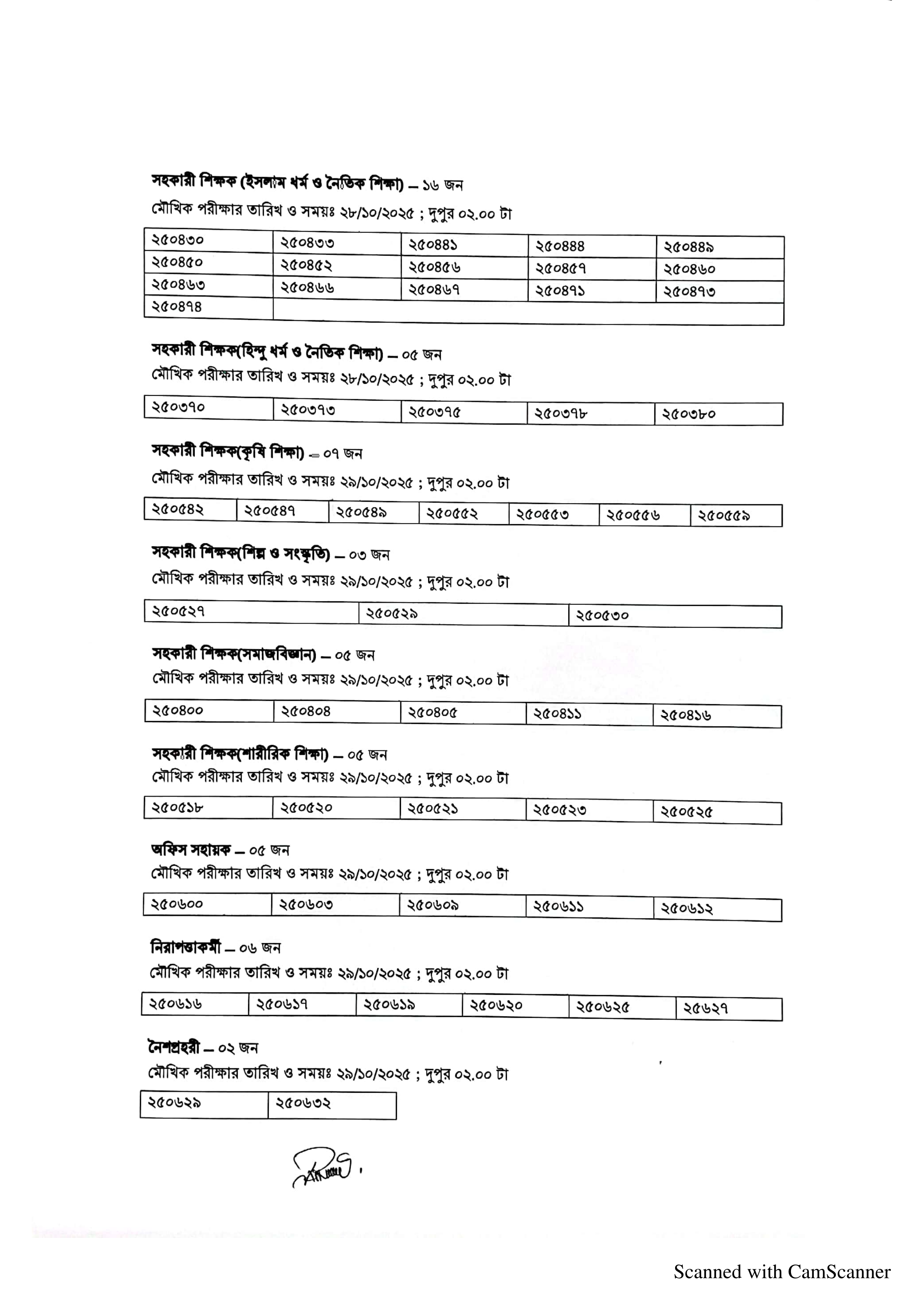 - সহকারী শিক্ষক (গার্হস্থ্য বিজ্ঞান) (০৫ জন): ২৭/১০/২০২৫, দুপুর ০২.০০ টা