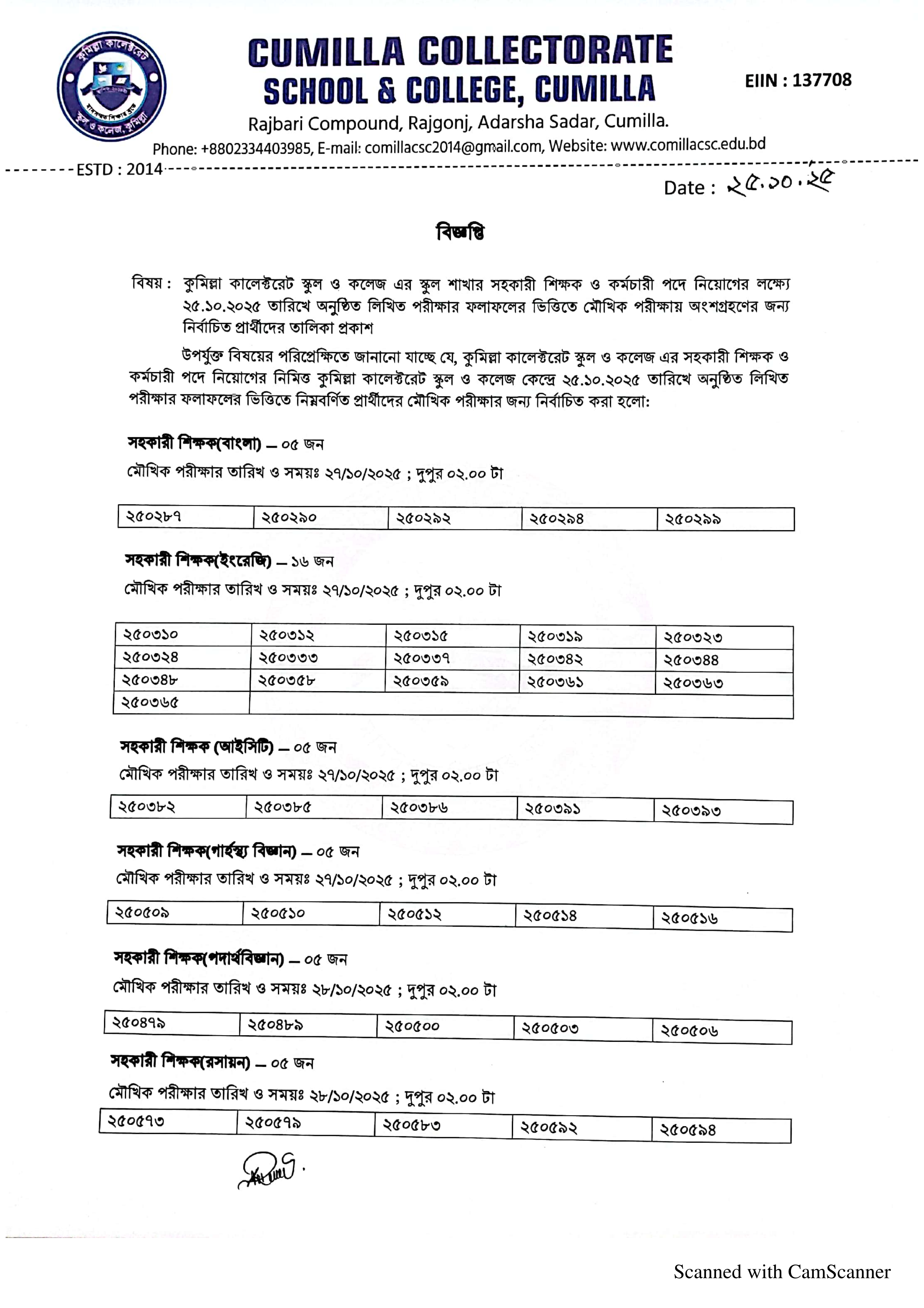 কুমিল্লা কালেক্টরেট স্কুল ও কলেজের সহকারী শিক্ষক ও কর্মচারী পদে নিয়োগের জন্য গত ২৫.১০.২০২৫ তারিখে অনুষ্ঠিত লিখিত পরীক্ষার ফলাফলের ভিত্তিতে মৌখিক পরীক্ষার জন্য নির্বাচিত প্রার্থীদের তালিকা প্রকাশ করা হয়েছে।