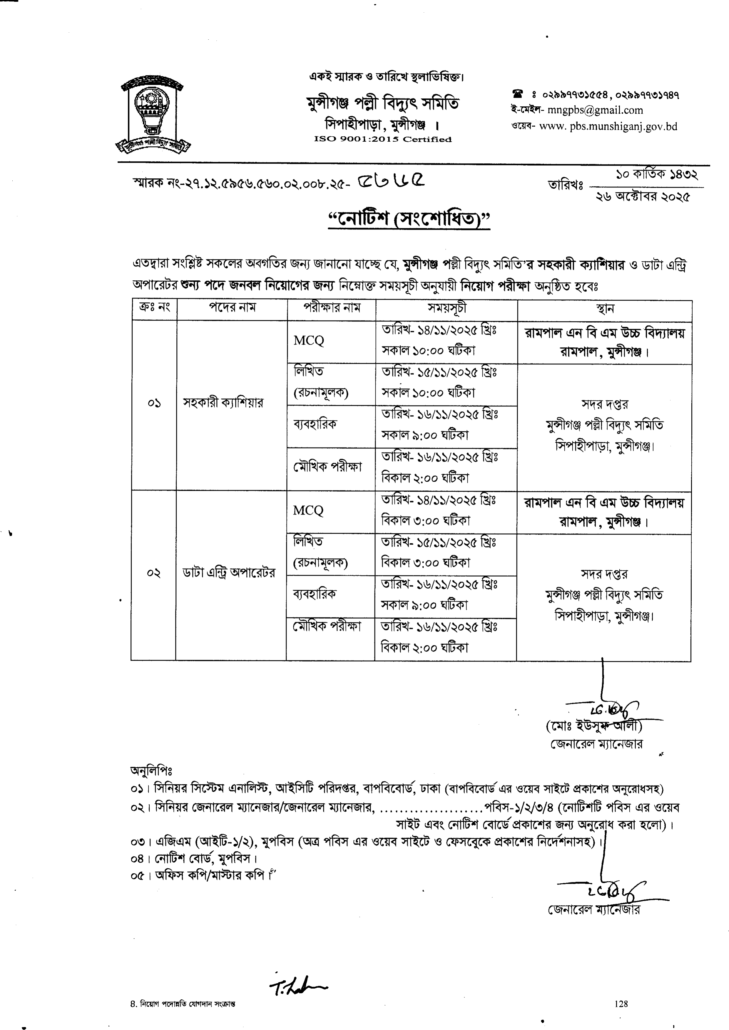 - মৌখিক পরীক্ষা: তারিখ- ১৬/১১/২০২৫ খ্রিঃ, সময়- বিকাল ২:০০ ঘটিকা। স্থান- দপ্তর, মুন্সীগঞ্জ পল্লী বিদ্যুৎ সমিতি, সিপাহীপাড়া, মুন্সীগঞ্জ।
