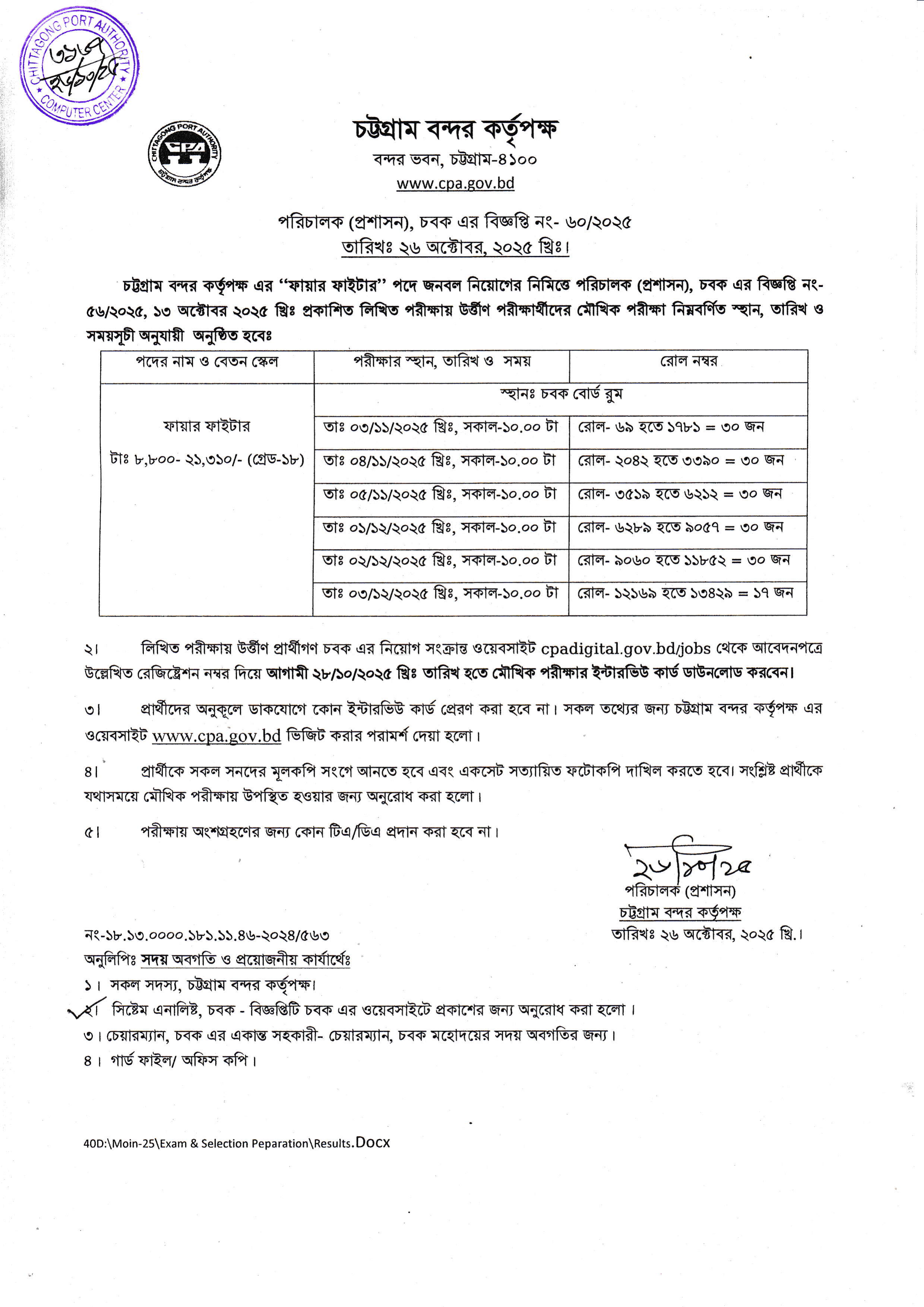 লিখিত পরীক্ষায় উত্তীর্ণ পরীক্ষার্থীরা ২৮/১০/২০২৫ খ্রিঃ তারিখ হতে চট্টগ্রাম বন্দর কর্তৃপক্ষের নিয়োগ সংক্রান্ত ওয়েবসাইট (chittagongport.portal.gov.bd/site/recruitment) থেকে আবেদনপত্রে উল্লিখিত রেজিষ্ট্রেশন নম্বর দিয়ে মৌখিক পরীক্ষার ইন্টারভিউ কার্ড ডাউনলোড করতে পারবেন। প্রার্থীদের অনুকূলে ডাকযোগে কোনো ইন্টারভিউ কার্ড প্রেরণ করা হবে না।
