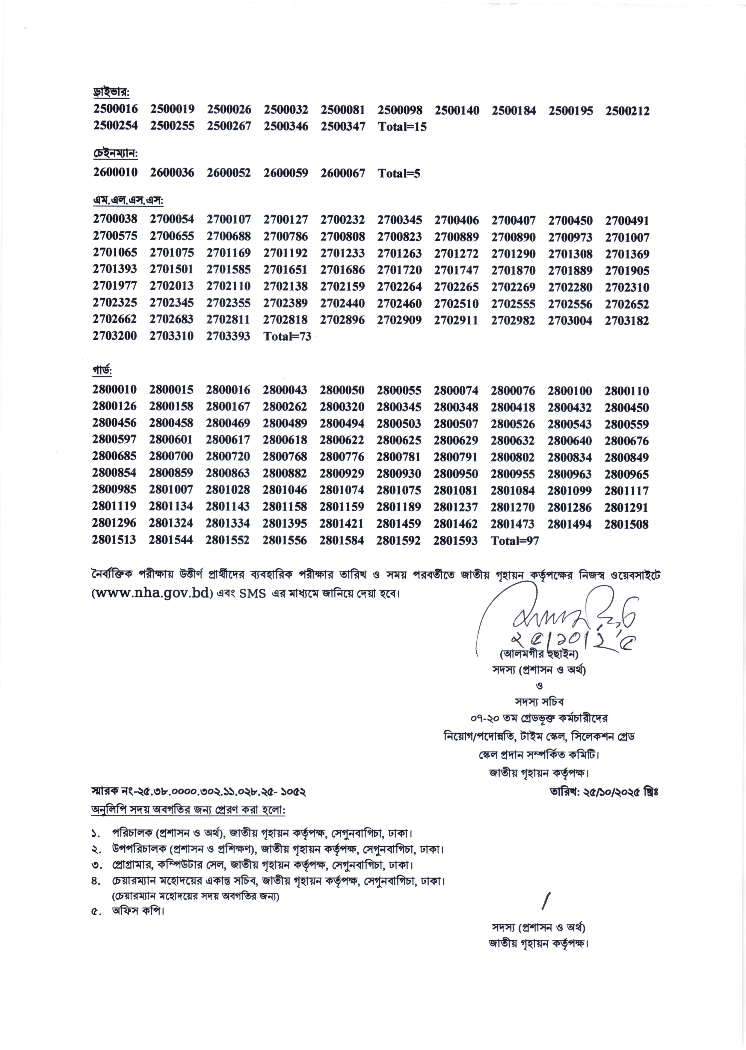 উত্তীর্ণ প্রার্থীদের ব্যবহারিক পরীক্ষার তারিখ, সময় ও স্থান পরবর্তীতে জাতীয় গৃহায়ন কর্তৃপক্ষের নিজস্ব ওয়েবসাইট (nha.gov.bd) এবং SMS এর মাধ্যমে জানিয়ে দেওয়া হবে।