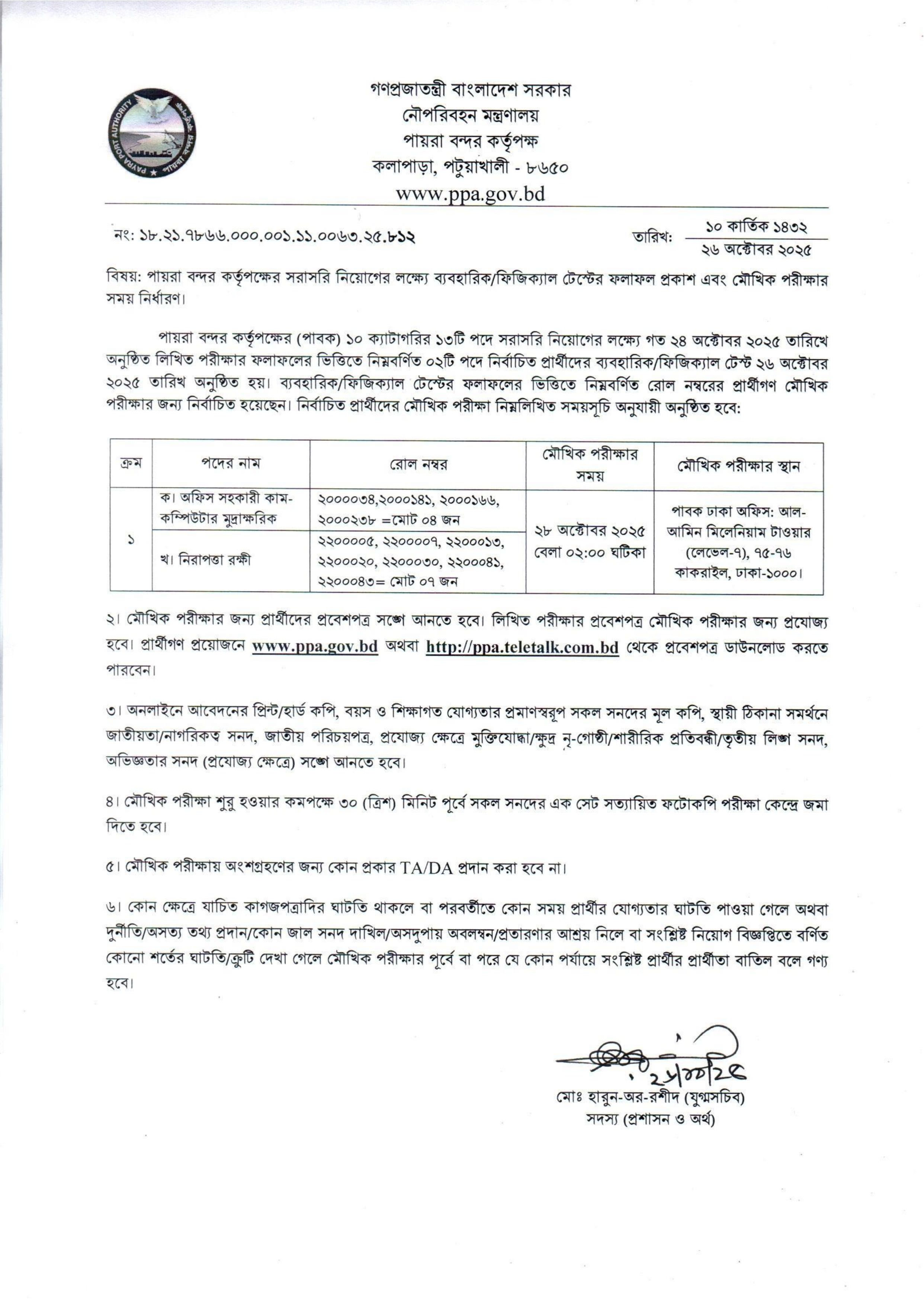 পায়রা বন্দর কর্তৃপক্ষ কর্তৃক সরাসরি নিয়োগের লক্ষ্যে অনুষ্ঠিত ব্যবহারিক (ফিজিক্যাল) পরীক্ষার ফলাফল প্রকাশিত হয়েছে এবং মৌখিক পরীক্ষার সময়সূচি ঘোষণা করা হয়েছে।
