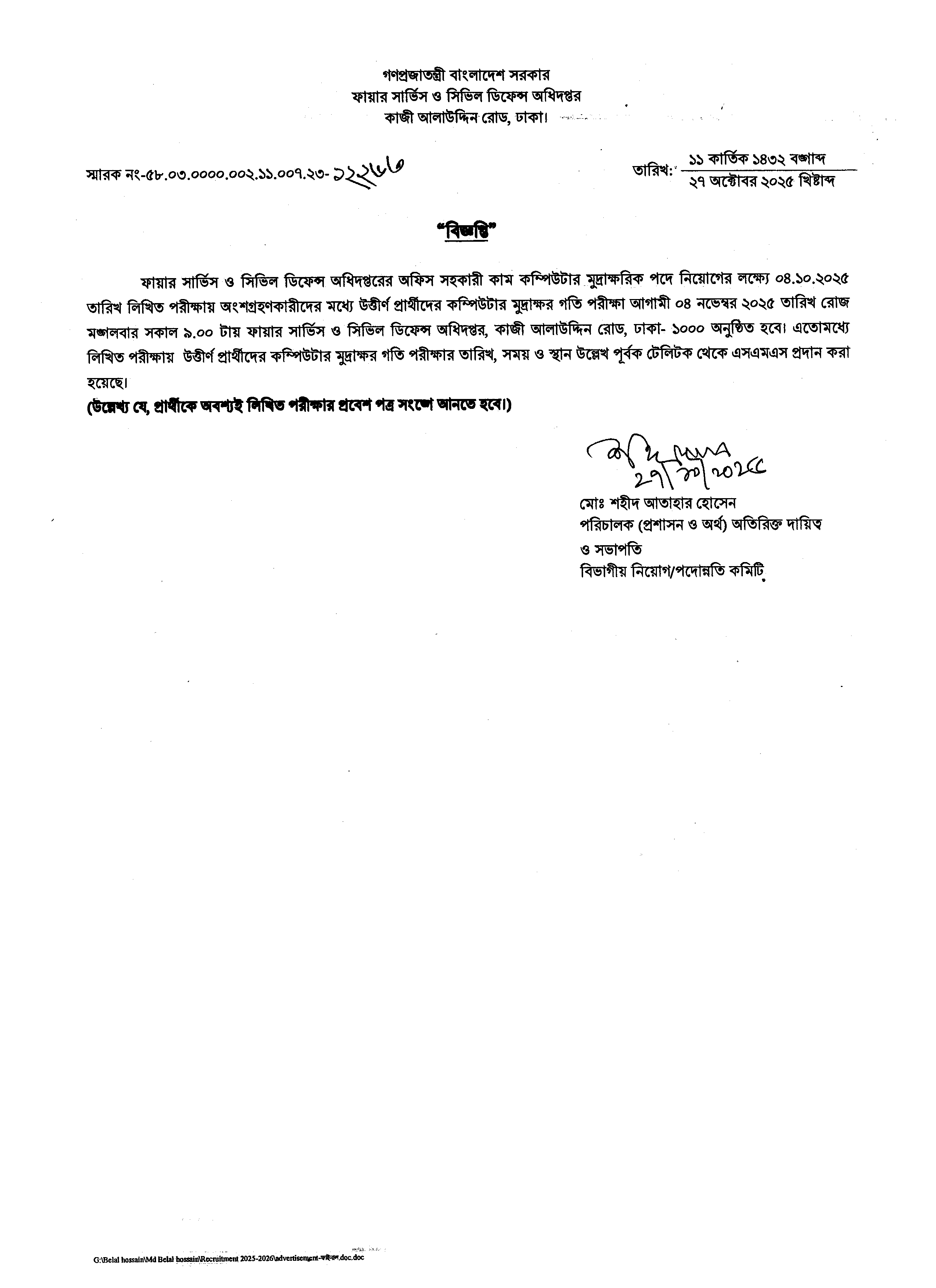 ফায়ার সার্ভিস ও সিভিল ডিফেন্স অধিদপ্তরের অফিস সহকারী কাম কম্পিউটার মুদ্রাক্ষরিক পদে নিয়োগের জন্য ০৪ অক্টোবর ২০২৫ তারিখে অনুষ্ঠিত লিখিত পরীক্ষায় উত্তীর্ণ প্রার্থীদের কম্পিউটার মুদ্রাক্ষর গতি পরীক্ষার সময়সূচী ঘোষণা করা হয়েছে।
