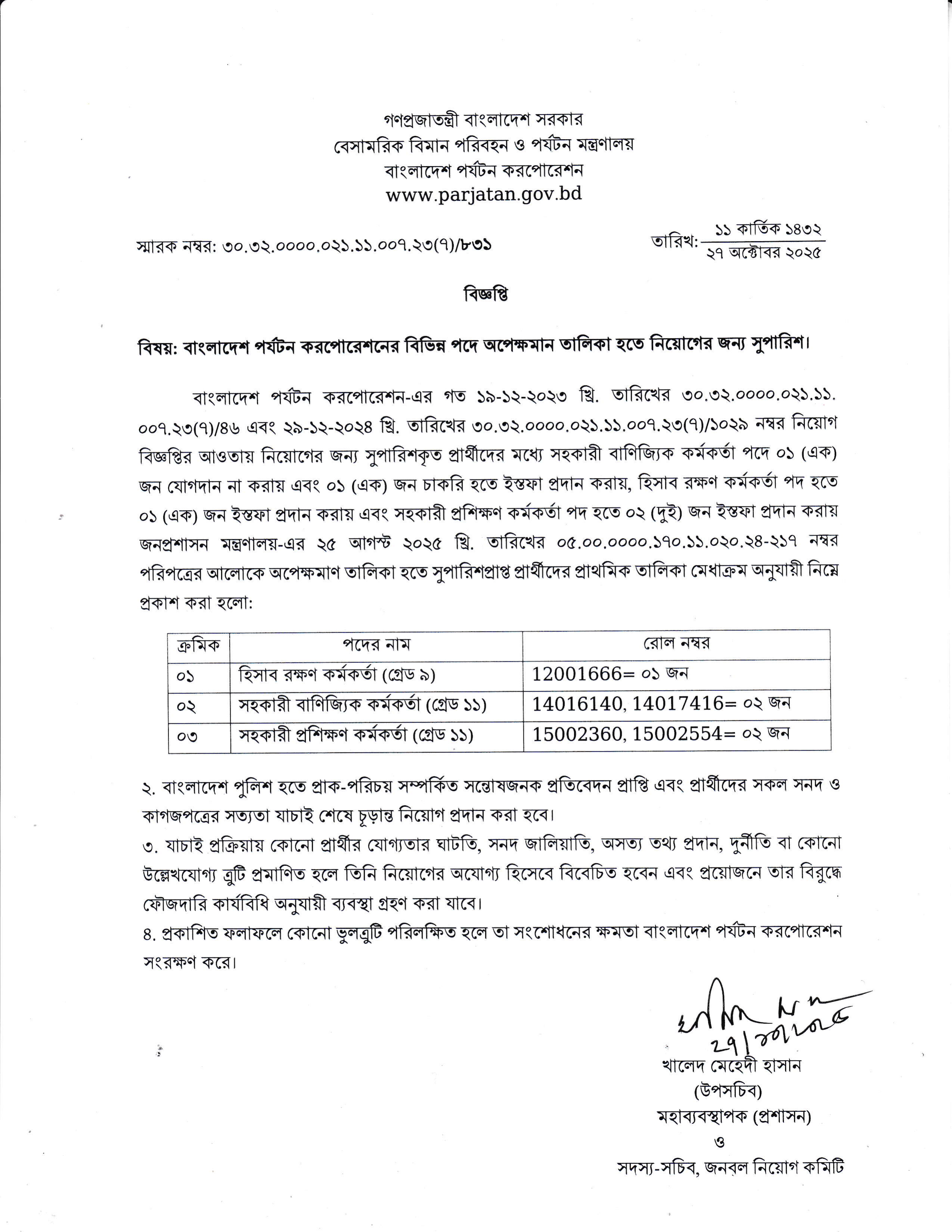 বাংলাদেশ পর্যটন করপোরেশন তাদের বিভিন্ন পদে অপেক্ষমান তালিকা থেকে নিয়োগের জন্য সুপারিশকৃত প্রার্থীদের তালিকা প্রকাশ করেছে। পূর্বে সুপারিশকৃত প্রার্থীদের মধ্যে সহকারী বাণিজ্যিক কর্মকর্তা পদে ০২ জন, হিসাব রক্ষণ কর্মকর্তা পদে ০১ জন এবং সহকারী প্রশিক্ষণ কর্মকর্তা পদে ০২ জন যোগদান না করা বা চাকরি থেকে ইস্তফা দেওয়ায় শূন্য হওয়া পদে এই সুপারিশ করা হয়েছে।