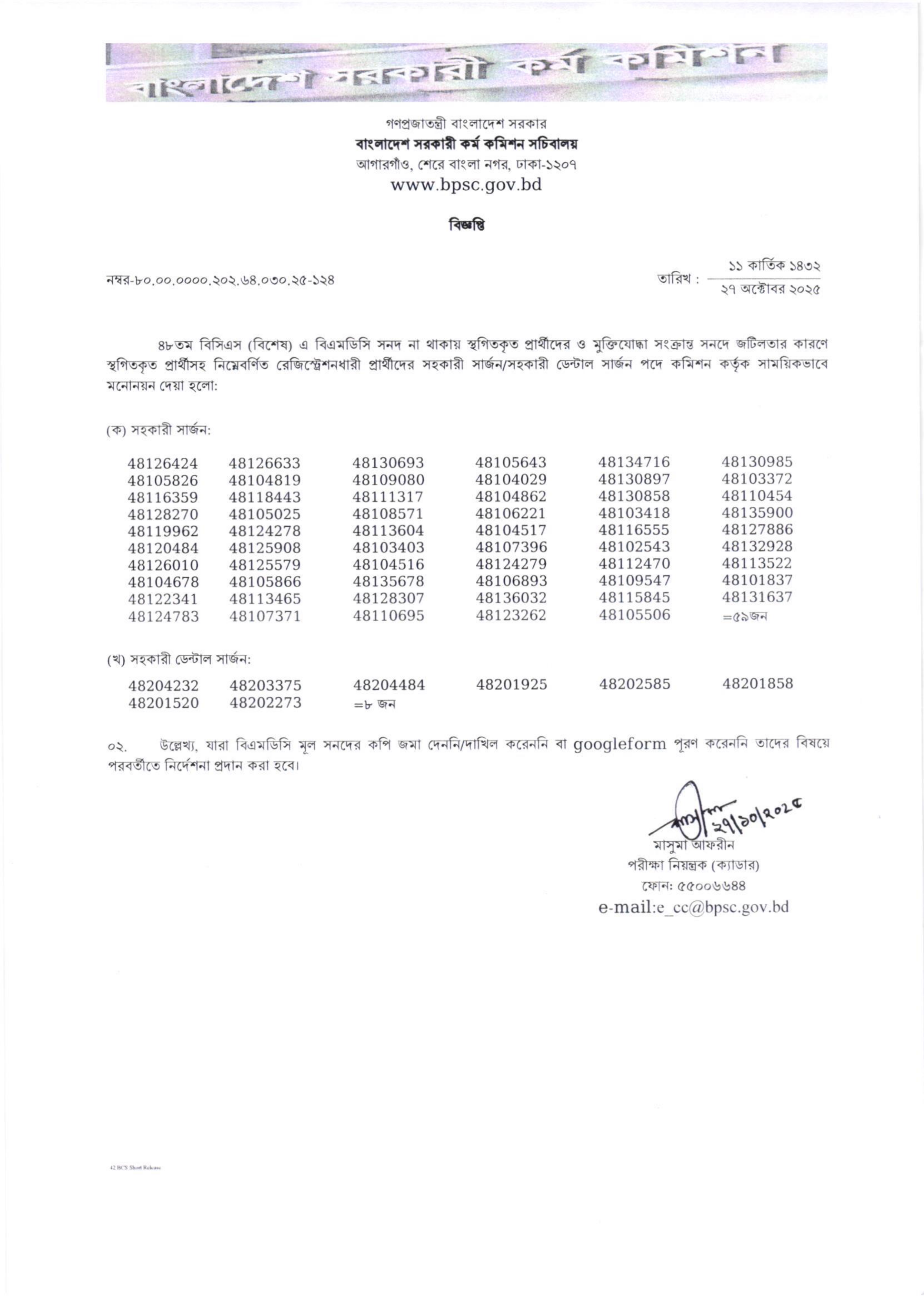 বাংলাদেশ কর্ম কমিশন (BPSC) কর্তৃক ৪৮তম বিসিএস (বিশেষ) এ সহকারী সার্জন ও সহকারী ডেন্টাল সার্জন পদে সাময়িকভাবে মনোনয়ন প্রদান করা হয়েছে।