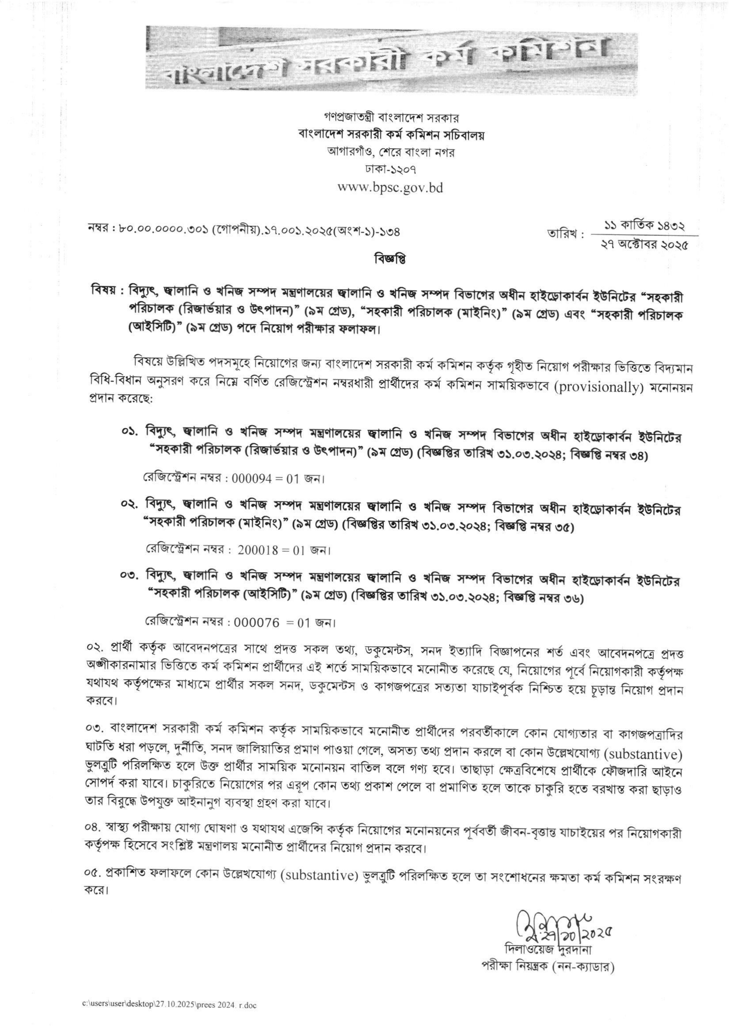 বাংলাদেশ সরকারী কর্ম কমিশন (BPSC) কর্তৃক বিদ্যুৎ, জ্বালানি ও খনিজ সম্পদ মন্ত্রণালয়ের জ্বালানি ও খনিজ সম্পদ বিভাগের অধীন হাইড্রোকার্বন ইউনিটের বিভিন্ন পদে নিয়োগ পরীক্ষার ফলাফল প্রকাশিত হয়েছে।