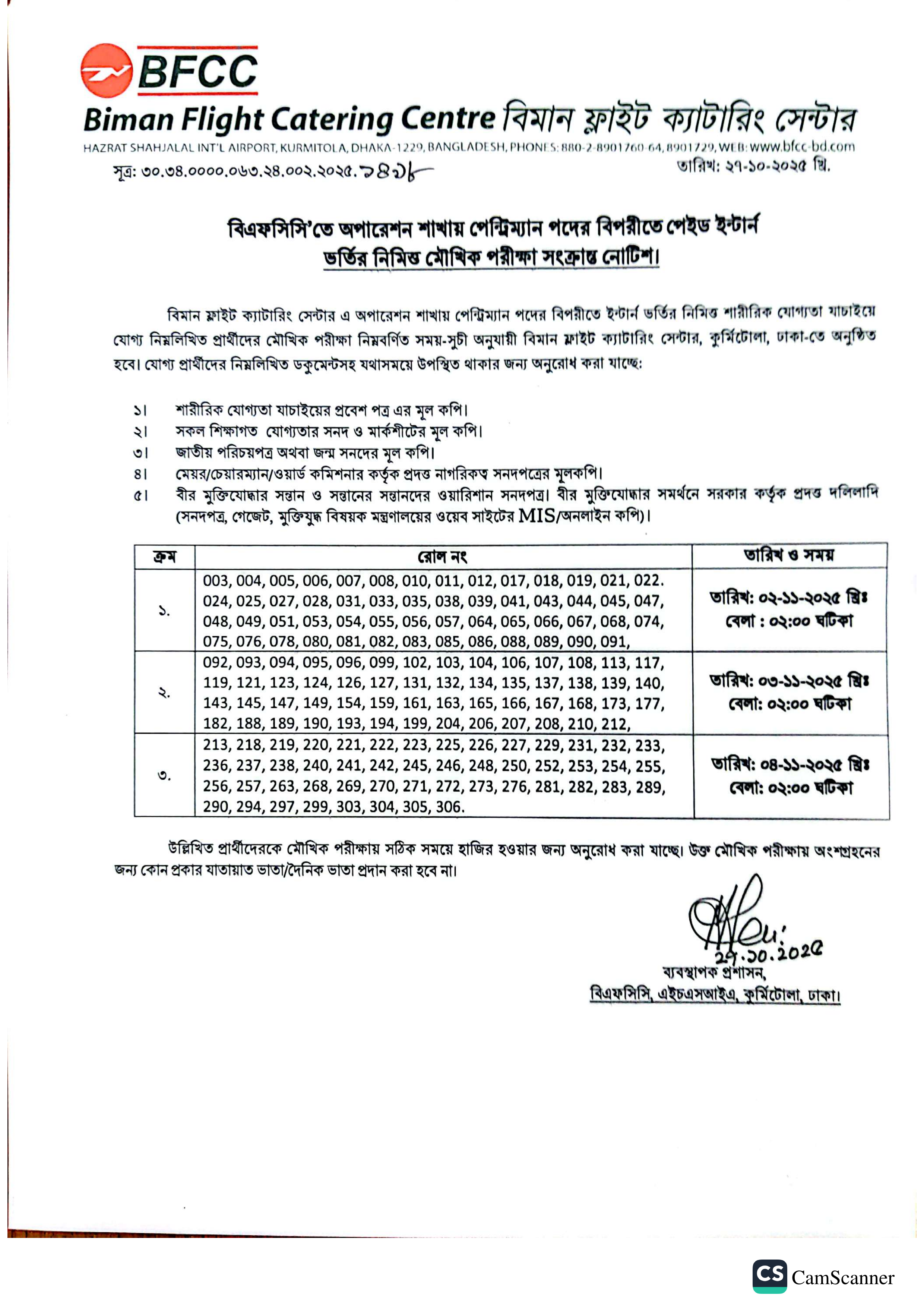 মৌখিক পরীক্ষা নিম্নবর্ণিত সময়-সূচী অনুযায়ী বিমান ফ্লাইট ক্যাটারিং সেন্টার, কুর্মিটোলা, ঢাকা-তে অনুষ্ঠিত হবে: