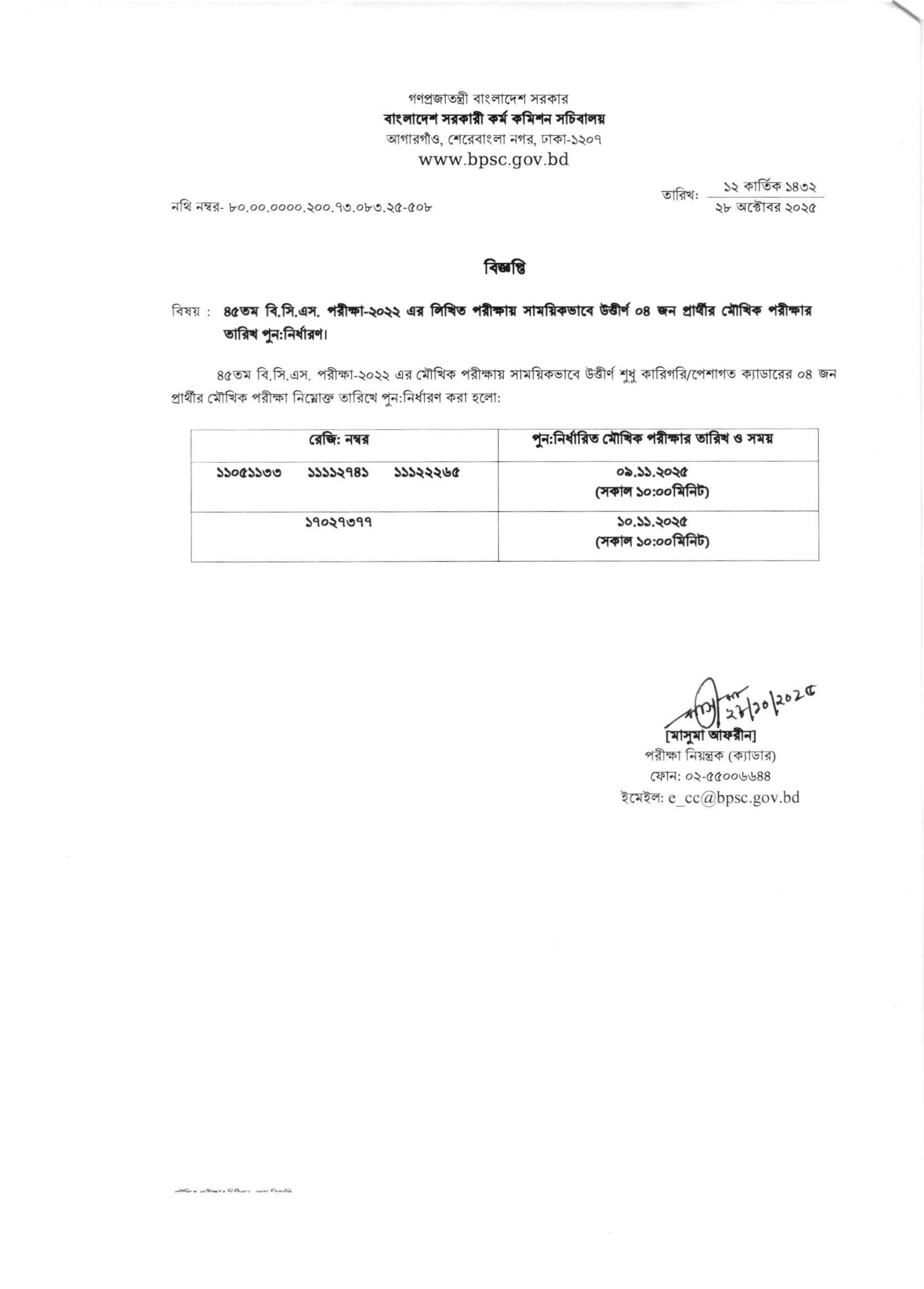 বাংলাদেশ সরকারী কর্ম কমিশন সচিবালয় কর্তৃক প্রকাশিত এক বিজ্ঞপ্তিতে ৪৫তম বি.সি.এস. পরীক্ষা-২০২২ এর মৌখিক পরীক্ষার তারিখ পুন:নির্ধারণের ঘোষণা করা হয়েছে। এই পুন:নির্ধারণ শুধুমাত্র কারিগরি/পেশাগত ক্যাডারের সাময়িকভাবে উত্তীর্ণ মোট ০৪ জন প্রার্থীর জন্য প্রযোজ্য।