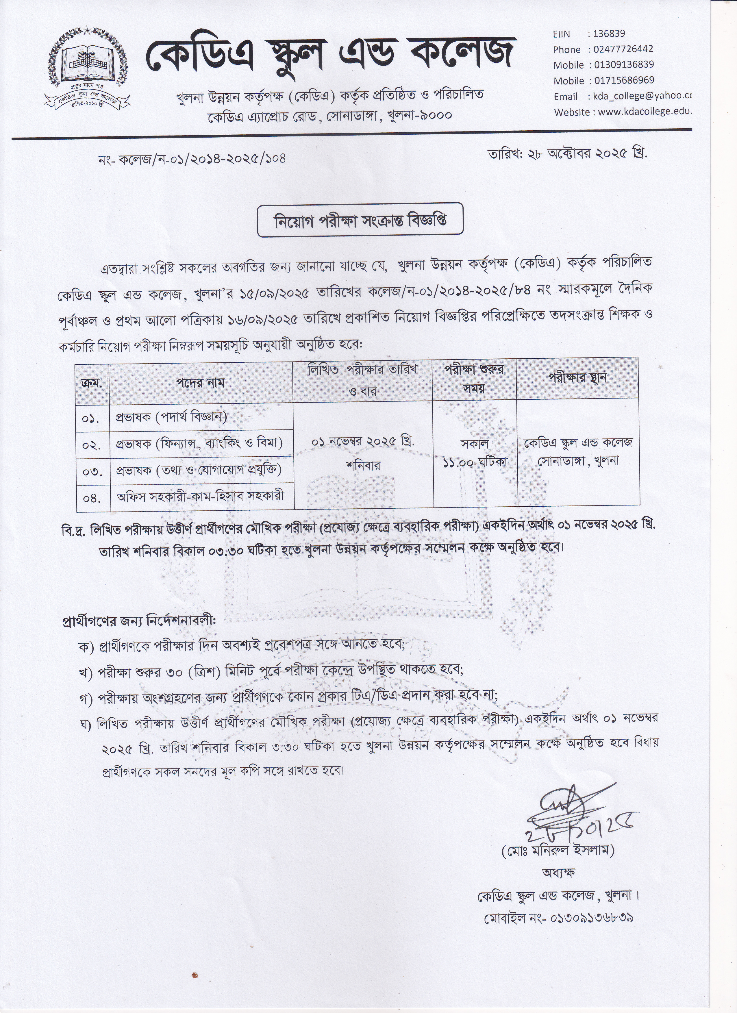 লিখিত পরীক্ষা ০১ নভেম্বর ২০২৫ খ্রি., শনিবার সকাল ১১:৩০ ঘটিকায় নিম্নলিখিত পদসমূহের জন্য কেডিএ স্কুল এন্ড কলেজ, সোনাডাঙ্গা, খুলনা-তে অনুষ্ঠিত হবে:
