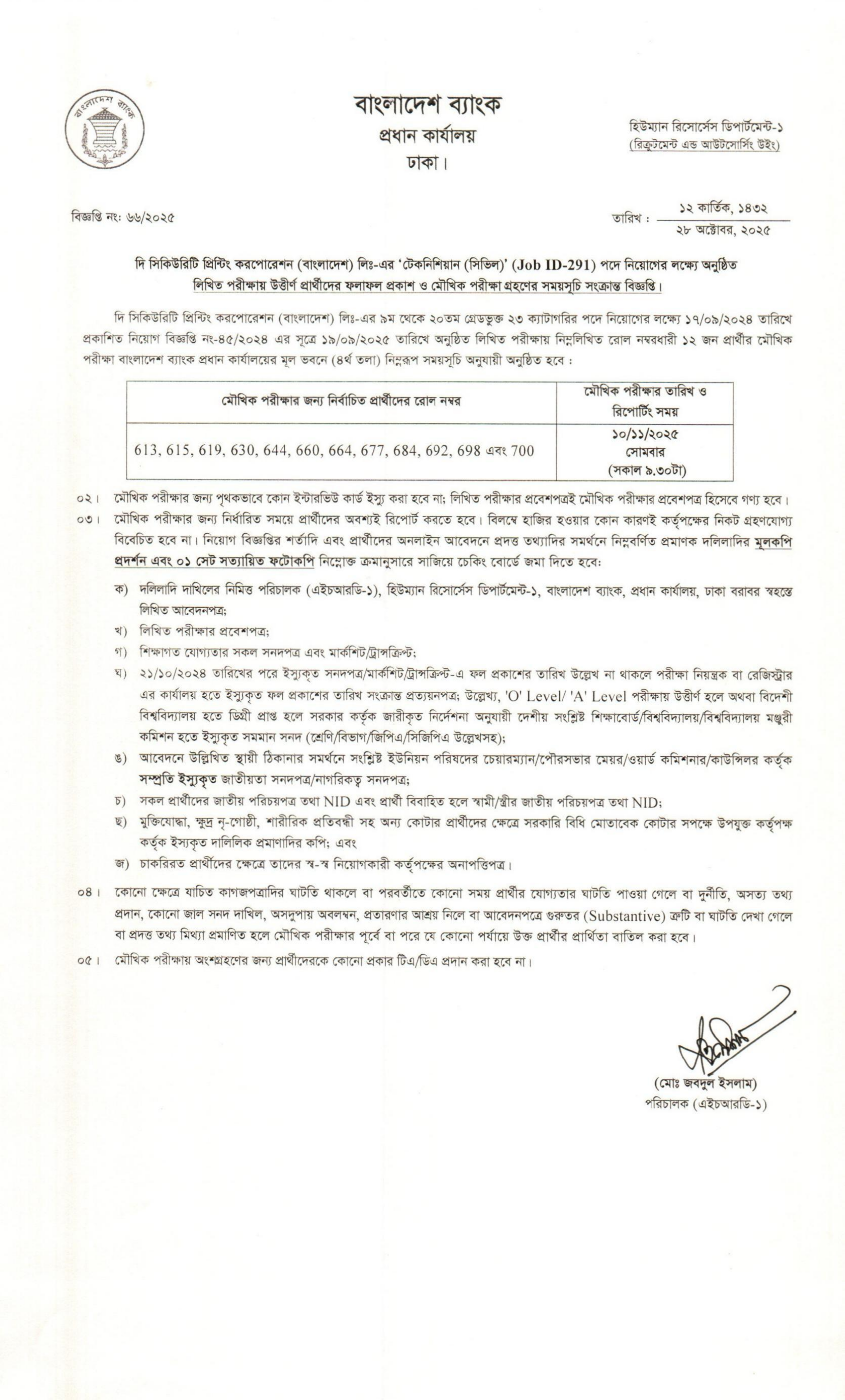 মৌখিক পরীক্ষা ১০/১১/২০২৫ তারিখ (সোমবার) সকাল ৯.৩০টায় বাংলাদেশ ব্যাংক প্রধান কার্যালয়ের মূল ভবনে (৪র্থ তলা) অনুষ্ঠিত হবে।