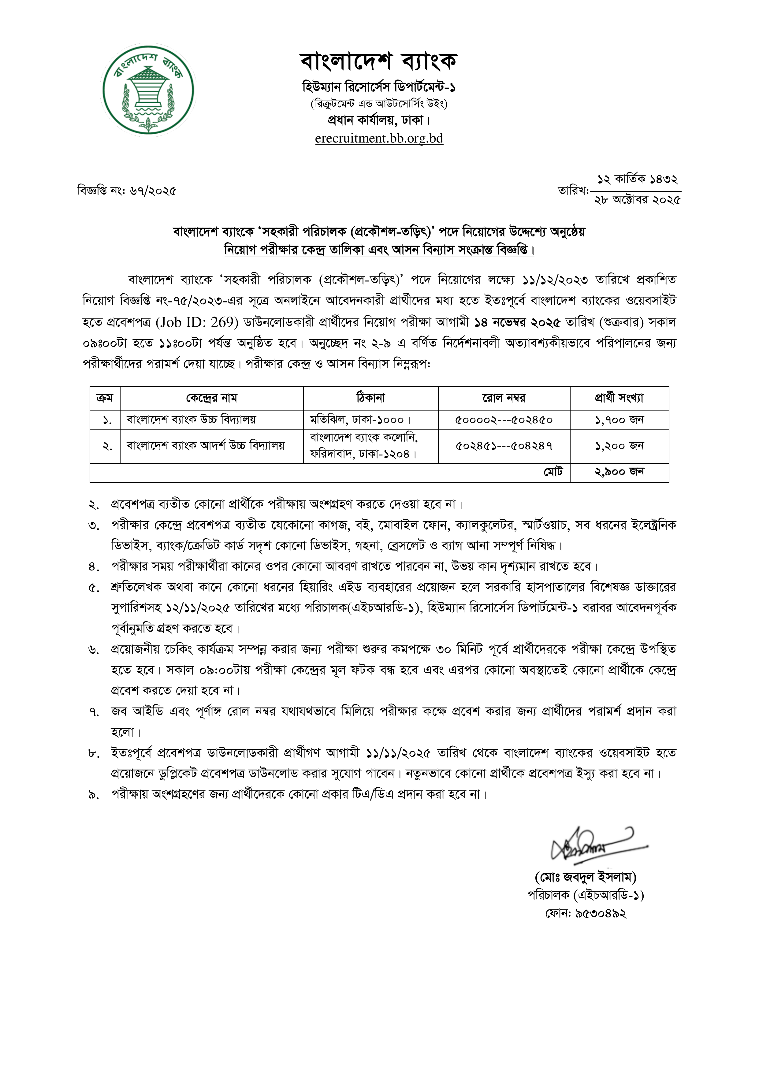 প্রার্থীদের প্রবেশপত্র ব্যতীত পরীক্ষায় অংশগ্রহণ করতে দেওয়া হবে না। ইতঃপূর্বে প্রবেশপত্র ডাউনলোডকারী প্রার্থীগণ আগামী ১১ নভেম্বর ২০২৫ তারিখ থেকে বাংলাদেশ ব্যাংকের ওয়েবসাইট থেকে প্রয়োজনে ডুপ্লিকেট প্রবেশপত্র ডাউনলোড করতে পারবেন। নতুনভাবে কোনো প্রবেশপত্র ইস্যু করা হবে না।