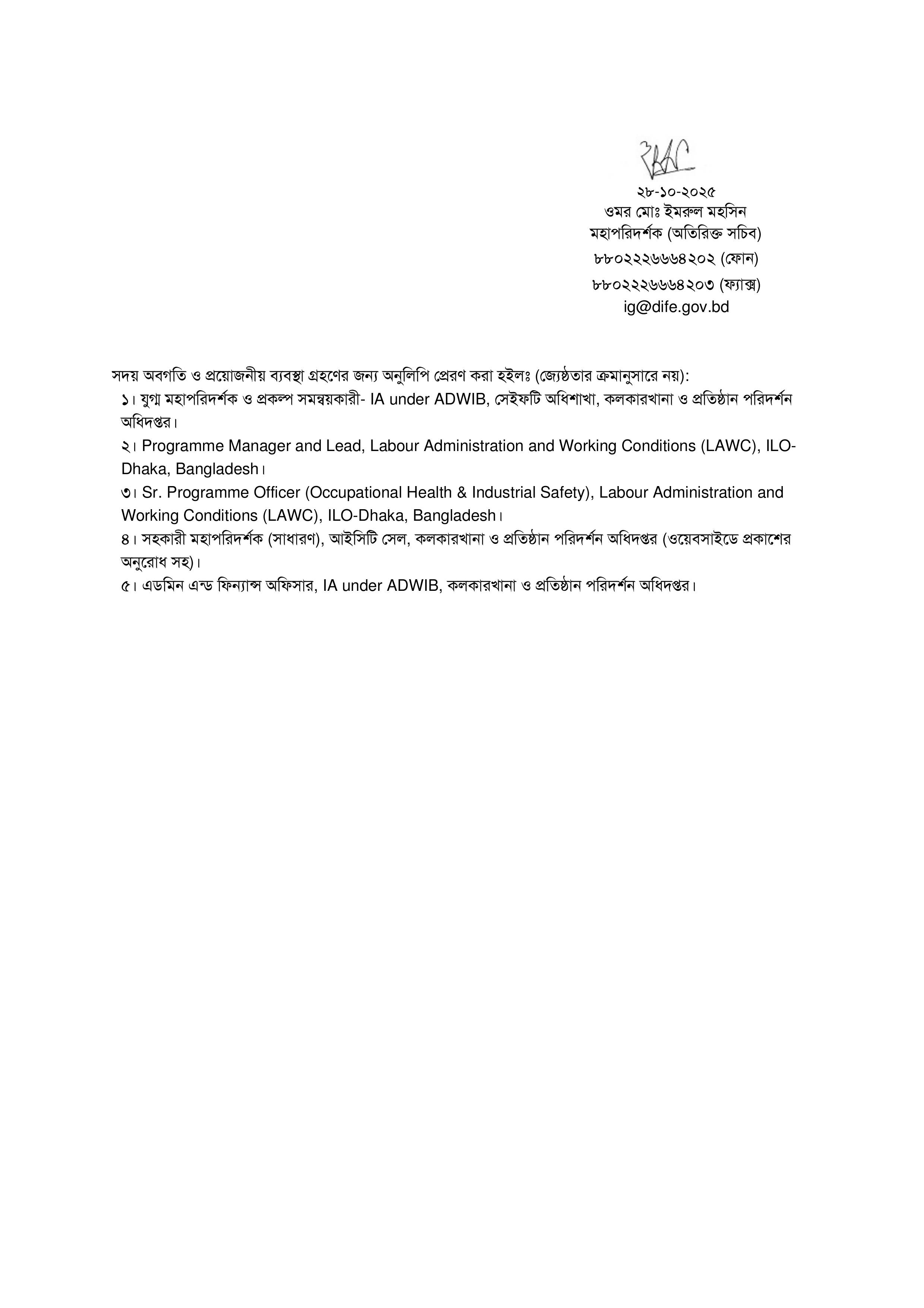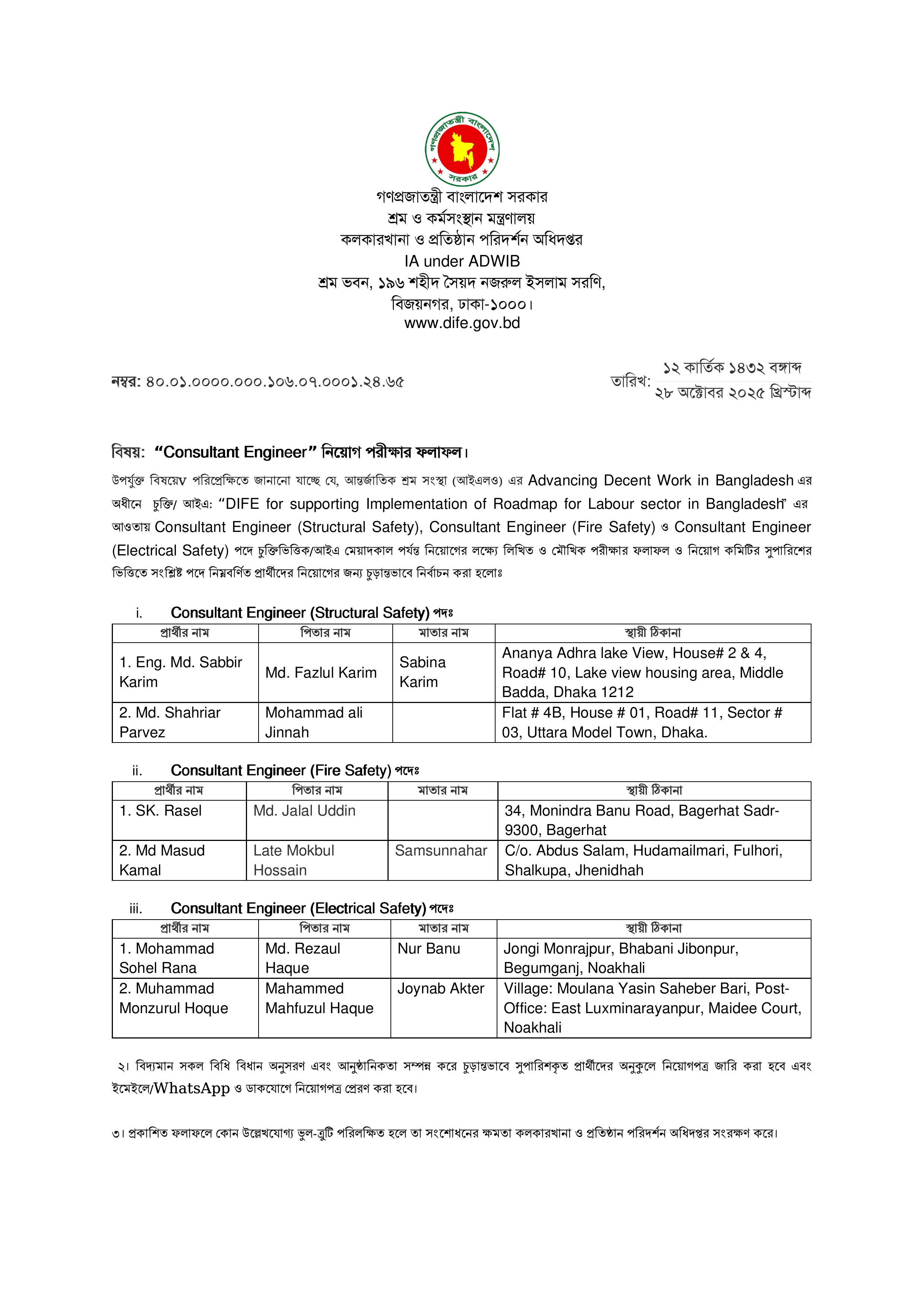 কলকারখানা ও প্রতিষ্ঠান পরিদর্শন অধিদপ্তর (DIFE) কর্তৃক আন্তর্জাতিক শ্রম সংস্থা (আইএলও)-এর অধীনে পরিচালিত একটি প্রকল্পের আওতায় চুক্তিভিত্তিক "Contractual Project Personnel" নিয়োগের লিখিত ও মৌখিক পরীক্ষার চুড়ান্ত ফলাফল প্রকাশিত হয়েছে।
