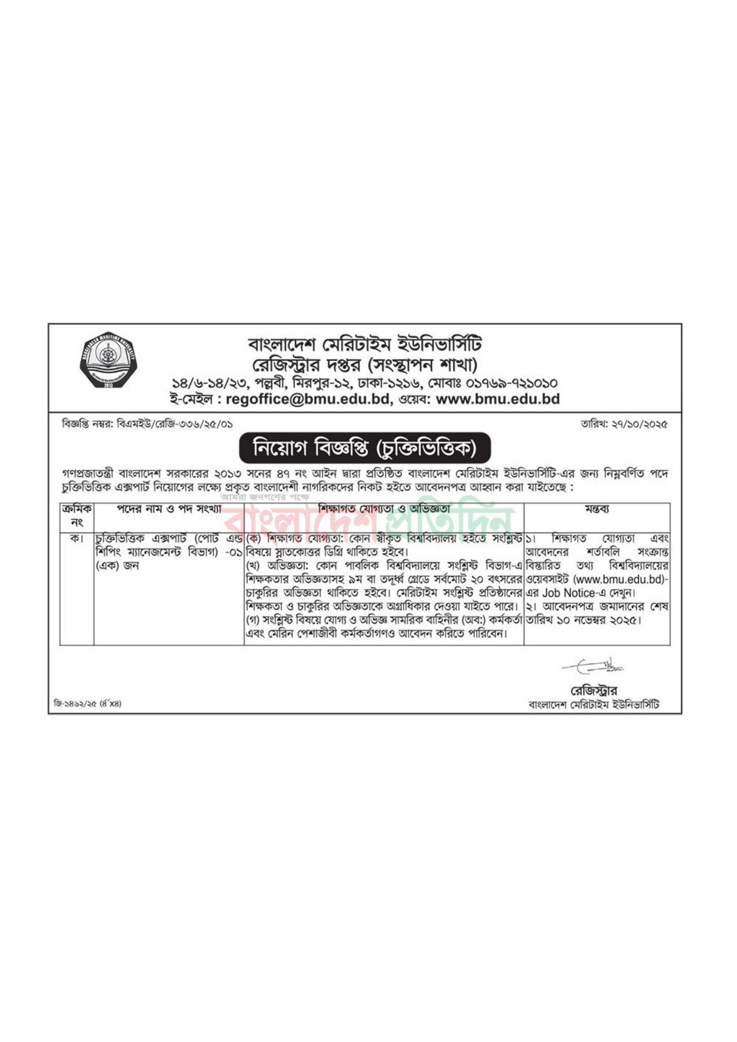 বাংলাদেশ মেরিটাইম ইউনিভার্সিটি কর্তৃক ২৭/১০/২০২৫ তারিখে একটি বিজ্ঞপ্তি প্রকাশ করা হয়েছে। বিজ্ঞপ্তির মূল বিষয়বস্তু জানতে নিচে দেখুন।