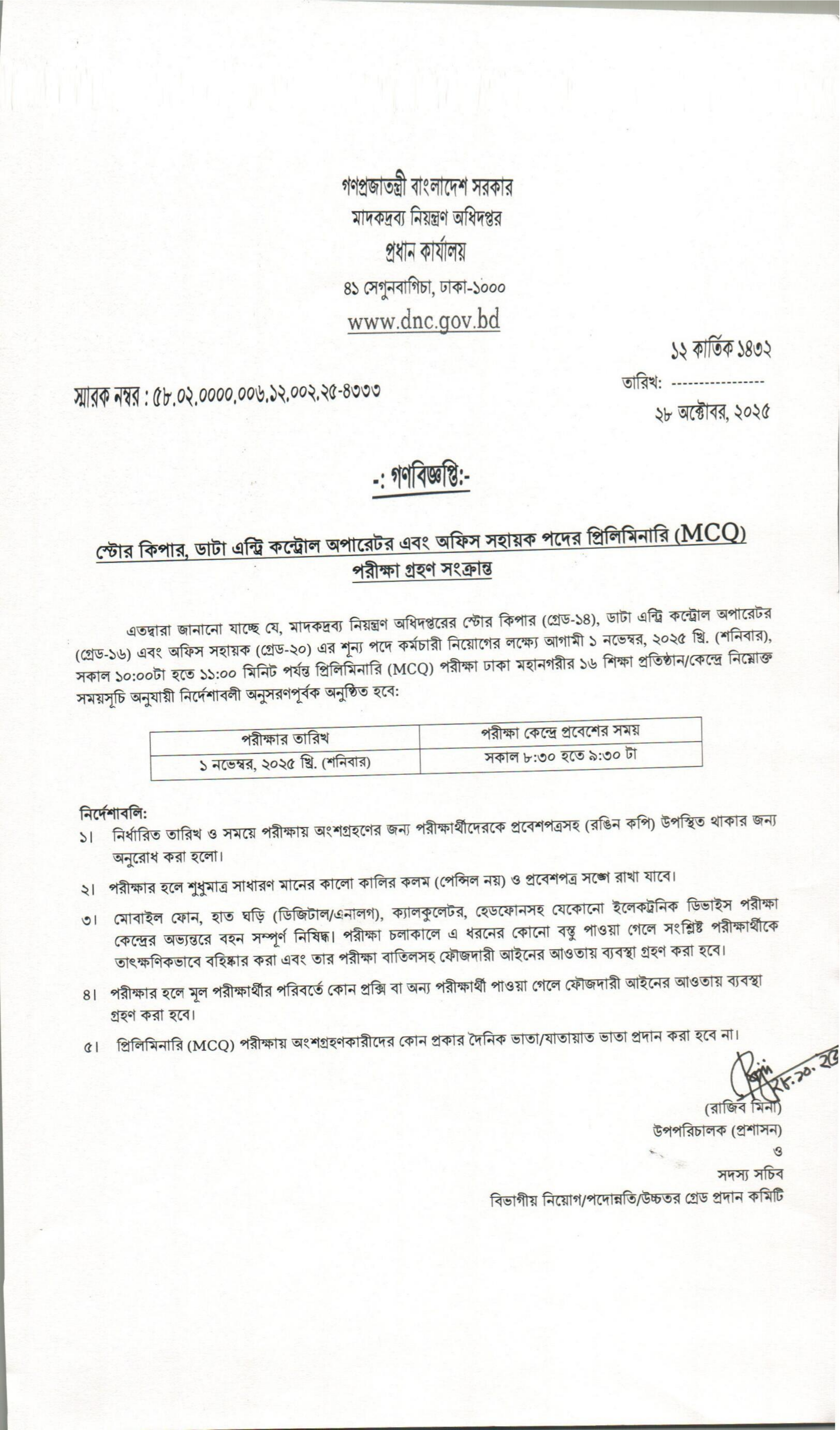 মাদকদ্রব্য নিয়ন্ত্রণ অধিদপ্তর কর্তৃক স্টোর কিপার (গ্রেড-১৪), ডাটা এন্ট্রি কন্ট্রোল অপারেটর (গ্রেড-১৬) এবং অফিস সহায়ক (গ্রেড-২০) পদের শূন্য পদে কর্মচারী নিয়োগের লক্ষ্যে অনুষ্ঠিতব্য প্রিলিমিনারি (MCQ) পরীক্ষার সময়সূচি প্রকাশ করা হয়েছে।