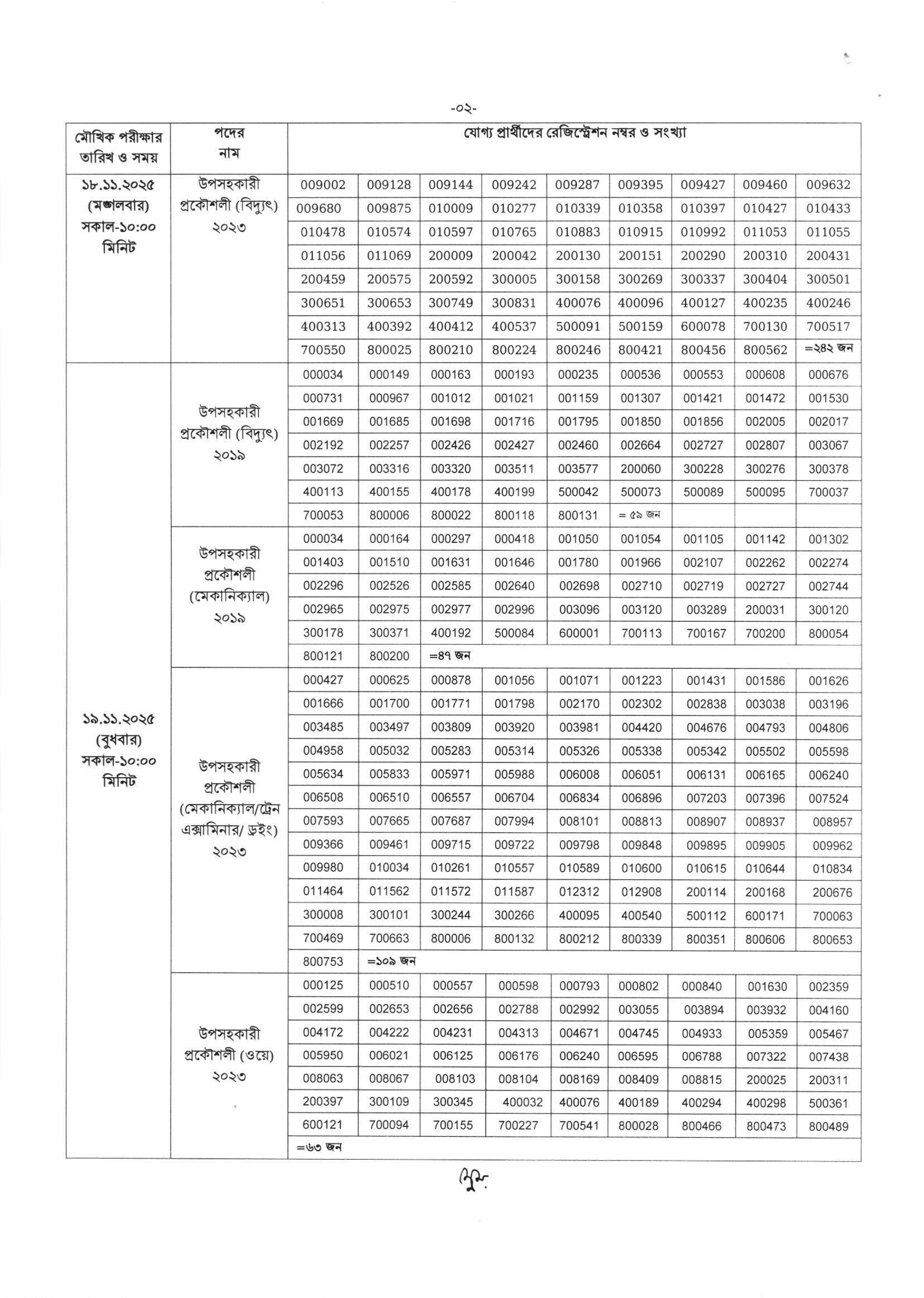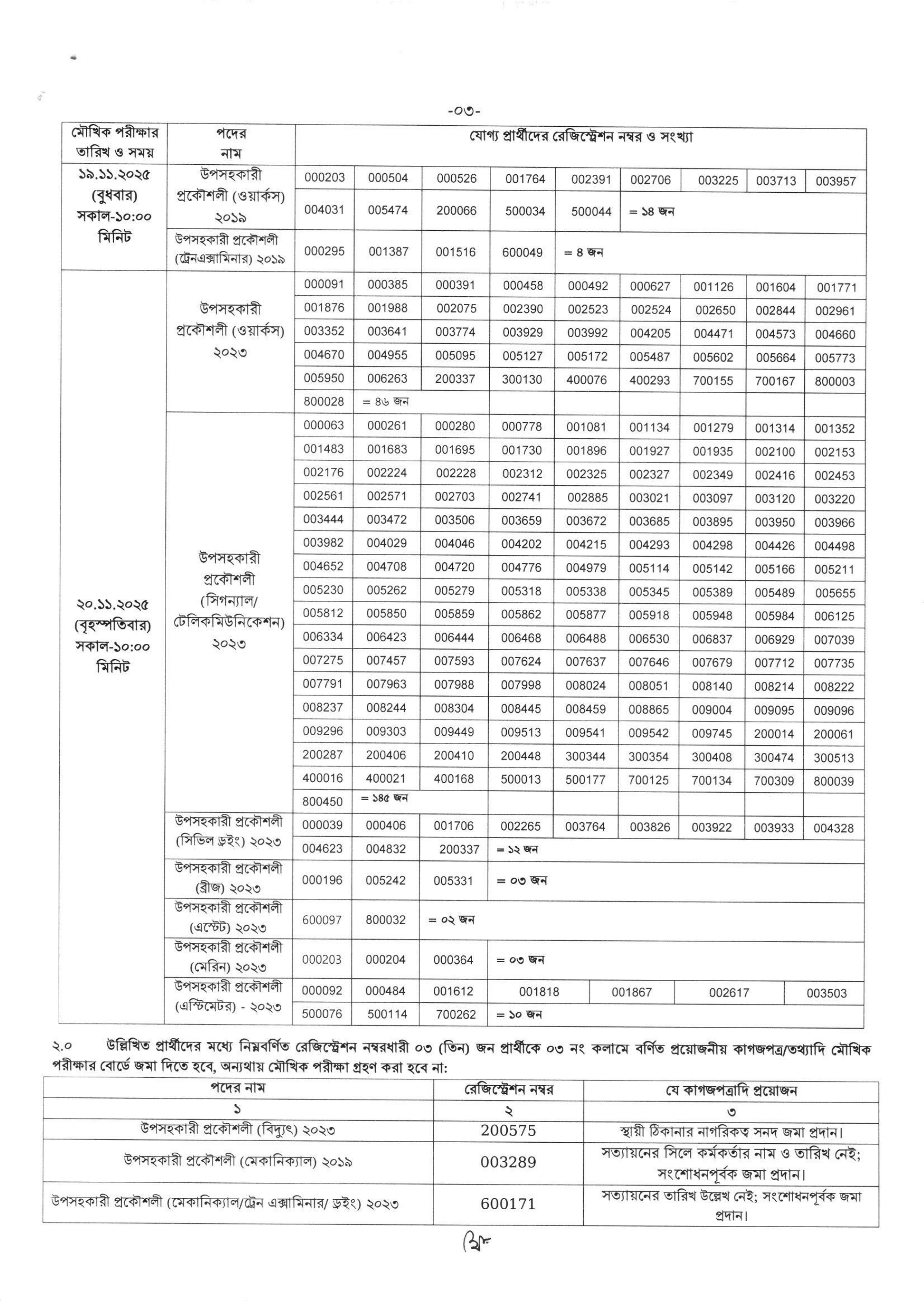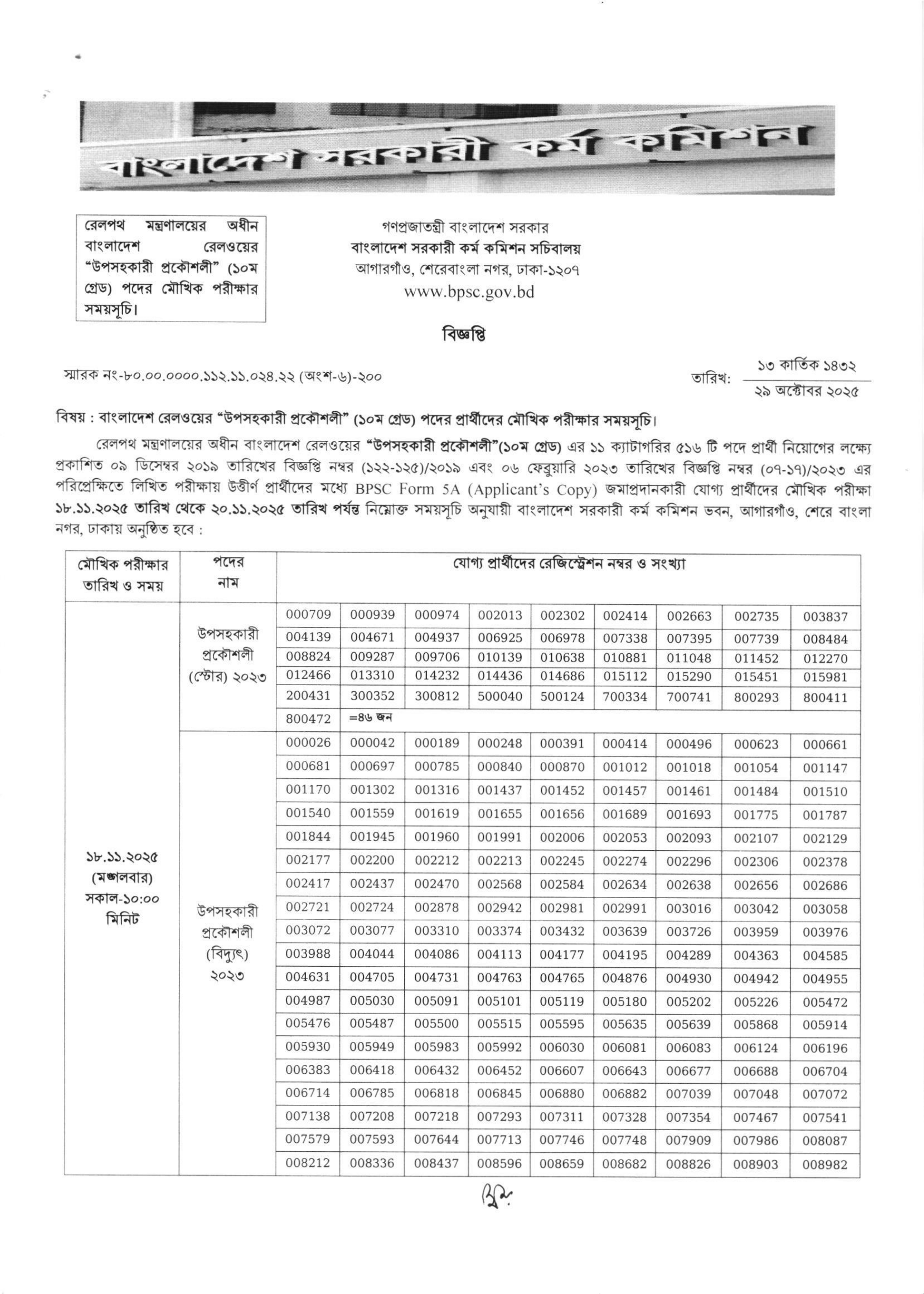 বাংলাদেশ সরকারী কর্ম কমিশন সচিবালয় কর্তৃক রেলপথ মন্ত্রণালয়ের অধীন বাংলাদেশ রেলওয়ের 'উপসহকারী প্রকৌশলী' (১০ম গ্রেড) পদের মৌখিক পরীক্ষার সময়সূচি প্রকাশ করা হয়েছে। এটি মূলত ১১ ক্যাটাগরির ৫১৬ টি পদে নিয়োগের জন্য পূর্বপ্রকাশিত বিজ্ঞপ্তির (০৯ ডিসেম্বর ২০১৯ এবং ০৬ ফেব্রুয়ারি ২০২৩) লিখিত পরীক্ষায় উত্তীর্ণ প্রার্থীদের মৌখিক পরীক্ষা।