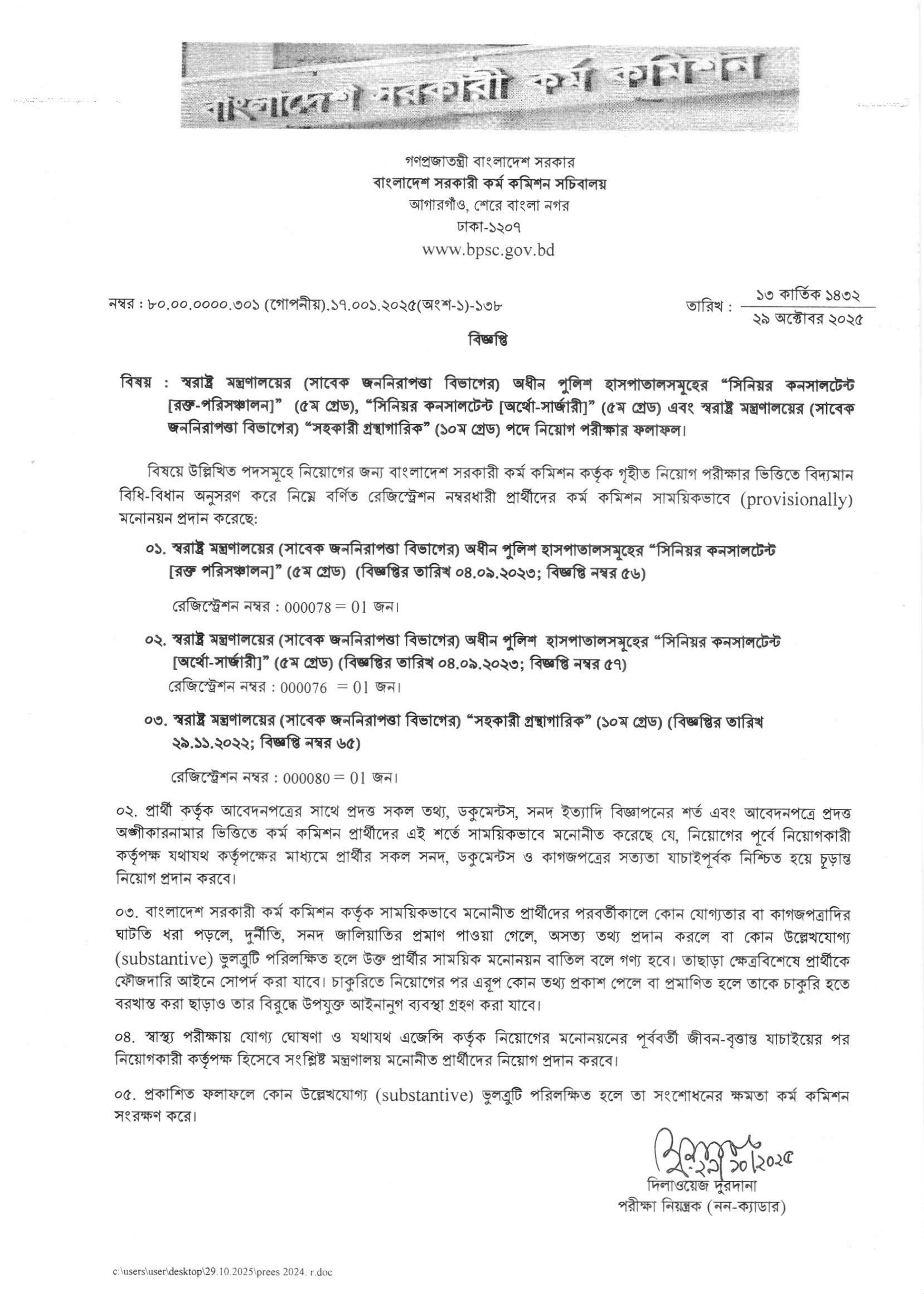 বাংলাদেশ সরকারী কর্ম কমিশন (BPSC) কর্তৃক স্বরাষ্ট্র মন্ত্রণালয়ের (সাবেক জননিরাপত্তা বিভাগের) অধীন কয়েকটি পদে নিয়োগ পরীক্ষার ফলাফল সাময়িকভাবে প্রকাশ করা হয়েছে।