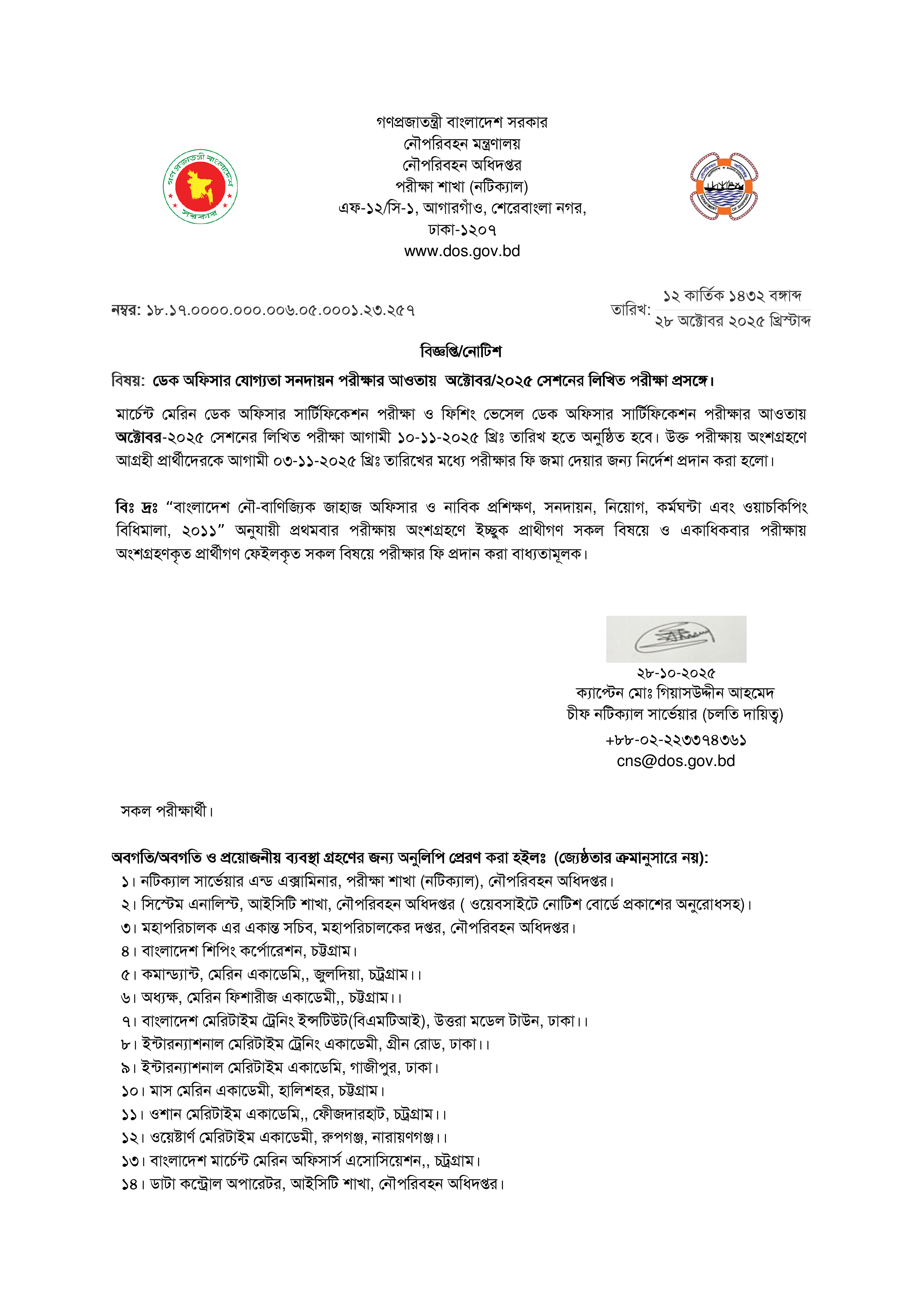 নৌপরিবহন অধিদপ্তরের অধীনে ডেক অফিসার যোগ্যতা সনদায়ন পরীক্ষার আওতায় অক্টোবর/২০২৫ সেশনের লিখিত পরীক্ষার তারিখ ঘোষণা করা হয়েছে।