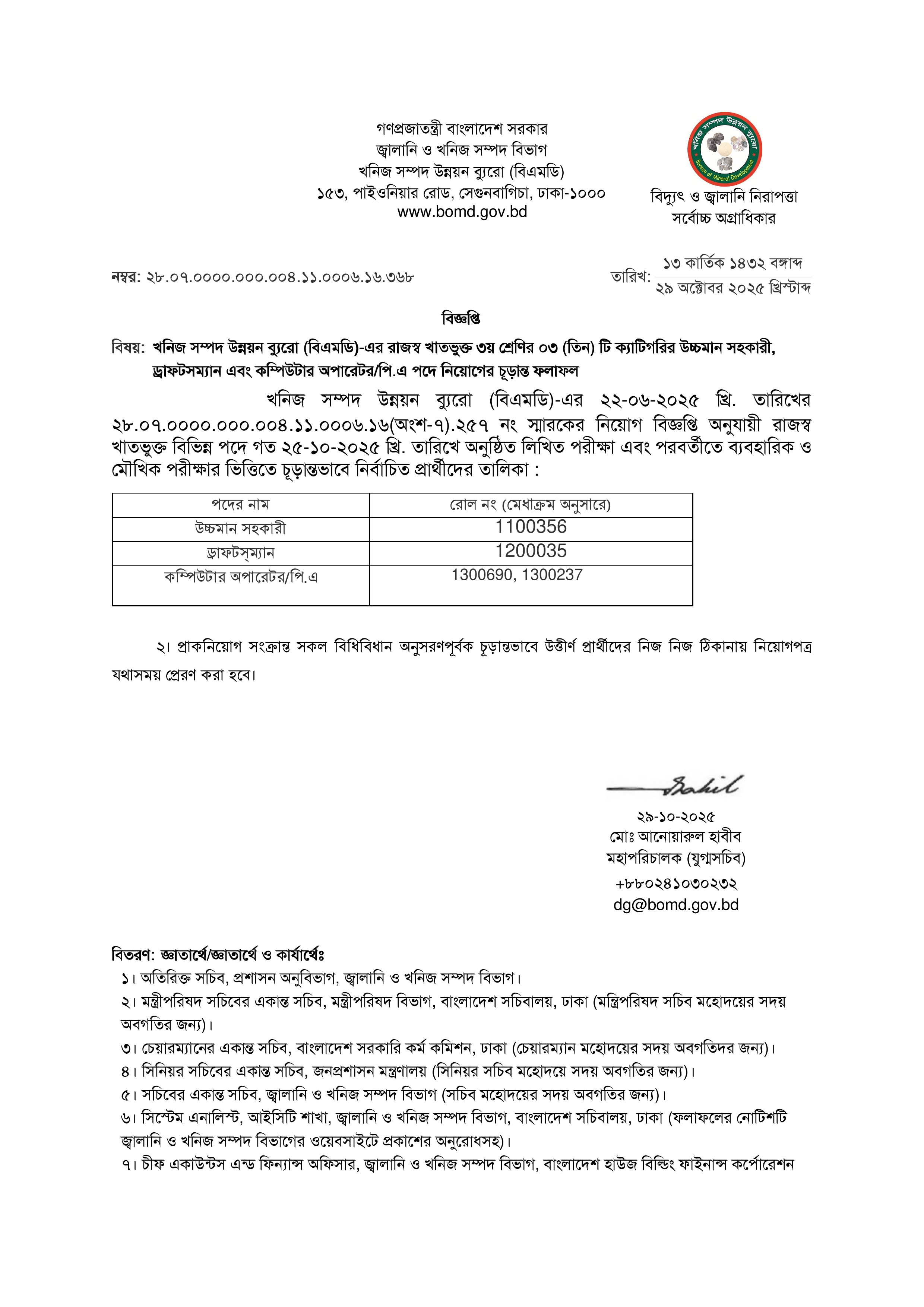 খনিজ সম্পদ উন্নয়ন ব্যুরো (বিএমডি)-এর রাজস্ব খাতভুক্ত ৩য় শ্রেণির উচ্চমান সহকারী, ড্রাফটসম্যান এবং কম্পিউটার অপারেটর/পি.এ পদে নিয়োগের চূড়ান্ত ফলাফল প্রকাশ করা হয়েছে।