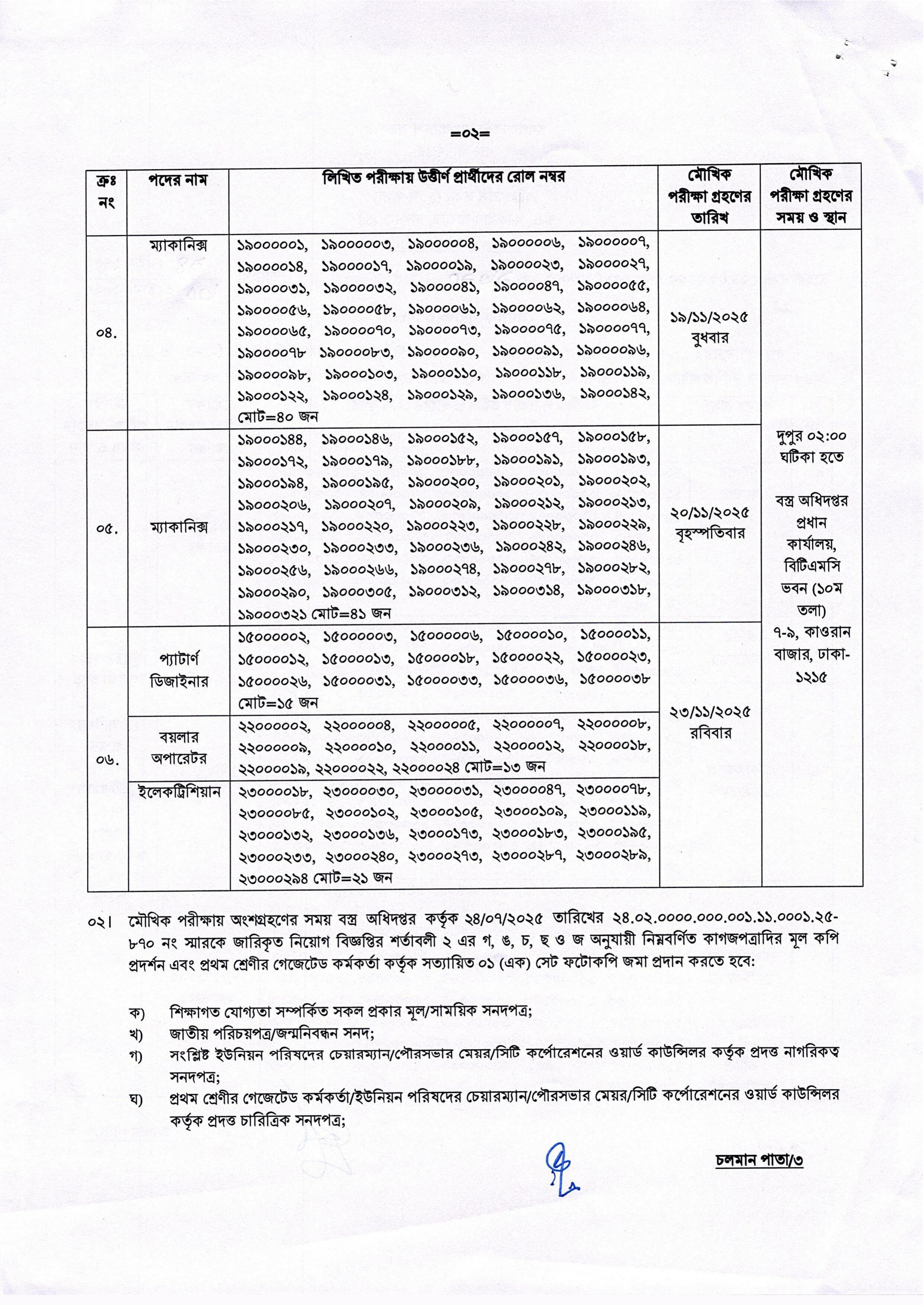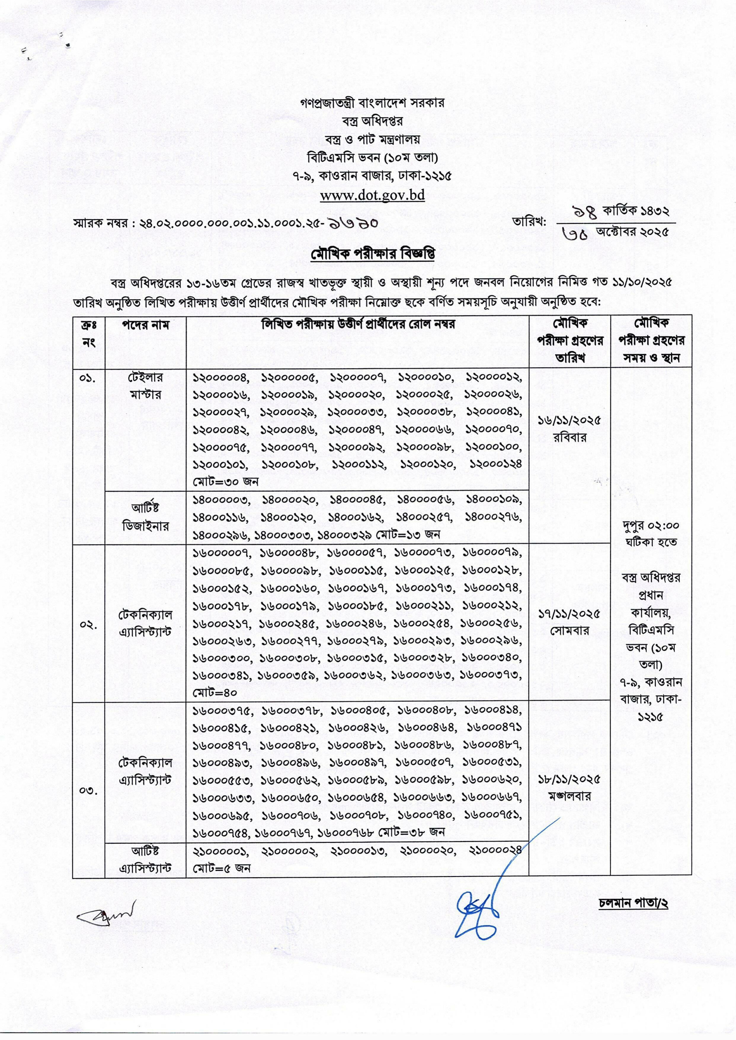 বস্ত্র অধিদপ্তর, বস্ত্র ও পাট মন্ত্রণালয়ের অধীনে ১৩-১৬তম গ্রেডের রাজস্ব খাতভুক্ত স্থায়ী ও অস্থায়ী শূন্য পদসমূহে জনবল নিয়োগের জন্য মৌখিক পরীক্ষার সময়সূচি ঘোষণা করা হয়েছে। এই মৌখিক পরীক্ষায় মোট ২৫৬ জন প্রার্থী অংশগ্রহণ করবেন।