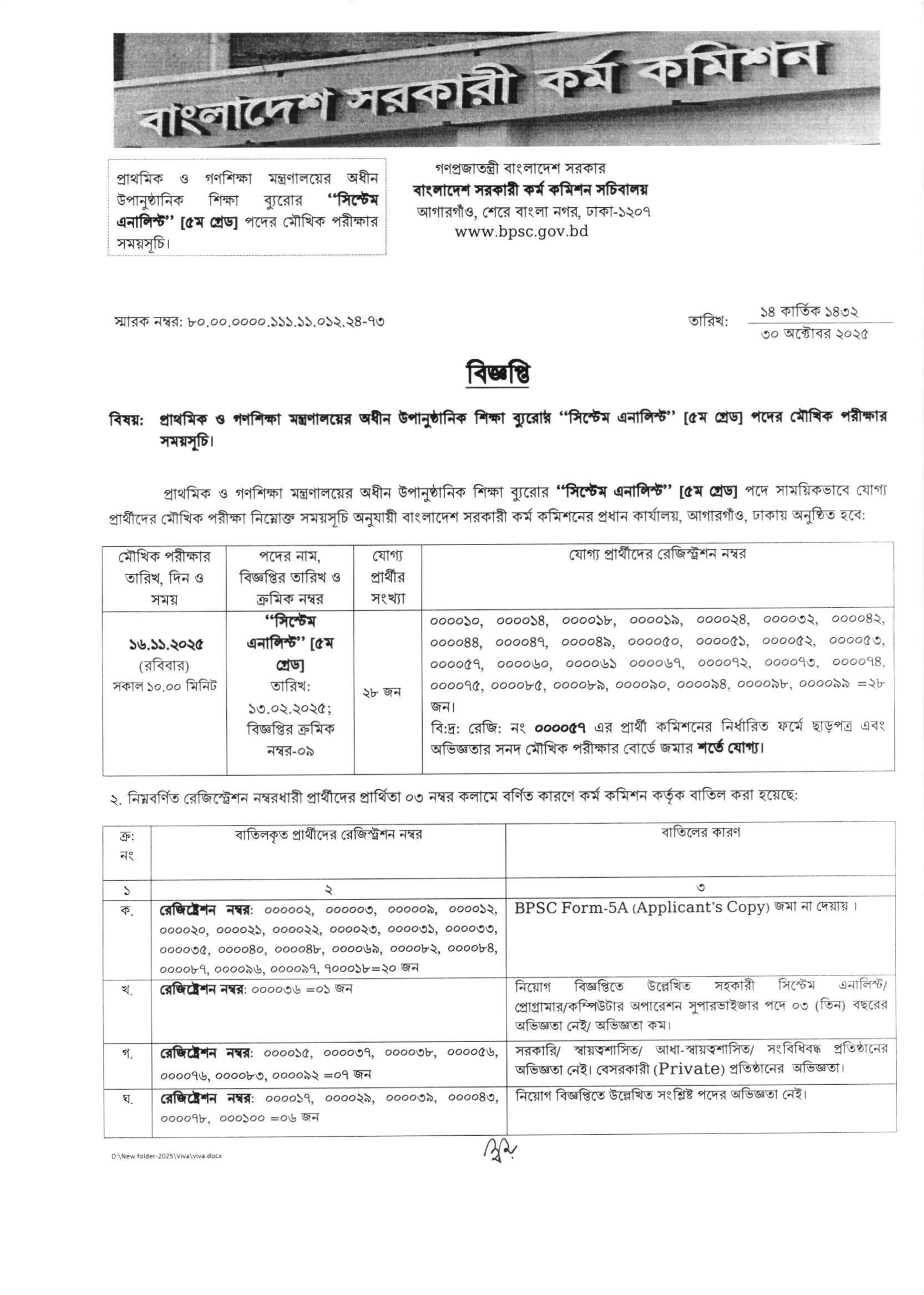 প্রাথমিক ও গণশিক্ষা মন্ত্রণালয়ের অধীন উপানুষ্ঠানিক শিক্ষা ব্যুরোর “সিস্টেম এনালিস্ট” (৫ম গ্রেড) পদের মৌখিক পরীক্ষার সময়সূচি প্রকাশিত হয়েছে। সাময়িকভাবে যোগ্য ২৮ জন প্রার্থীর মৌখিক পরীক্ষা বাংলাদেশ সরকারী কর্ম কমিশনের প্রধান কার্যালয়, আগারগাঁও, ঢাকা-তে অনুষ্ঠিত হবে।
