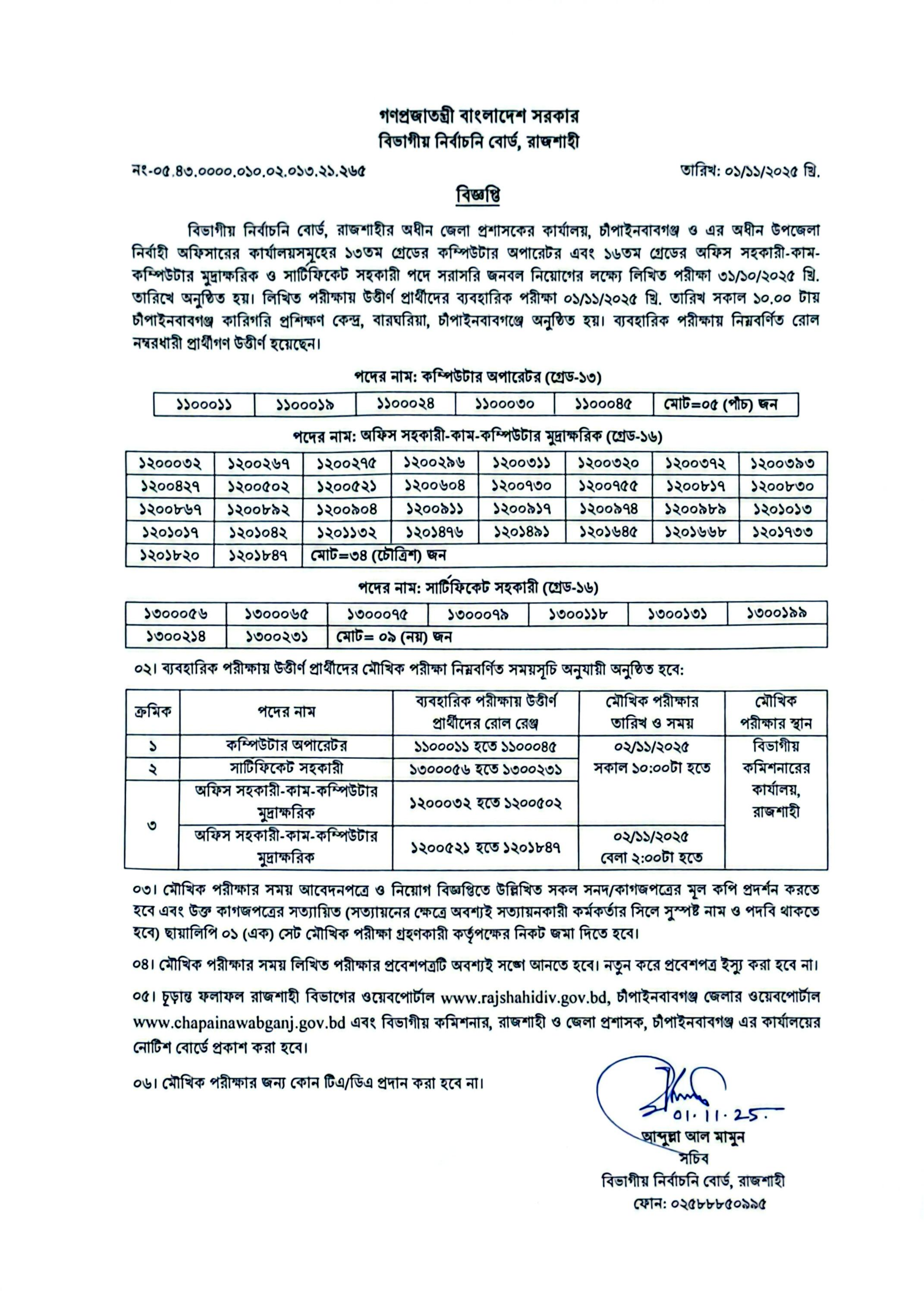 বিভাগীয় নির্বাচনি বোর্ড, রাজশাহীর অধীন জেলা প্রশাসকের কার্যালয়, চাঁপাইনবাবগঞ্জ ও এর অধীন উপজেলা নির্বাহী অফিসারের কার্যালয়সমূহের বিভিন্ন পদে জনবল নিয়োগের লক্ষ্যে অনুষ্ঠিত ব্যবহারিক পরীক্ষার ফলাফল প্রকাশিত হয়েছে এবং মৌখিক পরীক্ষার সময়সূচী ঘোষণা করা হয়েছে। লিখিত পরীক্ষা ৩১ অক্টোবর ২০২৫ খ্রি. এবং ব্যবহারিক পরীক্ষা ০১ নভেম্বর ২০২৫ খ্রি. তারিখে অনুষ্ঠিত হয়।