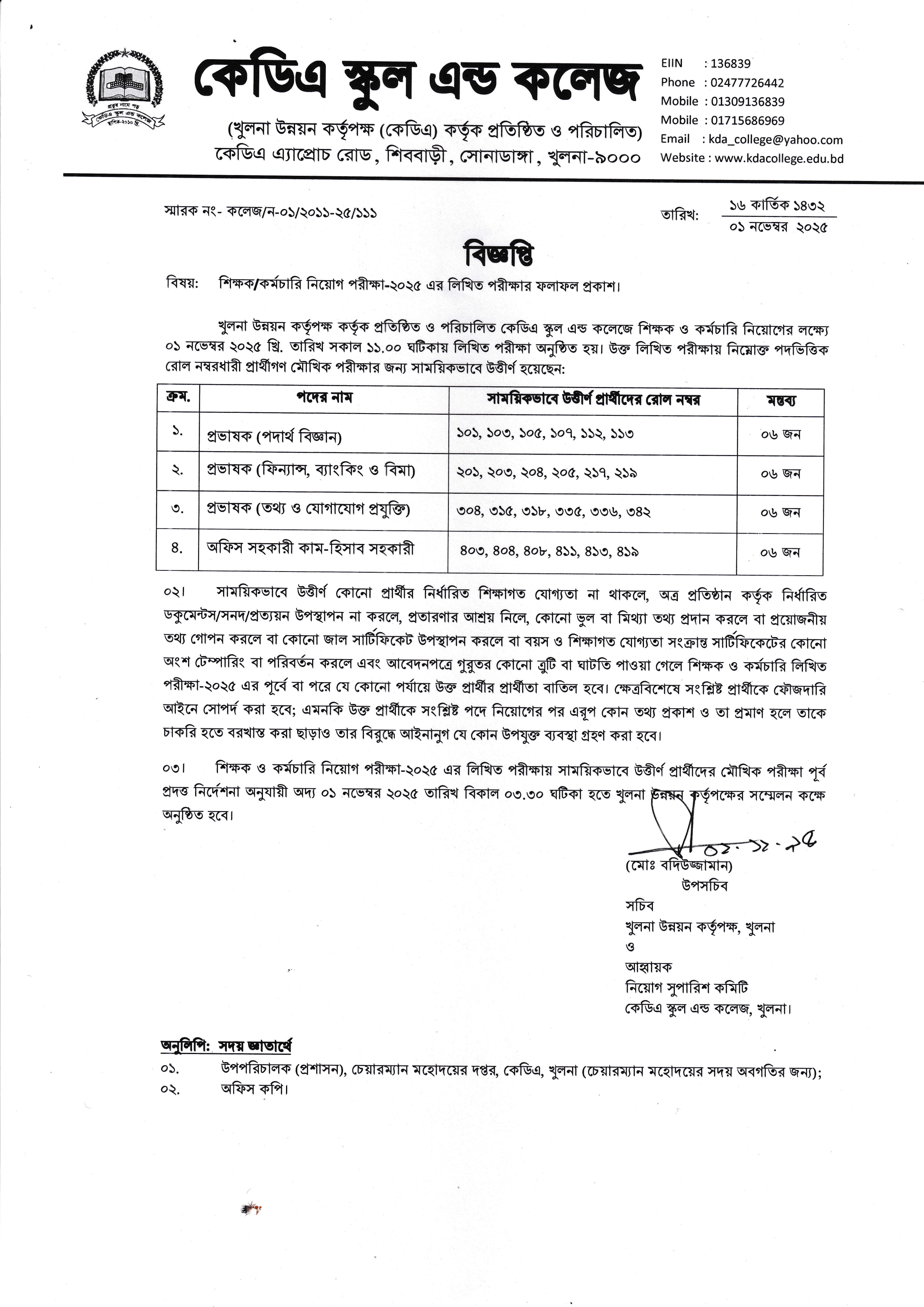 সাময়িকভাবে উত্তীর্ণ প্রার্থীদের মৌখিক পরীক্ষা আগামী ০১ নভেম্বর ২০২৫ তারিখ বিকাল ০৩.৩০ ঘটিকা হতে খুলনা উন্নয়ন কর্তৃপক্ষের সম্মেলন কক্ষে অনুষ্ঠিত হবে।