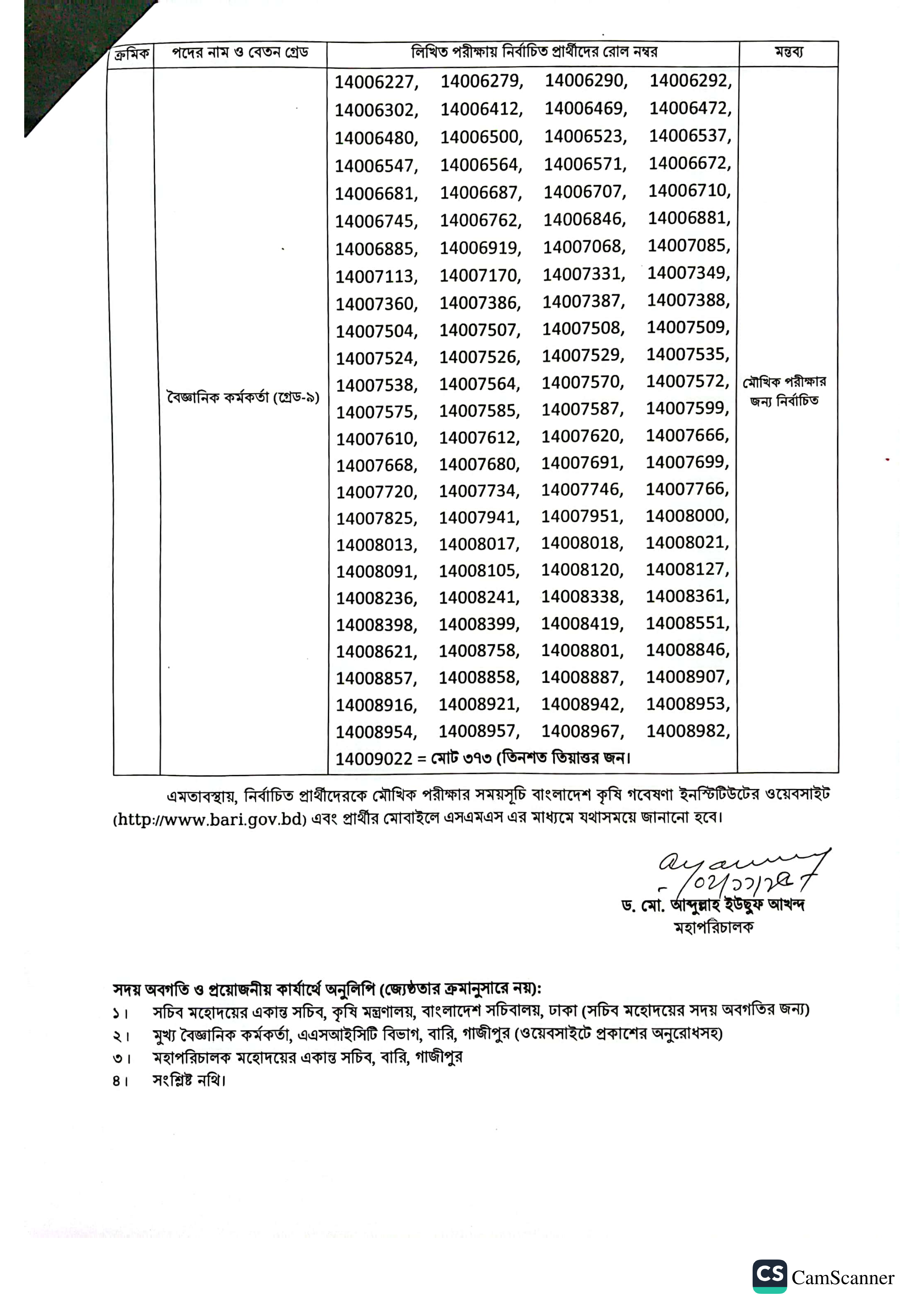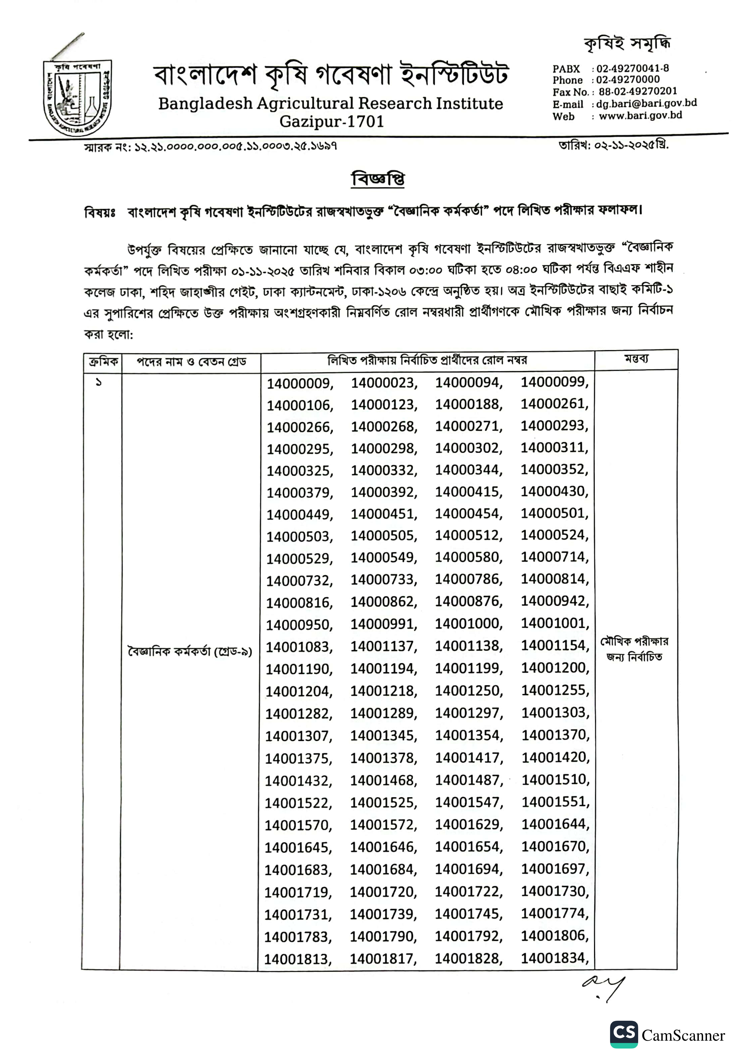 নির্বাচিত প্রার্থীদের মৌখিক পরীক্ষার সময়সূচি বাংলাদেশ কৃষি গবেষণা ইনস্টিটিউটের ওয়েবসাইট (www.bari.gov.bd) এবং প্রার্থীর মোবাইলে এসএমএস-এর মাধ্যমে যথাসময়ে জানানো হবে।