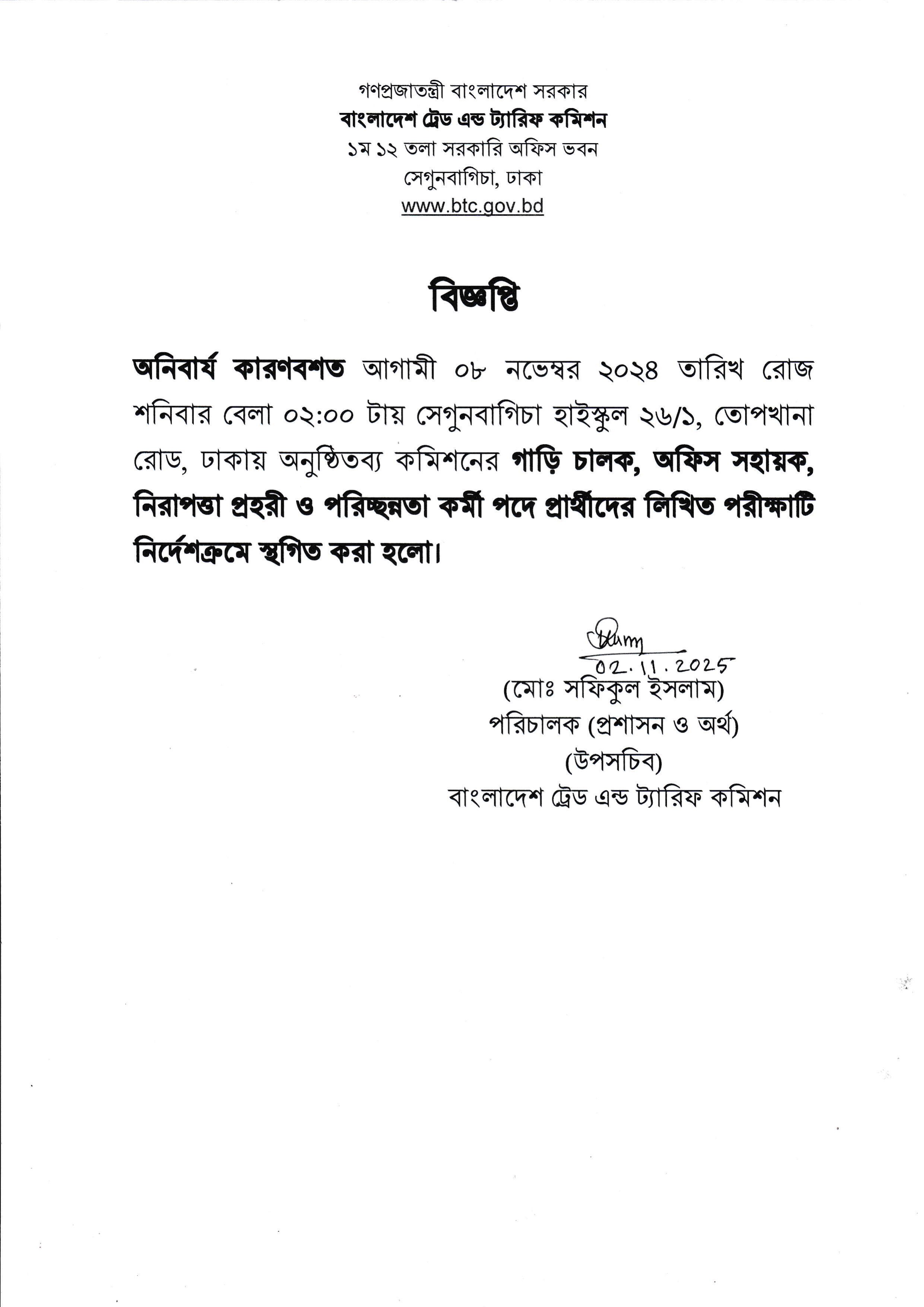 বাংলাদেশ ট্রেড এন্ড ট্যারিফ কমিশন কর্তৃক নিরাপত্তা প্রহরী ও পরিচ্ছন্নতা কর্মী পদে প্রার্থীদের লিখিত পরীক্ষা অনিবার্য কারণবশত স্থগিত করা হয়েছে।