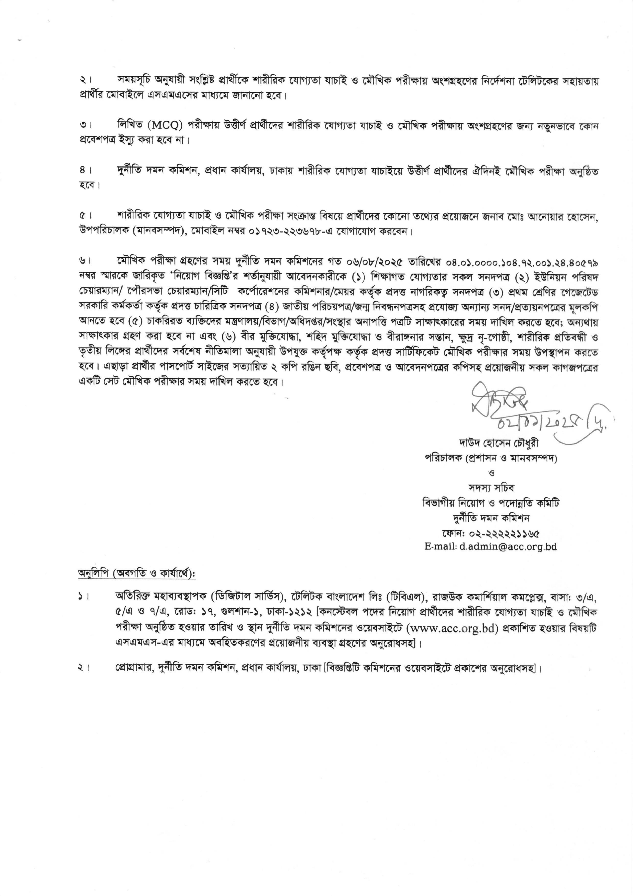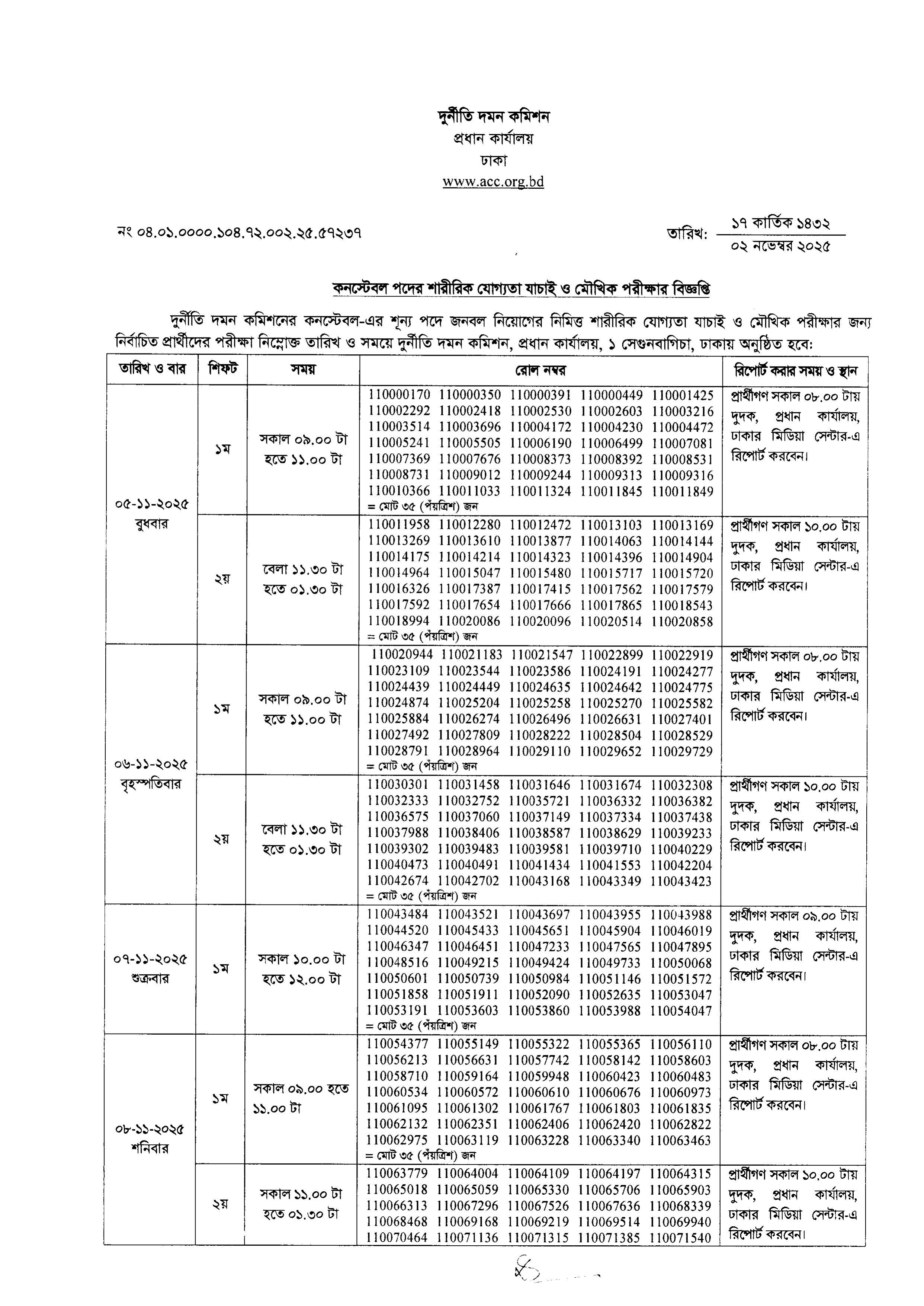 দুর্নীতি দমন কমিশনের কনস্টেবল পদের শারীরিক যোগ্যতা যাচাই ও মৌখিক পরীক্ষার সময়সূচী প্রকাশিত হয়েছে। নির্বাচিত প্রার্থীদের পরীক্ষা ০৫ নভেম্বর ২০২৫ থেকে ১২ নভেম্বর ২০২৫ তারিখ পর্যন্ত (বুধবার থেকে বুধবার) দুর্নীতি দমন কমিশন, প্রধান কার্যালয়, ১ সেগুনবাগিচা, ঢাকায় অনুষ্ঠিত হবে।