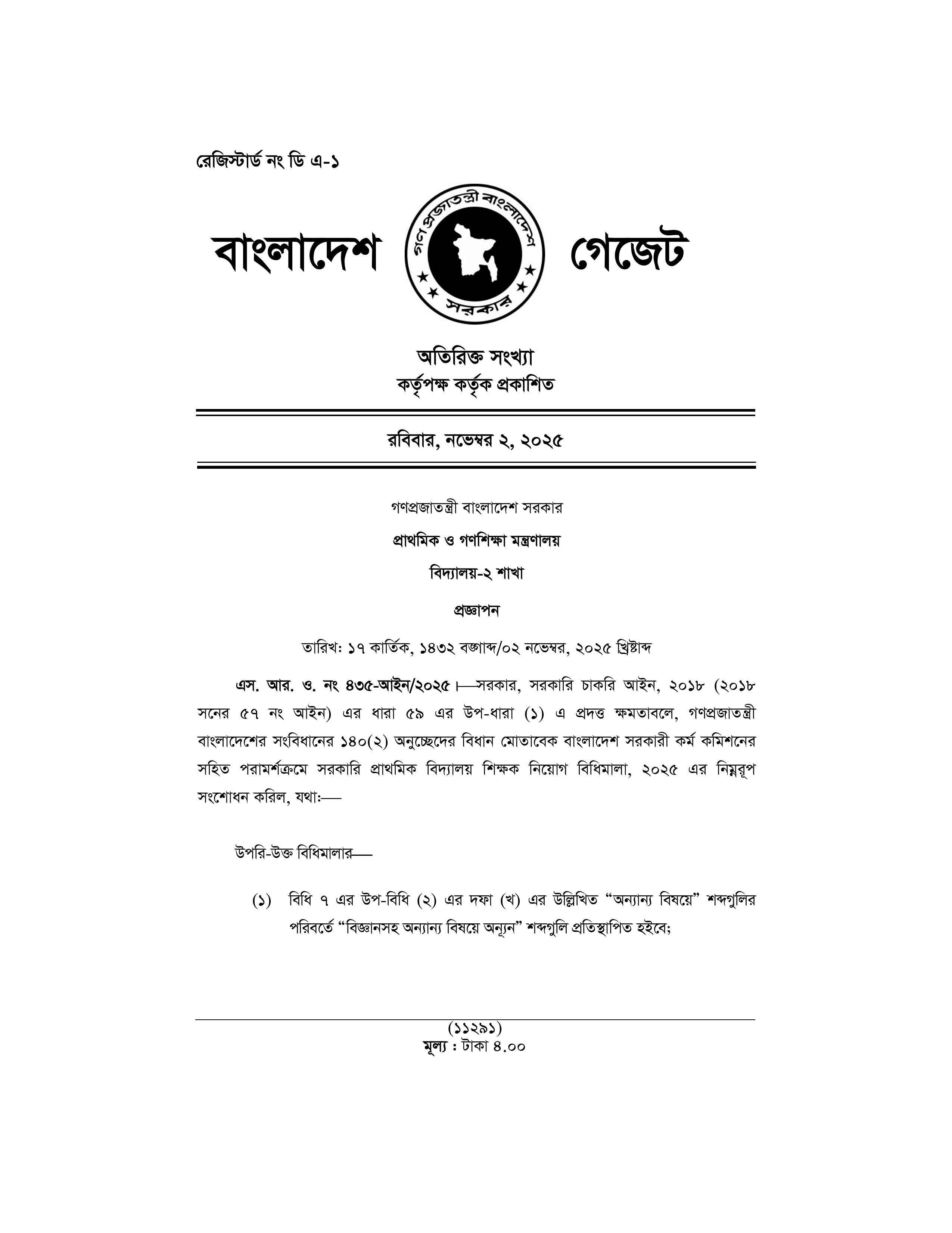 প্রাথমিক ও গণশিক্ষা মন্ত্রণালয় সরকারি প্রাথমিক বিদ্যালয় শিক্ষক নিয়োগ বিধিমালা, ২০২৫ এর সংশোধনী প্রকাশ করেছে। এই প্রজ্ঞাপন অনুযায়ী, প্রাথমিক বিদ্যালয়ে শিক্ষক নিয়োগের ক্ষেত্রে বয়স ও শিক্ষাগত যোগ্যতার শর্তাবলী পরিবর্তন করা হয়েছে।