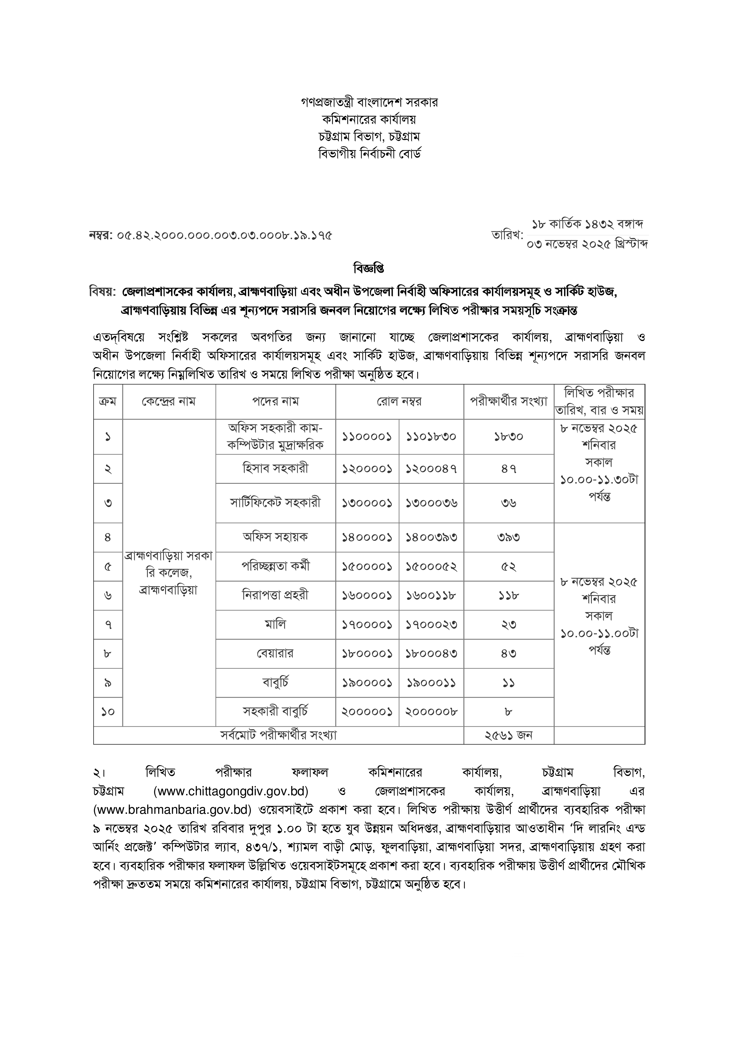 জেলাপ্রশাসকের কার্যালয়, ব্রাহ্মণবাড়িয়া এবং এর অধীন উপজেলা নির্বাহী অফিসারের কার্যালয়সমূহ ও সার্কিট হাউজ, ব্রাহ্মণবাড়িয়ায় বিভিন্ন শূন্যপদে জনবল নিয়োগের লক্ষ্যে লিখিত পরীক্ষার সময়সূচি প্রকাশিত হয়েছে।