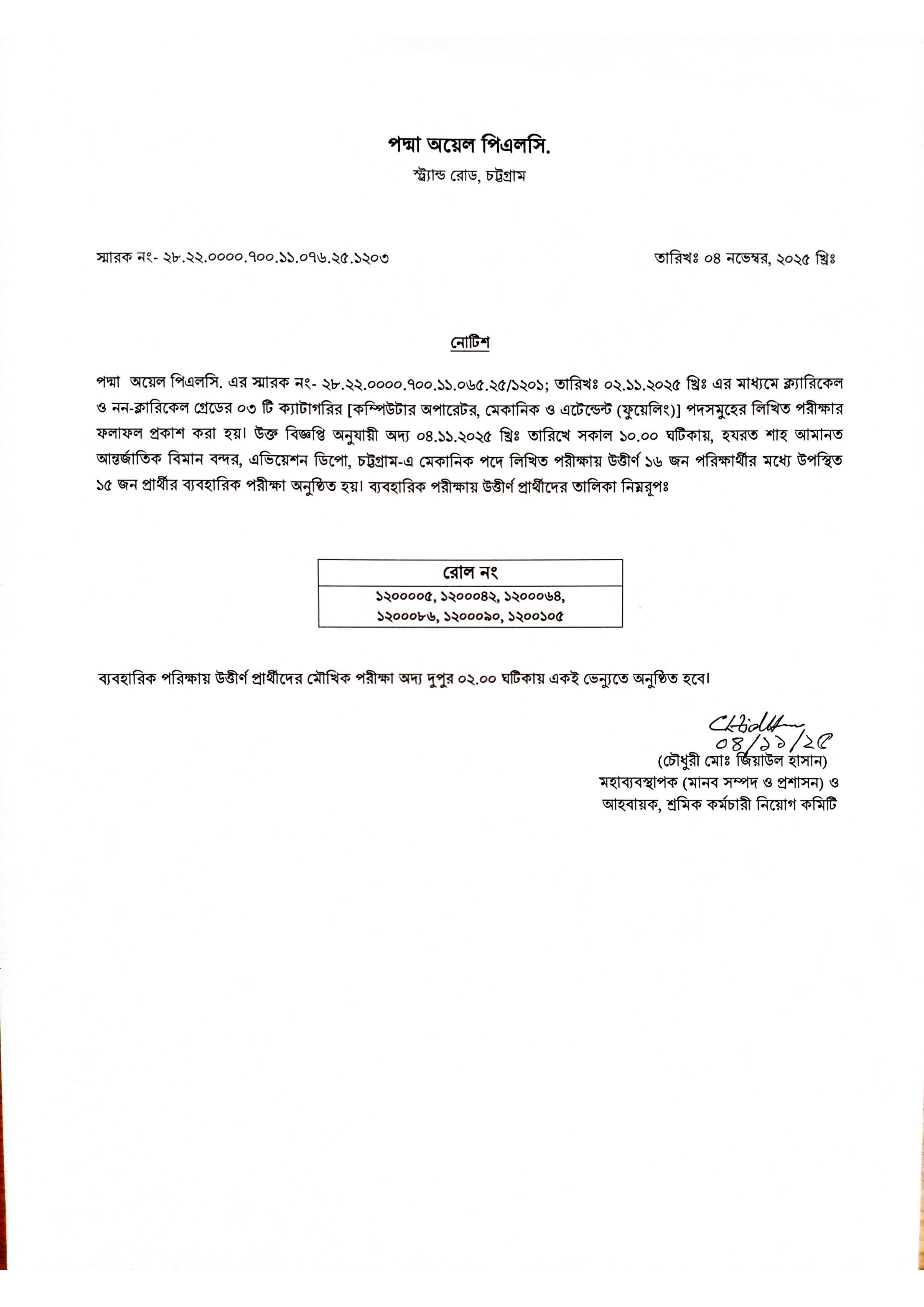 পদ্মা অয়েল পিএলসি. সম্প্রতি ক্ল্যারিকেল ও নন-ক্লারিকেল গ্রেডের বিভিন্ন পদের লিখিত পরীক্ষার ফলাফল প্রকাশ করে। এর ধারাবাহিকতায়, মেকানিক পদের জন্য ব্যবহারিক পরীক্ষা ০৪ নভেম্বর, ২০২৫ খ্রিঃ তারিখে সকাল ১০.০০ ঘটিকায় অনুষ্ঠিত হয়েছে।