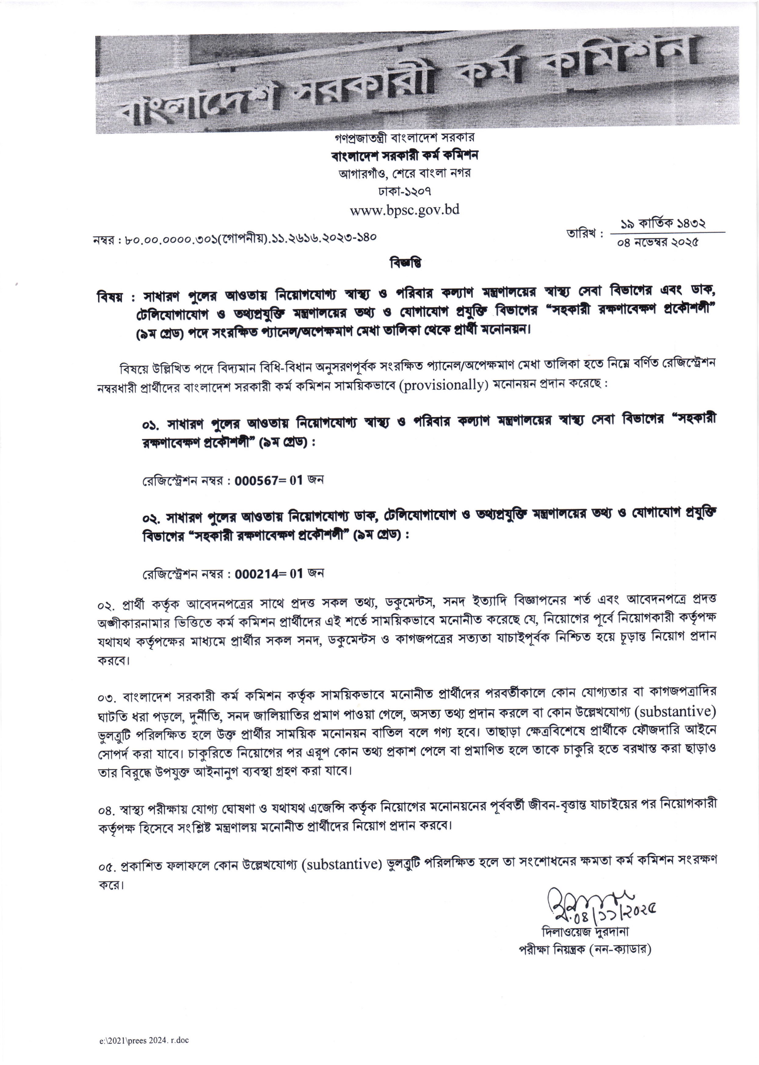 এ পদে মোট ০২ (দুই) জন প্রার্থীকে সাময়িকভাবে মনোনয়ন দেওয়া হয়েছে। এর মধ্যে স্বাস্থ্য ও পরিবার কল্যাণ মন্ত্রণালয়ের স্বাস্থ্য সেবা বিভাগের জন্য ০১ জন এবং ডাক, টেলিযোগাযোগ ও তথ্যপ্রযুক্তি মন্ত্রণালয়ের তথ্য ও যোগাযোগ প্রযুক্তি বিভাগের জন্য ০১ জন প্রার্থী রয়েছেন।