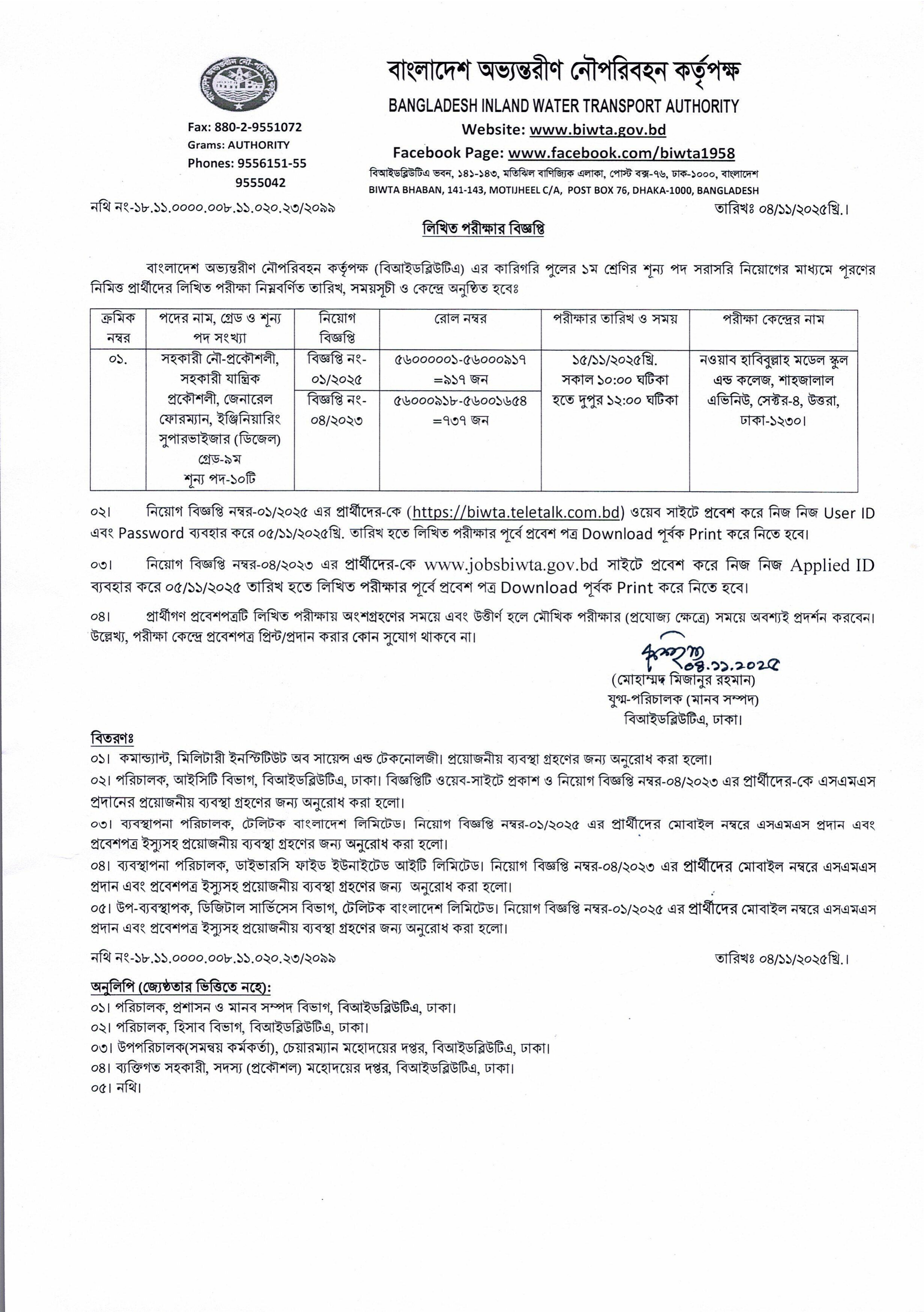 বাংলাদেশ অভ্যন্তরীণ নৌপরিবহন কর্তৃপক্ষ (বিআইডব্লিউটিএ) এর কারিগরি পুলের ১ম শ্রেণির শূন্য পদ পূরণের লক্ষ্যে প্রার্থীদের লিখিত পরীক্ষার বিজ্ঞপ্তি প্রকাশ করেছে।