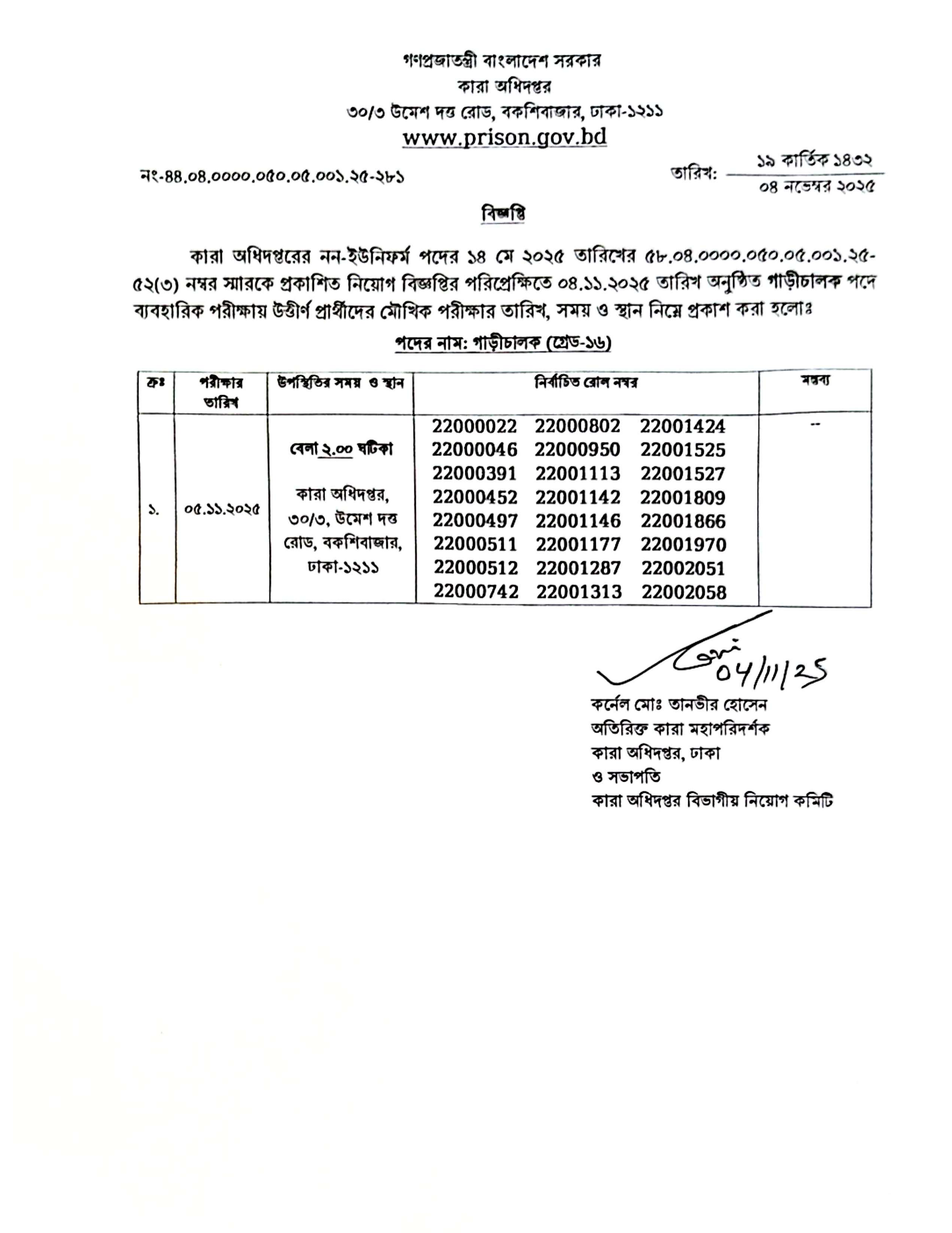 গণপ্রজাতন্ত্রী বাংলাদেশ সরকারের কারা অধিদপ্তরের অধীনে গাড়ীচালক পদের ব্যবহারিক পরীক্ষায় উত্তীর্ণ প্রার্থীদের মৌখিক পরীক্ষার তারিখ ঘোষণা করা হয়েছে।