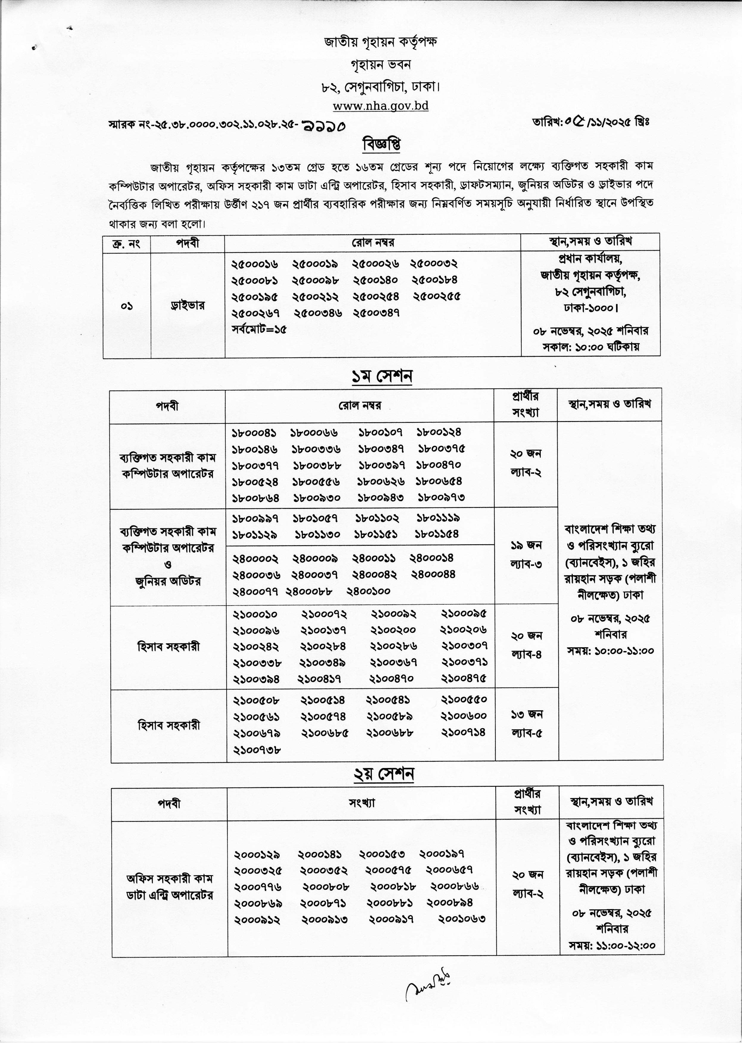 জাতীয় গৃহায়ন কর্তৃপক্ষ কর্তৃক ১৩তম গ্রেড হতে ১৬তম গ্রেডের শূন্য পদে নিয়োগের লক্ষ্যে বিভিন্ন পদের ব্যবহারিক পরীক্ষার সময়সূচি প্রকাশ করা হয়েছে। নৈর্ব্যত্তিক লিখিত পরীক্ষায় উত্তীর্ণ মোট ২১৭ জন প্রার্থীর এই ব্যবহারিক পরীক্ষা অনুষ্ঠিত হবে।