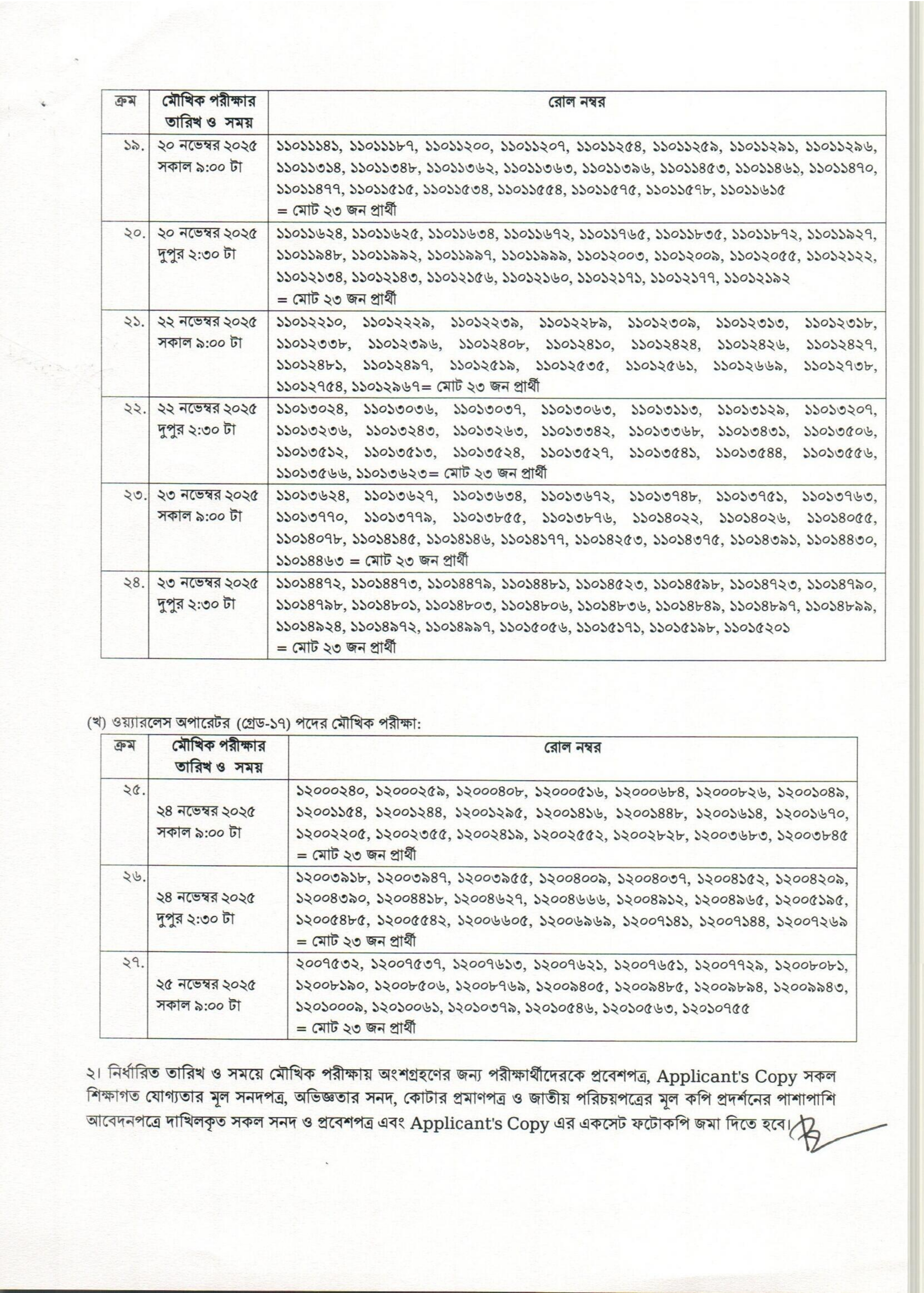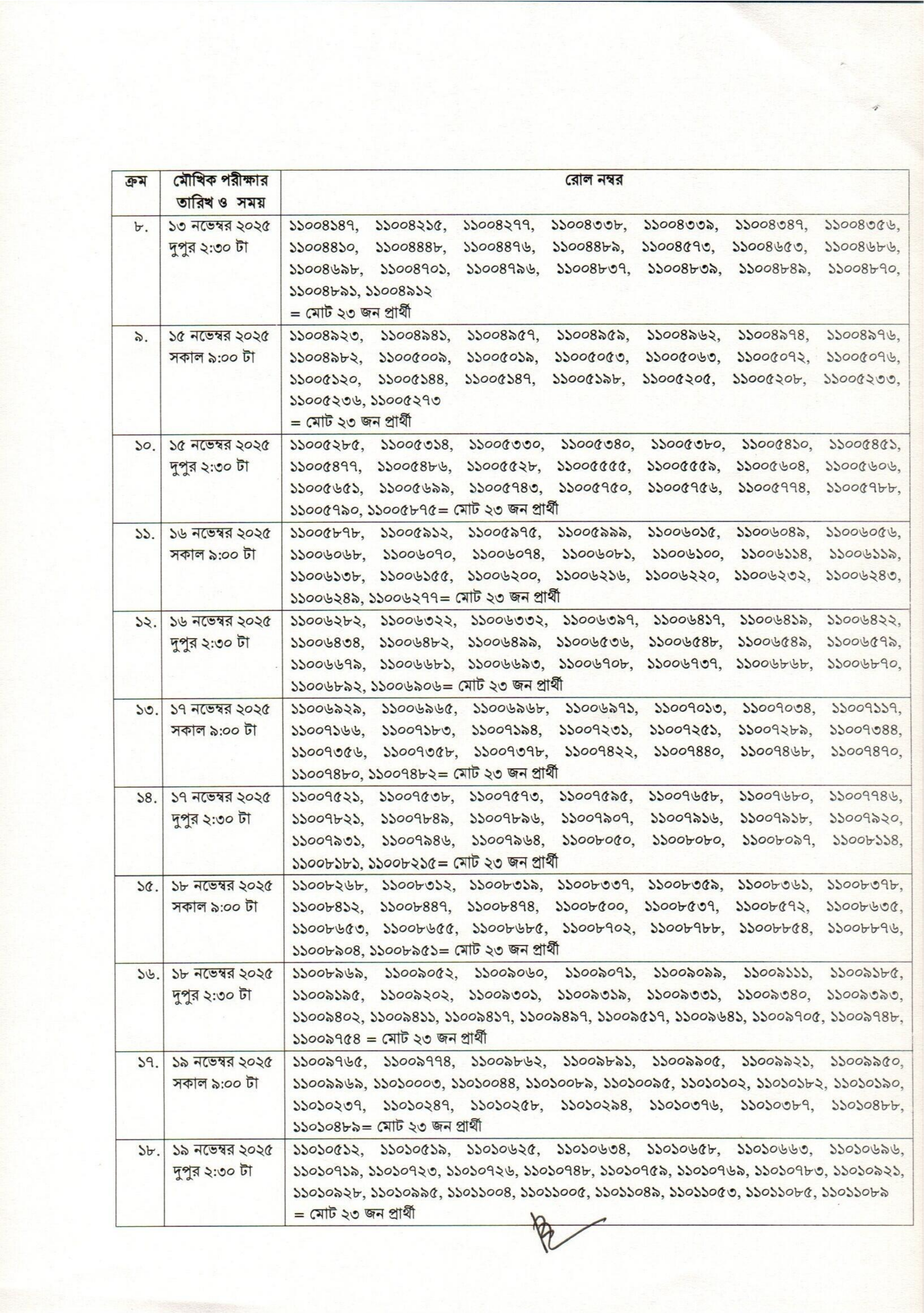 মৌখিক পরীক্ষার তারিখ: ১০ নভেম্বর, ২০২৫ হতে ২৫ নভেম্বর, ২০২৫ পর্যন্ত।