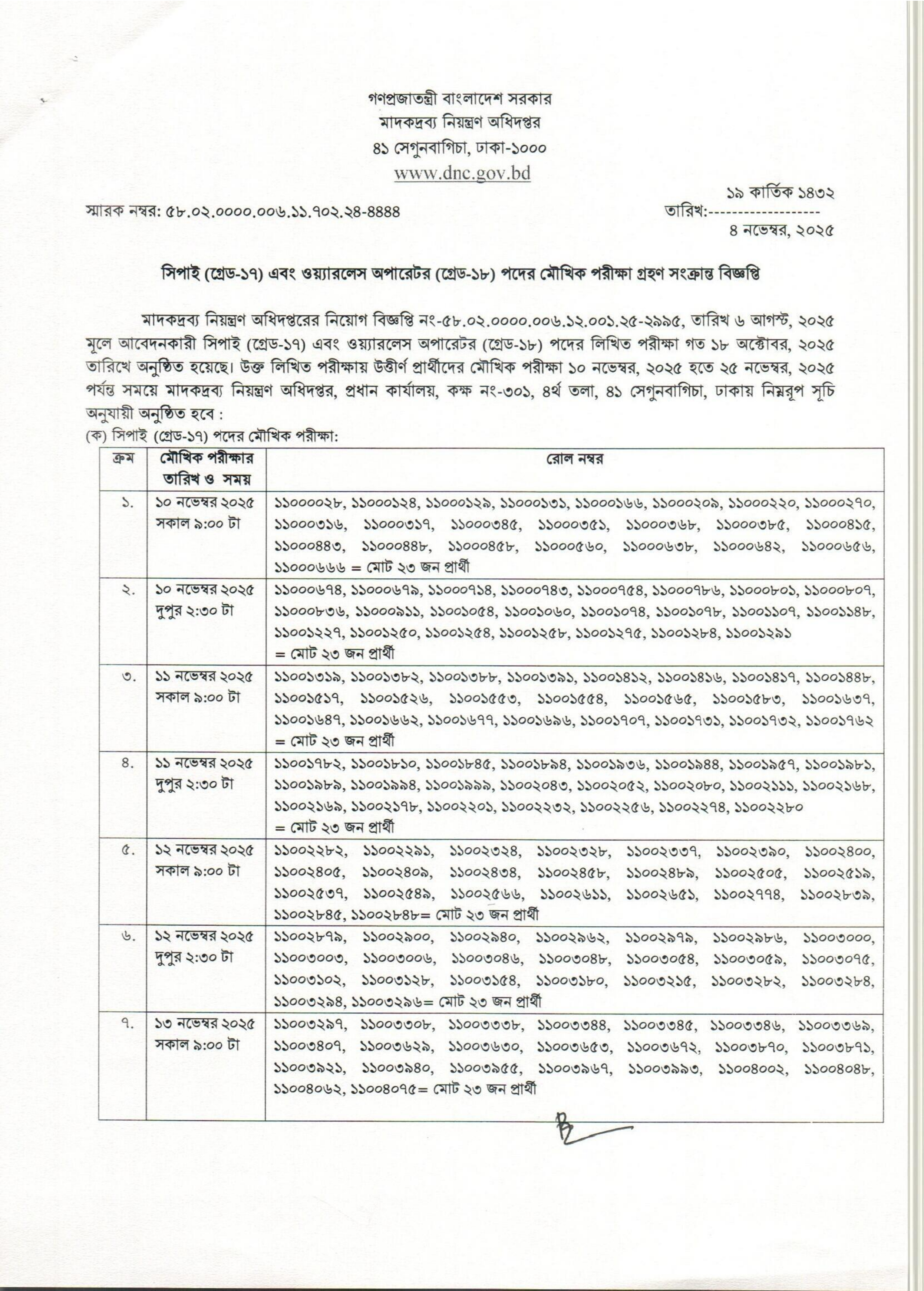 মাদকদ্রব্য নিয়ন্ত্রণ অধিদপ্তরের সিপাই (গ্রেড-১৭) এবং ওয়্যারলেস অপারেটর (গ্রেড-১৮) পদের লিখিত পরীক্ষায় উত্তীর্ণ প্রার্থীদের মৌখিক পরীক্ষার সময়সূচি প্রকাশিত হয়েছে।