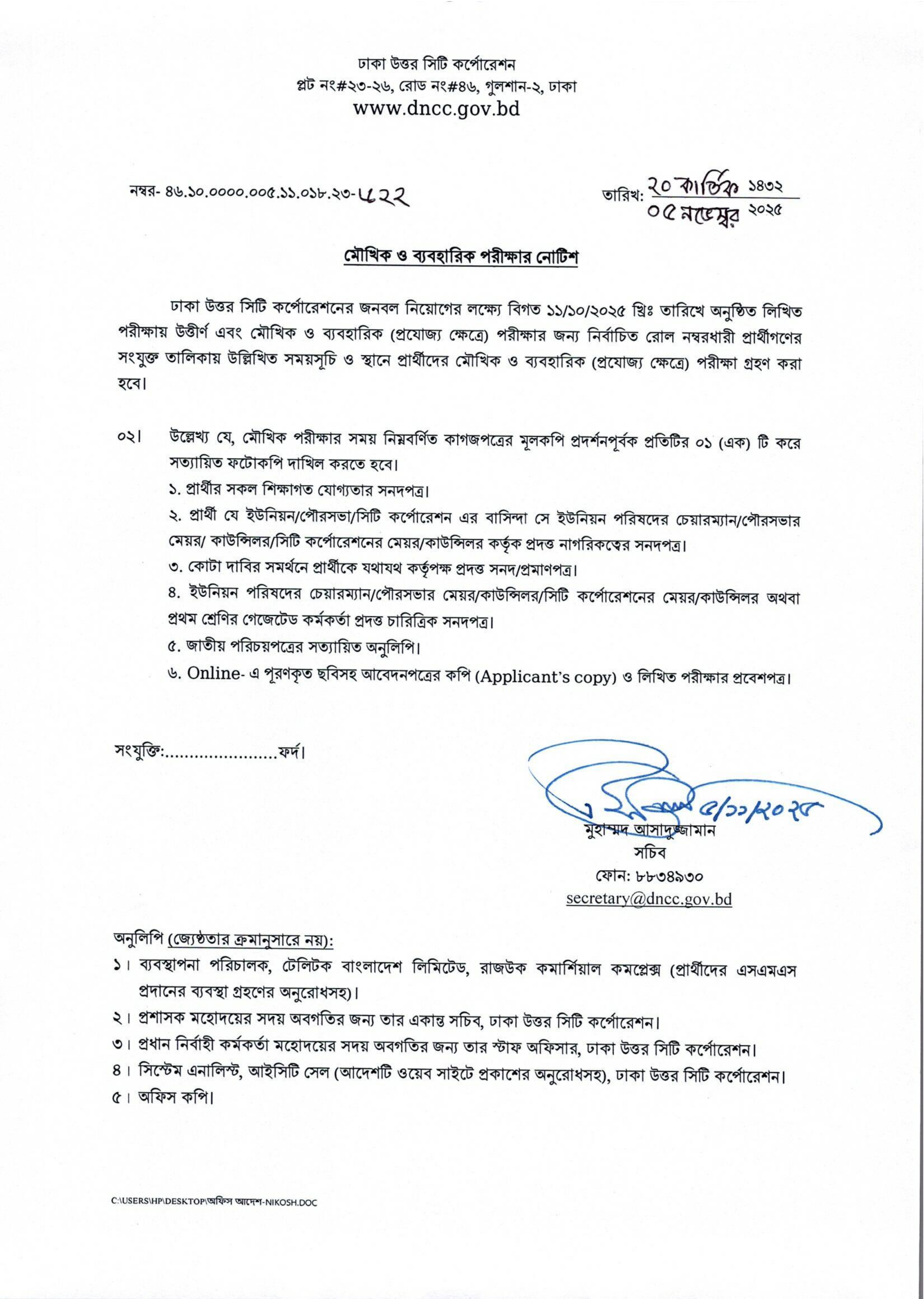 ঢাকা উত্তর সিটি কর্পোরেশনের জনবল নিয়োগের লক্ষ্যে ১১/১০/২০২৫ খ্রিঃ তারিখে অনুষ্ঠিত লিখিত পরীক্ষার ফলাফল প্রকাশিত হয়েছে।