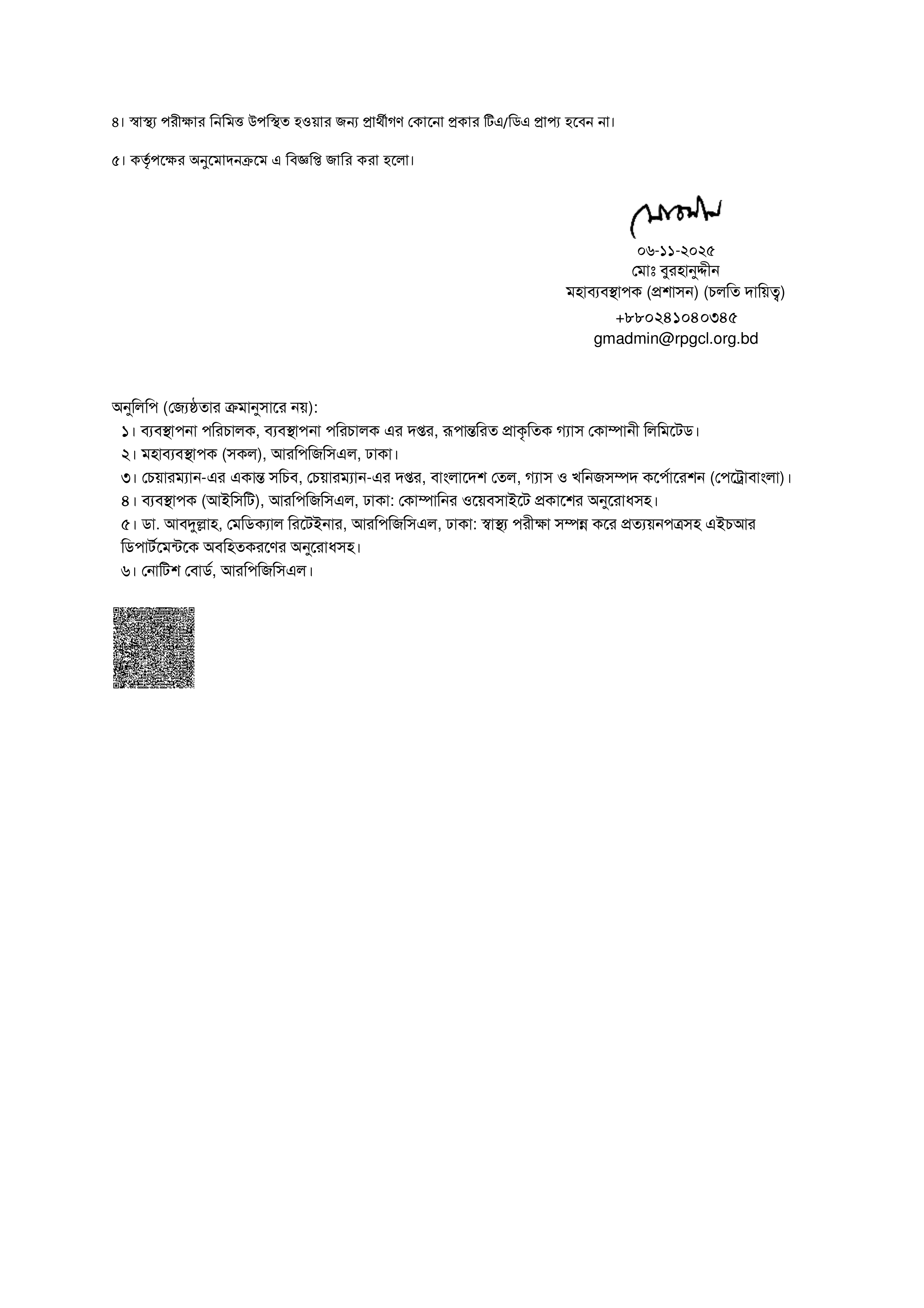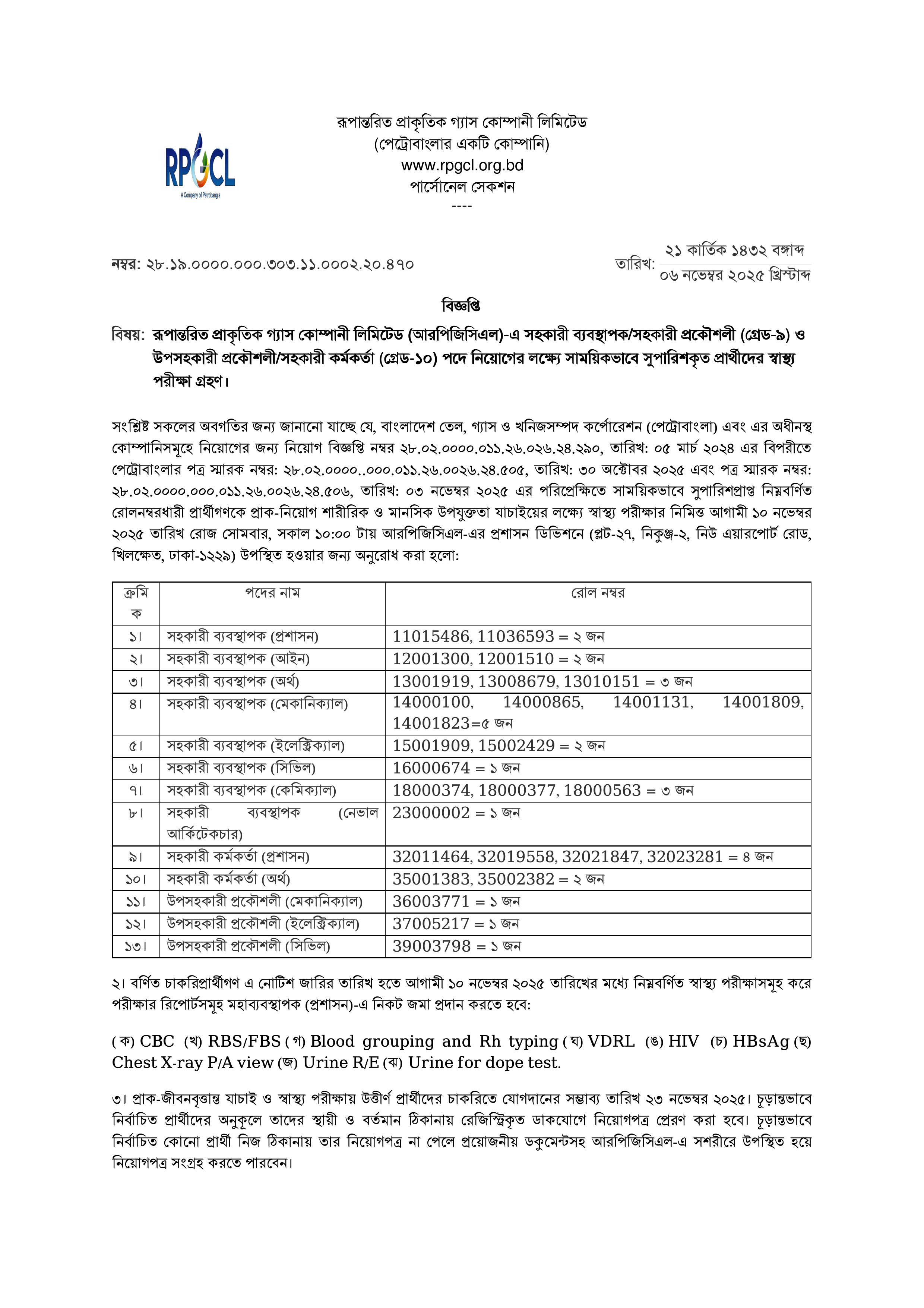 রূপান্তরিত প্রাকৃতিক গ্যাস কোম্পানী লিমিটেড (আরপিজিসিএল)-এ সহকারী ব্যবস্থাপক/সহকারী প্রকৌশলী (গ্রেড-৯) ও উপসহকারী প্রকৌশলী/সহকারী কর্মকর্তা (গ্রেড-১০) পদে নিয়োগের লক্ষ্যে সাময়িকভাবে সুপারিশকৃত প্রার্থীদের স্বাস্থ্য পরীক্ষা গ্রহণ সংক্রান্ত বিজ্ঞপ্তি প্রকাশ করা হয়েছে।