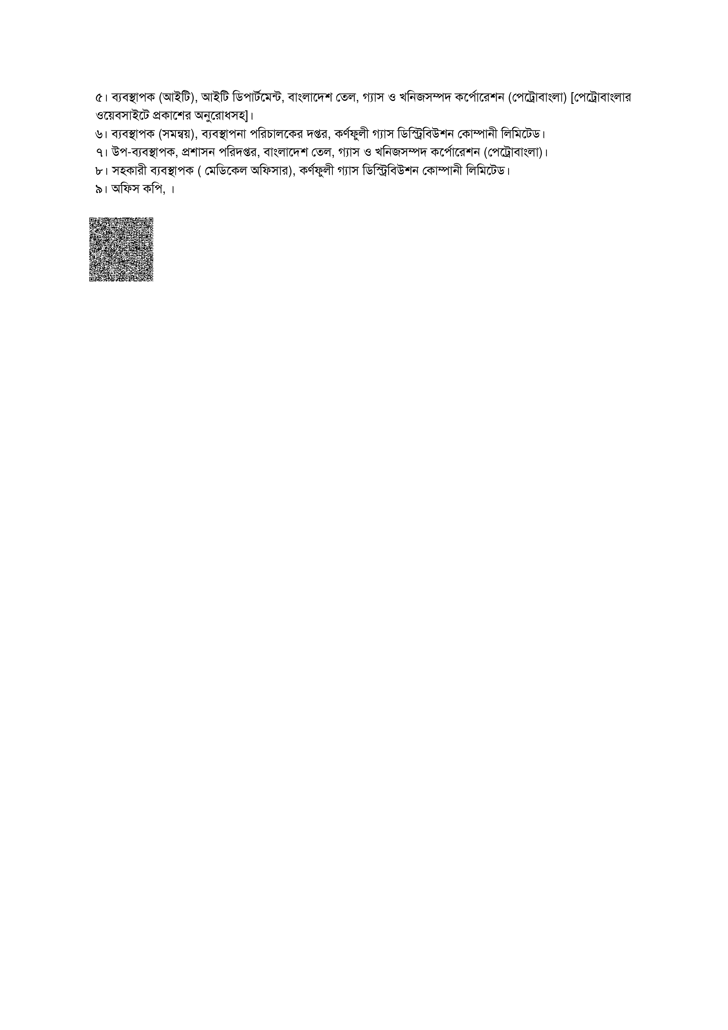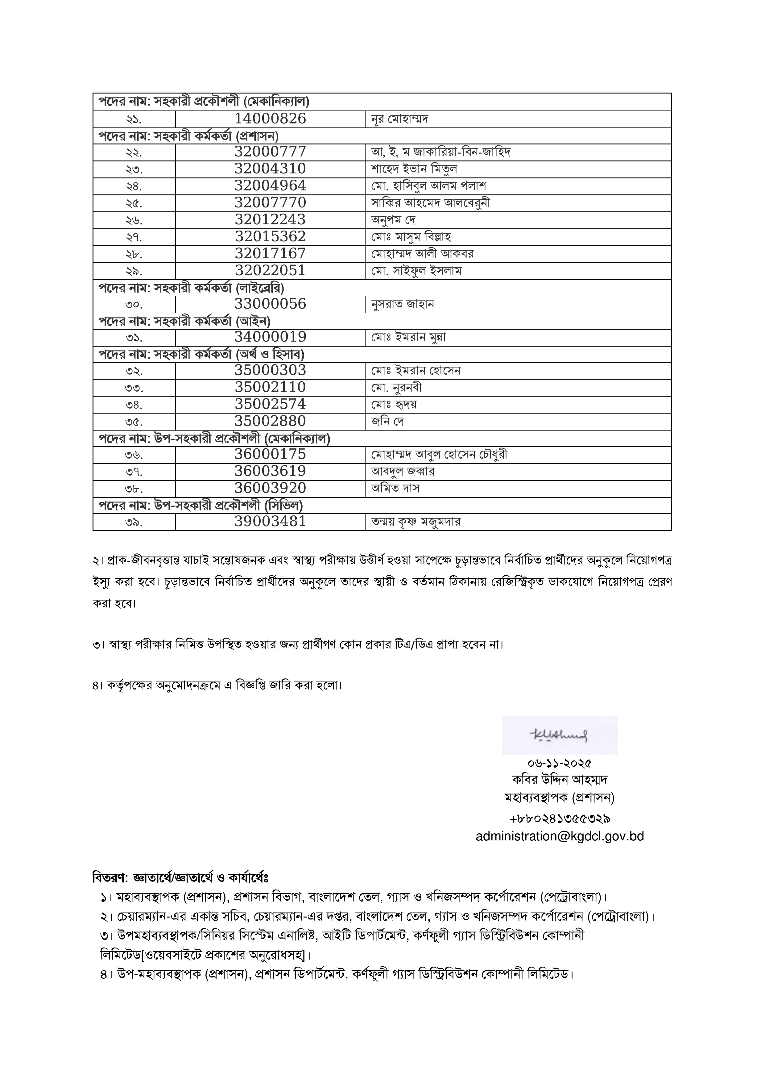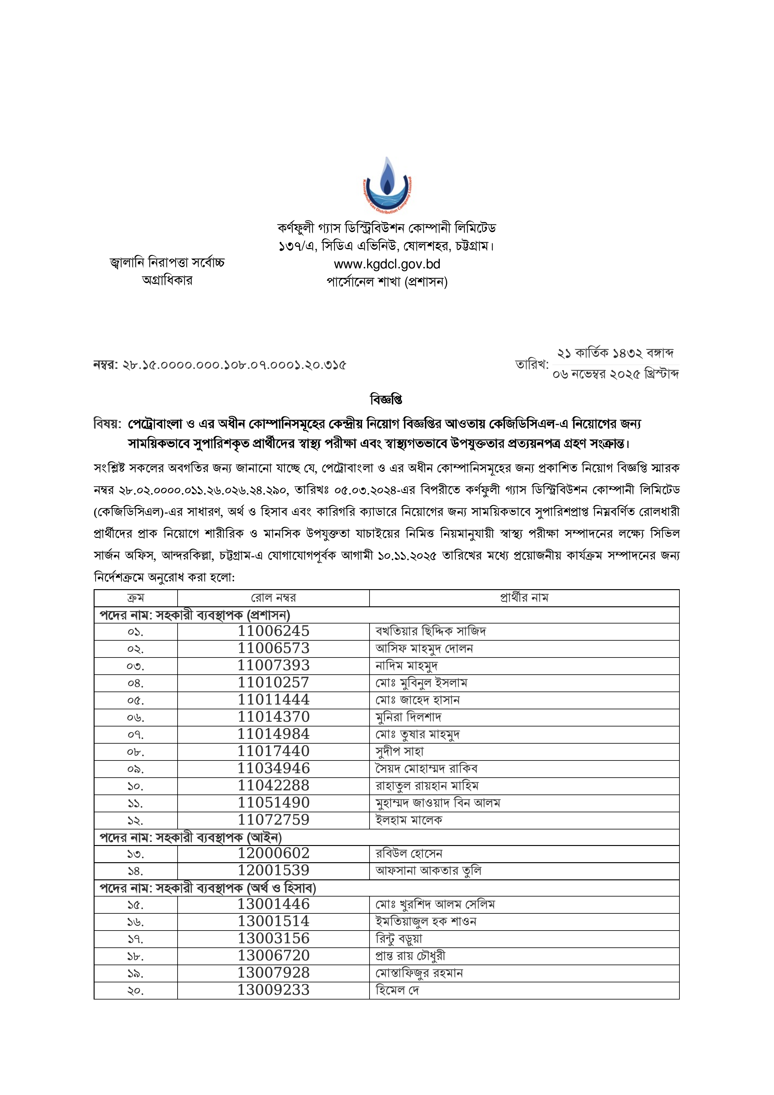 কর্ণফুলী গ্যাস ডিস্ট্রিবিউশন কোম্পানী লিমিটেড (কেজিডিসিএল)-এ পেট্রোবাংলা ও এর অধীন কোম্পানিসমূহের কেন্দ্রীয় নিয়োগ বিজ্ঞপ্তির আওতায় সাময়িকভাবে সুপারিশকৃত প্রার্থীদের স্বাস্থ্য পরীক্ষা সংক্রান্ত একটি গুরুত্বপূর্ণ বিজ্ঞপ্তি প্রকাশিত হয়েছে।