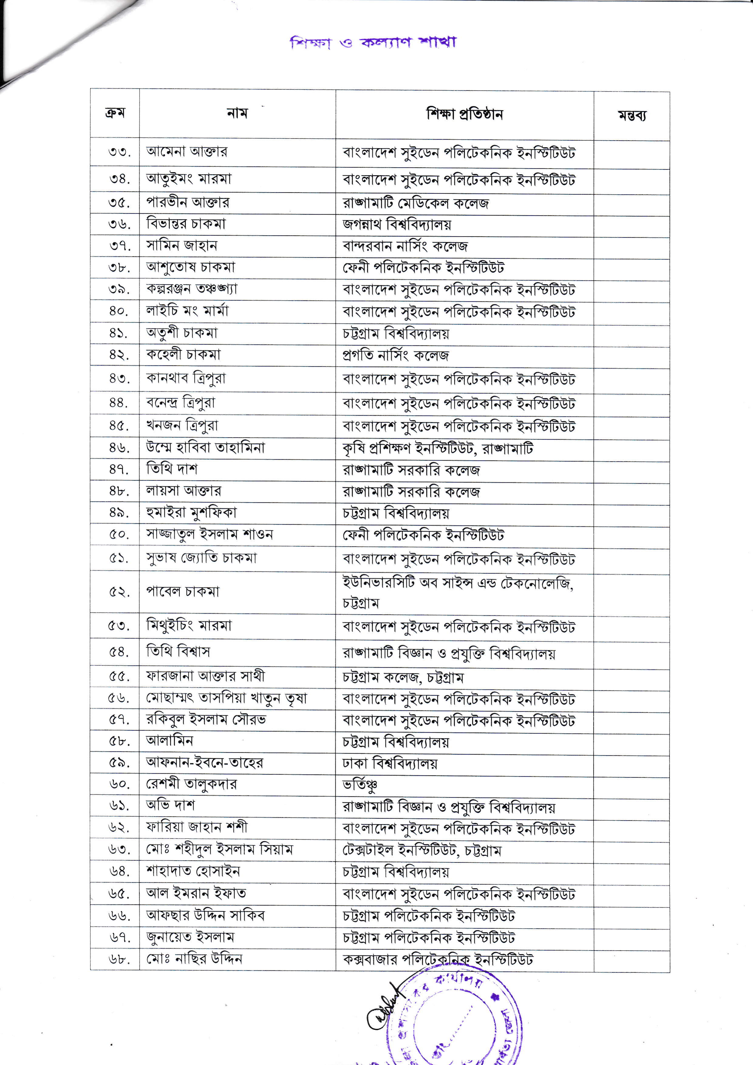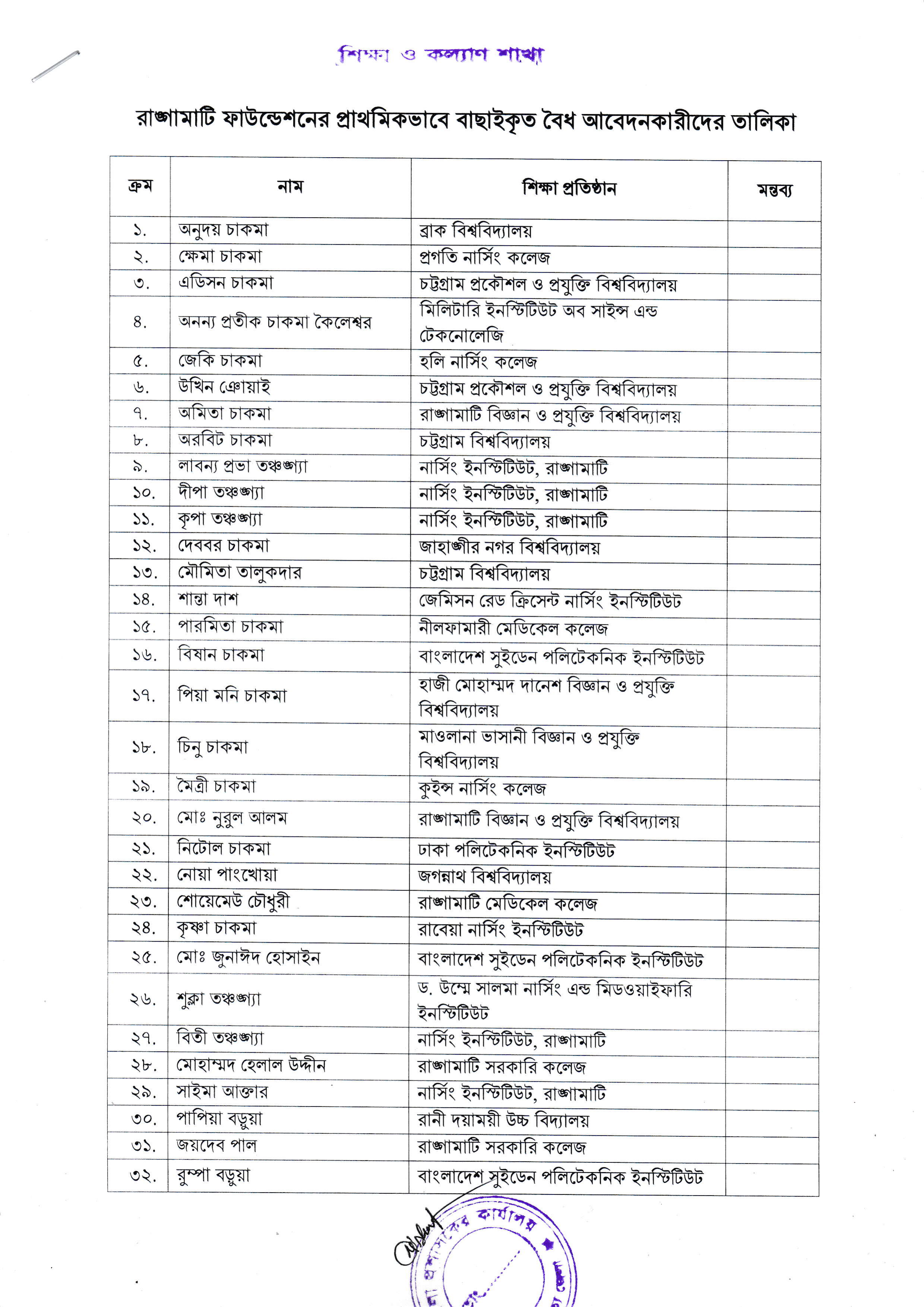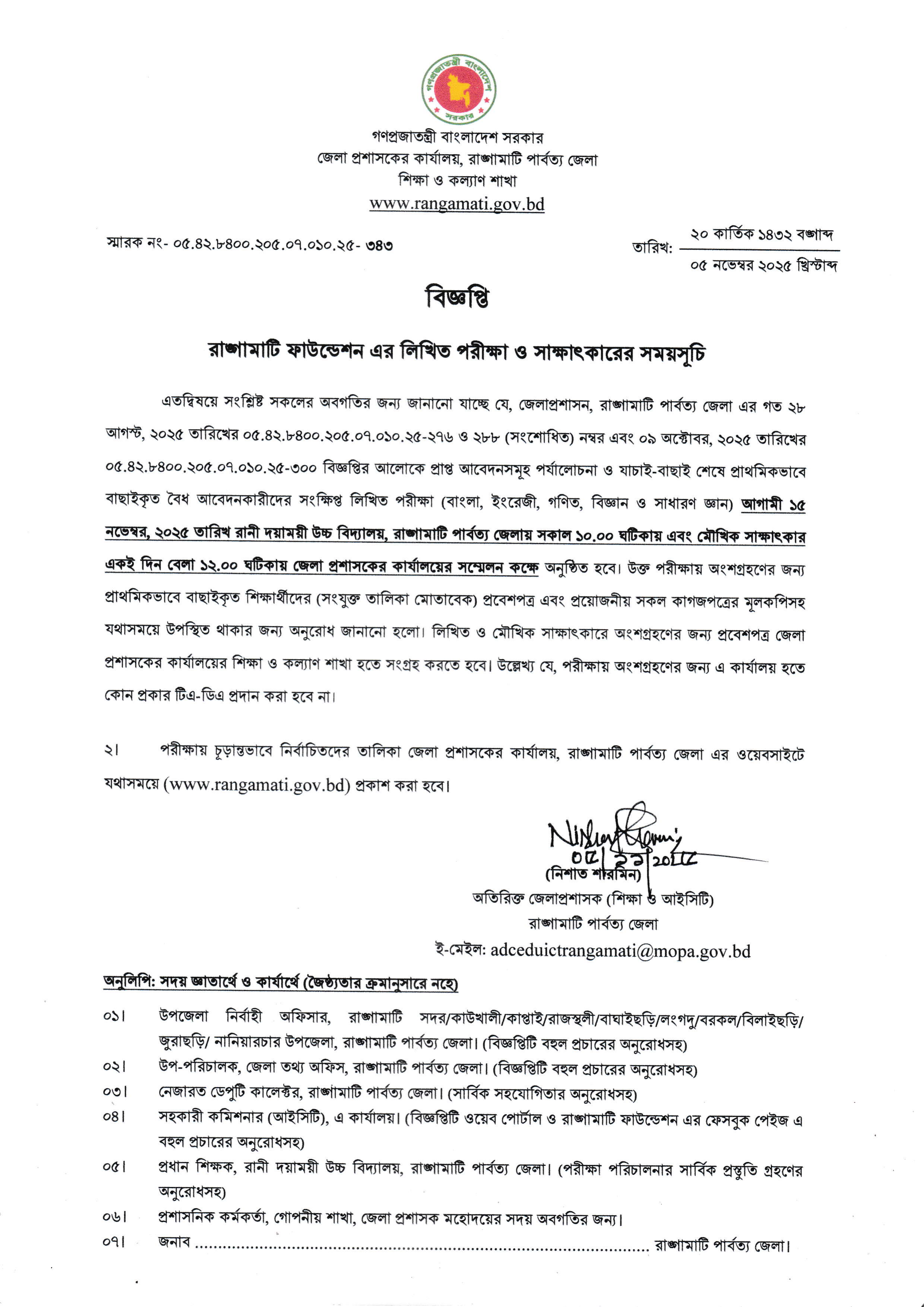 জেলাপ্রশাসন, রাঙ্গামাটি পার্বত্য জেলা কর্তৃক রাঙামাটি ফাউন্ডেশনের প্রাথমিকভাবে বাছাইকৃত আবেদনকারীদের লিখিত পরীক্ষা ও মৌখিক সাক্ষাৎকারের সময়সূচি প্রকাশ করা হয়েছে। নিচে উল্লেখিত সময়সূচি অনুযায়ী নির্বাচিত প্রার্থীরা পরীক্ষা ও সাক্ষাৎকারে অংশগ্রহণ করতে পারবেন: