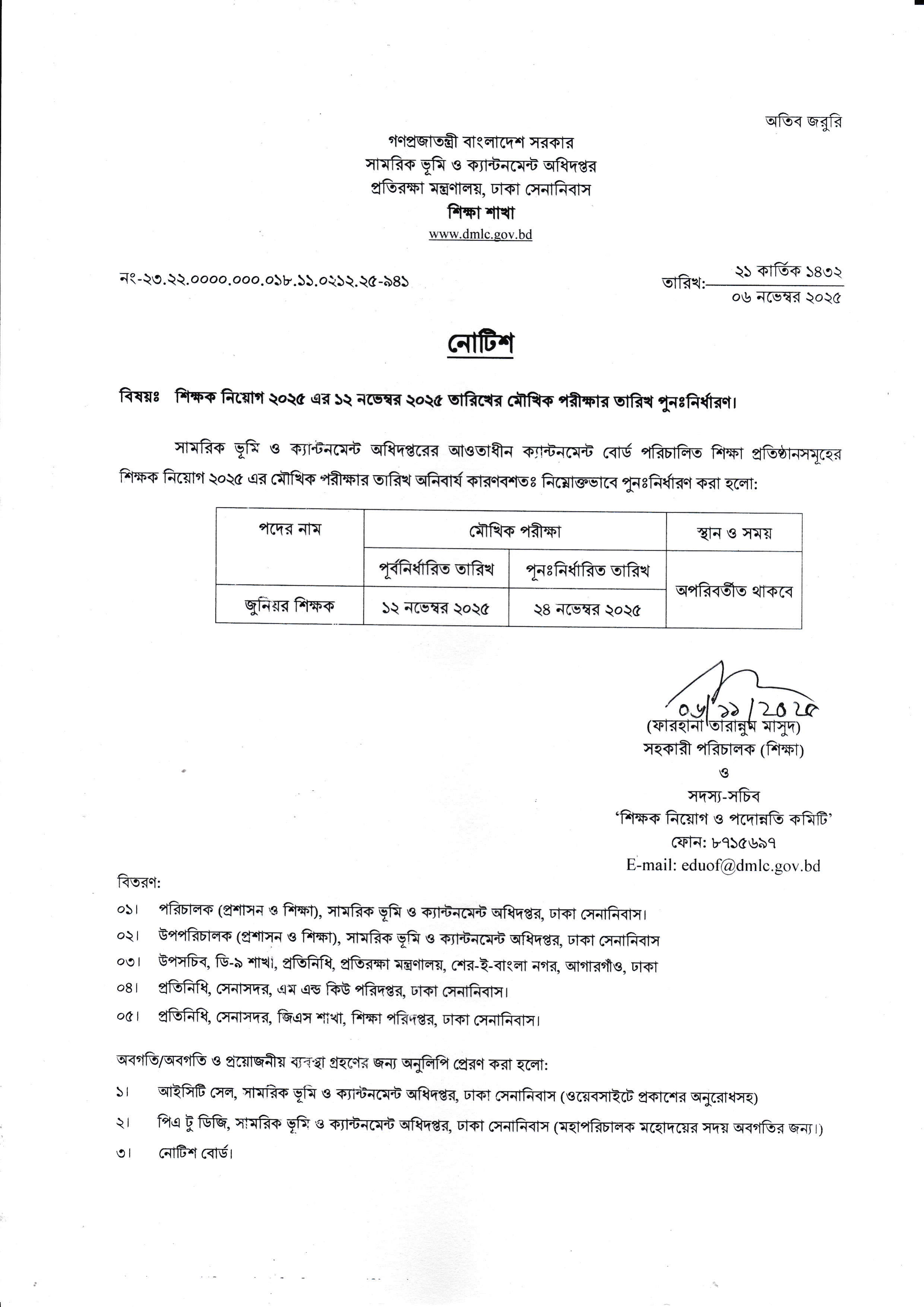 সামরিক ভূমি ও ক্যান্টনমেন্ট অধিদপ্তরের আওতাধীন ক্যান্টনমেন্ট বোর্ড পরিচালিত শিক্ষা প্রতিষ্ঠানসমূহের শিক্ষক নিয়োগ ২০২৫ এর মৌখিক পরীক্ষার তারিখ পুনঃনির্ধারণ করা হয়েছে।
